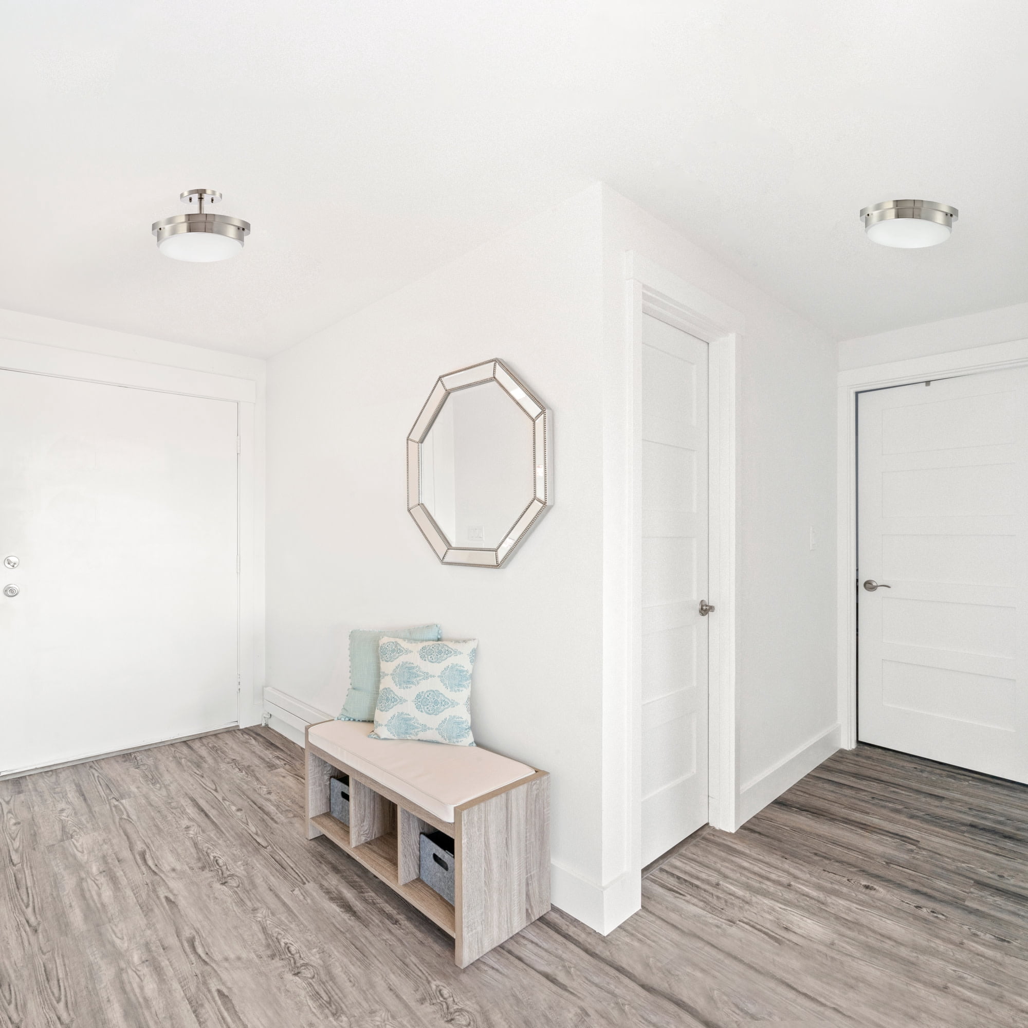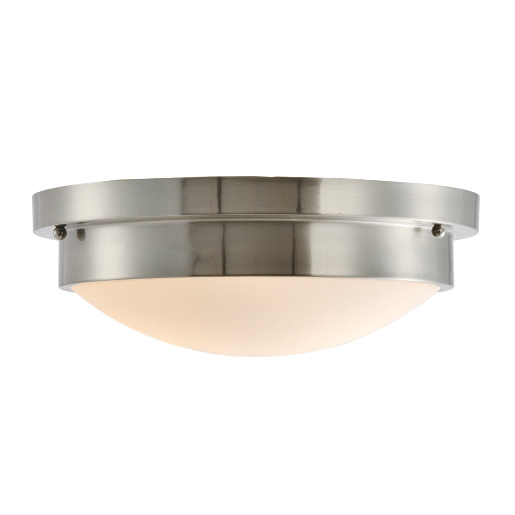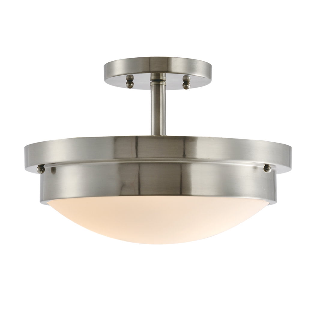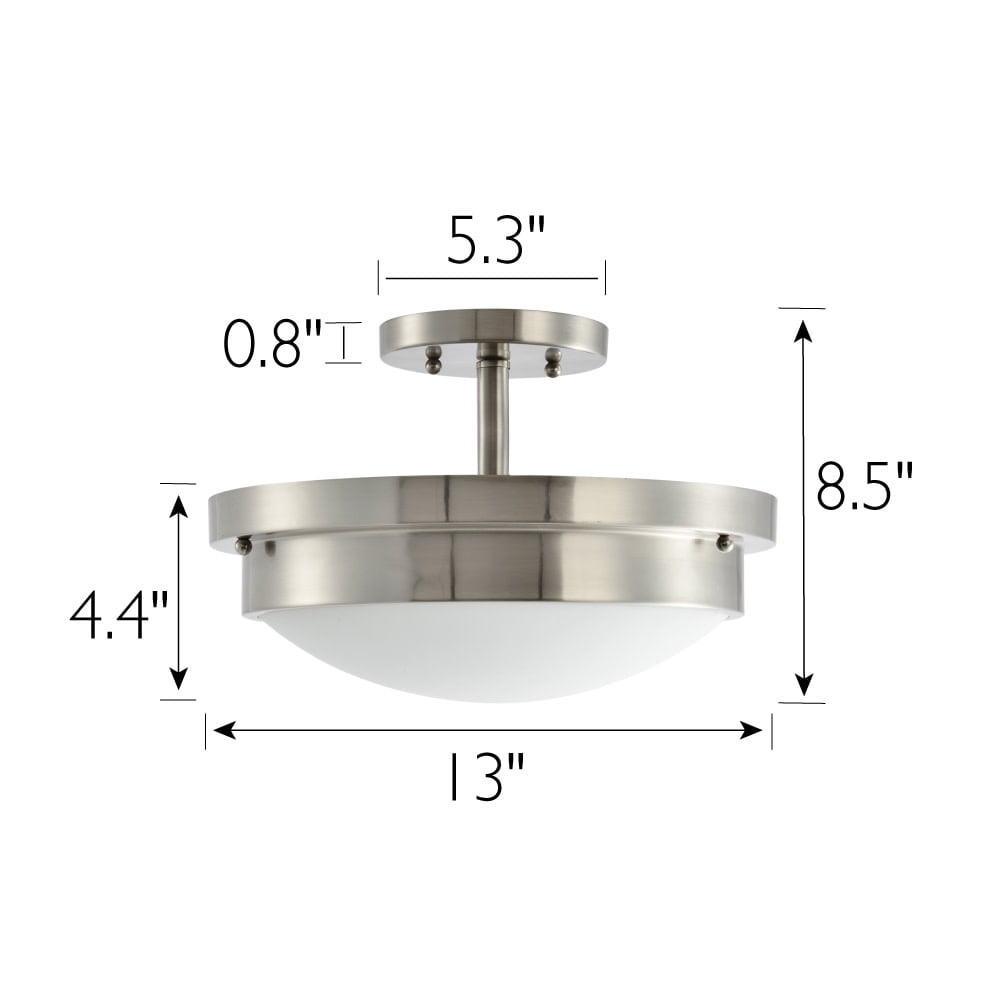 IDEAL FOR kitchens, dining rooms. bedrooms, hallways, closets, and more, this traditional ceiling light has a satin nickel finish and frosted glass shade DIMENSIONS: 8.5 inches H x 13 inches W USES (2) 60 Watt Medium base bulb or LED equivalent (Not included) DIMMABLE: Designed to be dimmable when used with a compatible dimmer switch (not included); allowing you to adjust the preferred light brightness Versatile light with the ability to mount as a semi-flush or flush-mount light This product is cETL/ETL certified for use in dry locations and comes with a 10-year limited warranty This product is cETL/ETL certified for use in dry locations