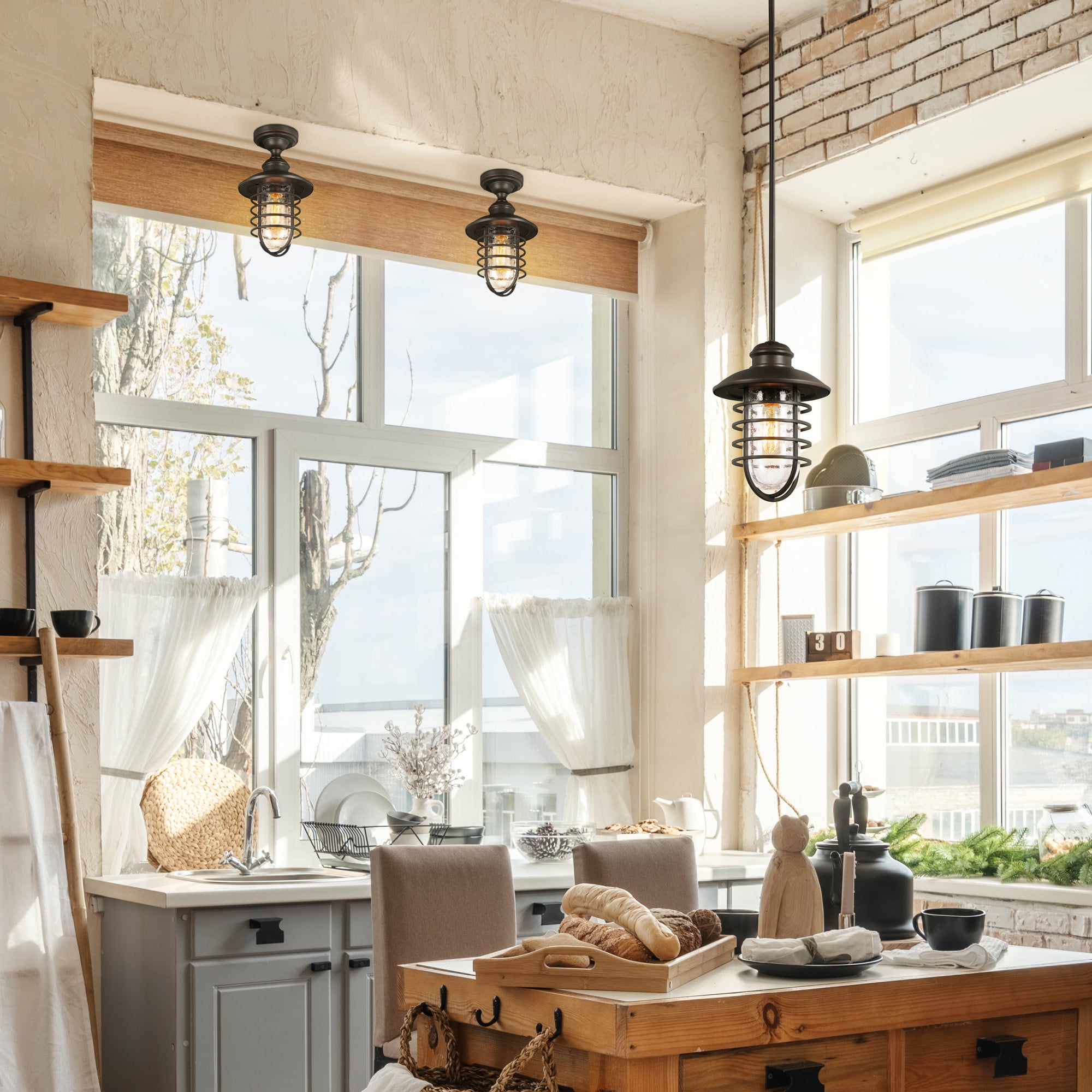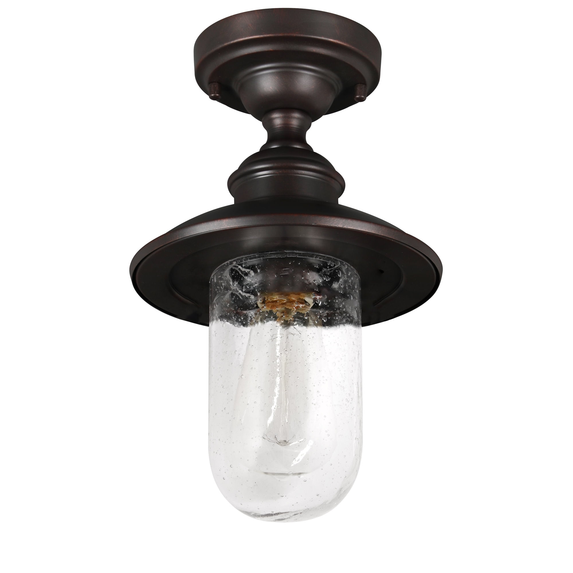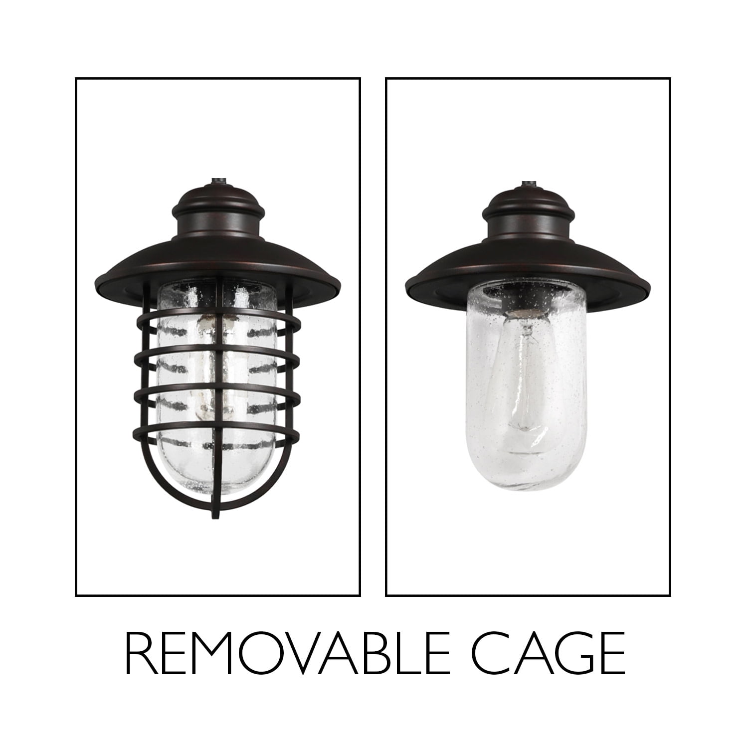 IDEAL FOR kitchens, bedrooms, hallways, entryways, bathrooms and more, this rustic industrial inspired ceiling light has a bronze finish, removeable metal wire cage shade and clear, seedy glass DIMENSIONS: 12.75-inches H x 7.5-inches W x 7.5-inches D Uses (1) 60W standard medium base bulb or LED equivalent (Not included) DIMMABLE: Designed to be dimmable when used with a compatible dimmer switch (not included); allowing you to adjust the preferred light brightness This product is UL certified for use in damp locations and comes with a 10-year limited warranty. Sturdy and Durable: High-quality steel construction for long-lasting use; this product is UL certified for use in damp locations