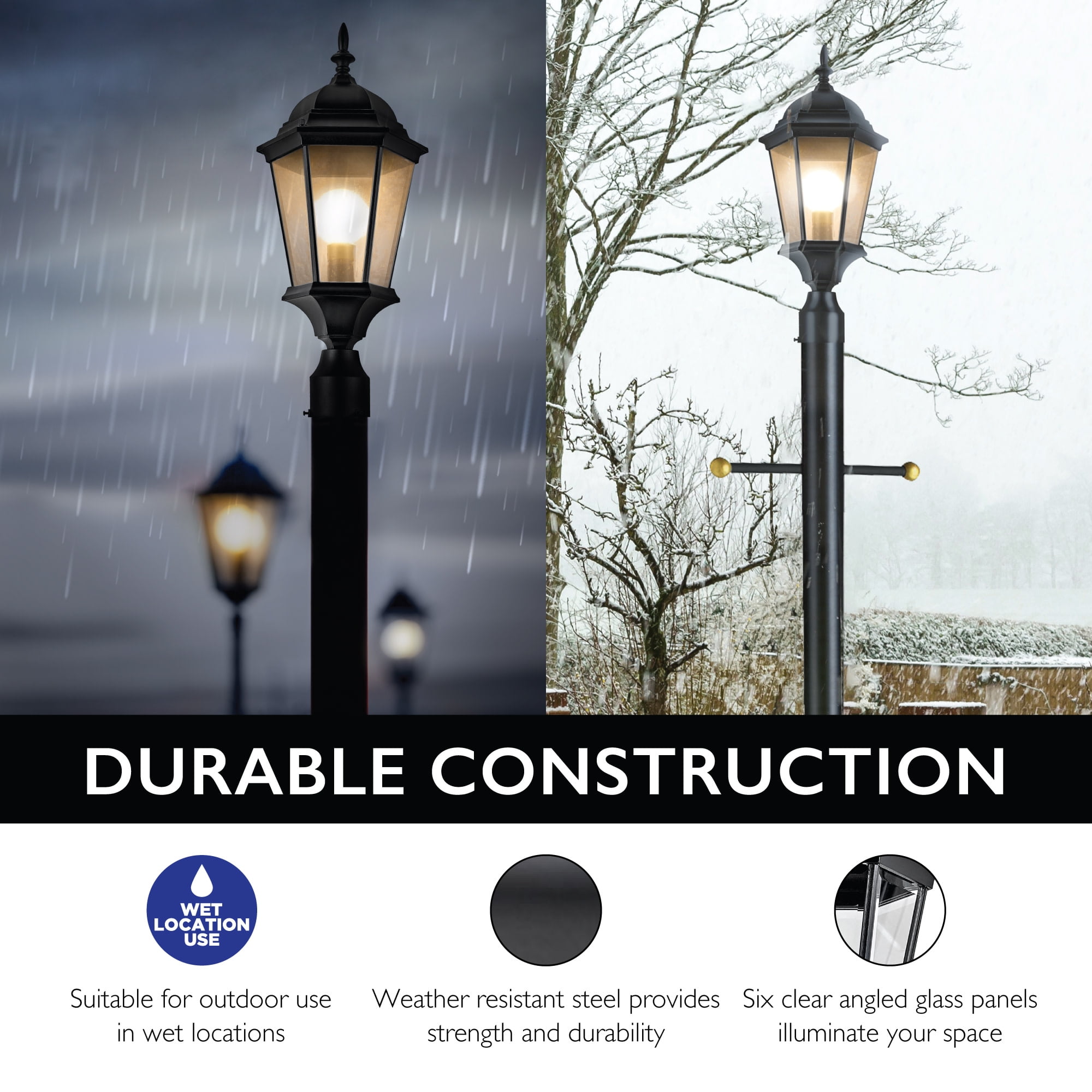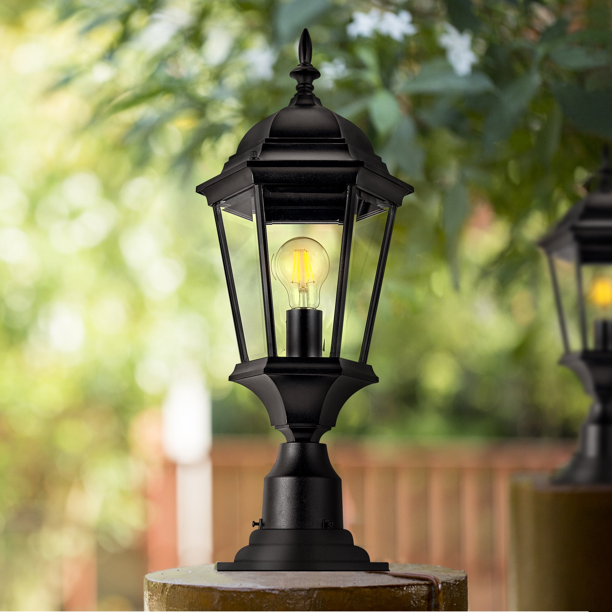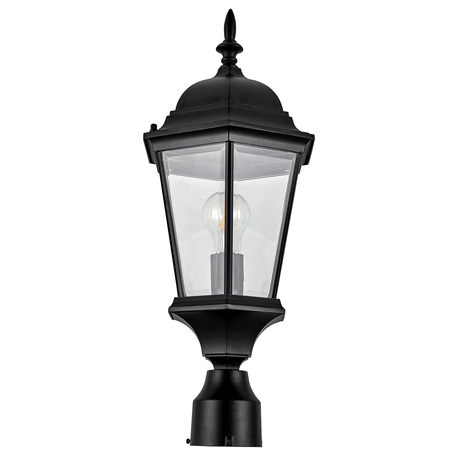 Versatile Outdoor Placement: Ideal for walkways, driveways, porch, yards, patios or any outdoor locations Traditional Light Fixture: Classic and stylish design with six clear beveled glass panels and textured black finish Strong and Durable: Constructed of high quality, weather-resistant aluminum and wet rated for long-lasting use Two Mounting Options: This post top light can be used with a 3-inch lamp post mount (not included) or pier base mount (not included) One Light: Requires one 60-watt E26 medium base bulb or LED equivalent (not included) Suitable for Wet Locations: This product is cUL/UL certified for use in wet locations Buy with Confidence: Customer satisfaction has been our priority for 150 years; with our 10-year limited warranty, you can rest assured your purchase is risk-free This product is cUL/UL certified for use in wet locations. Comes with a 10-year limited warranty that protects against defects in materials and workmanship.