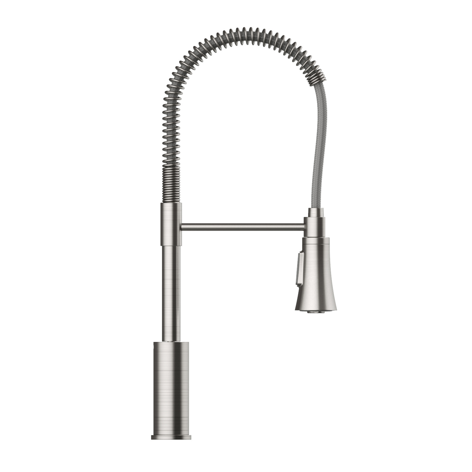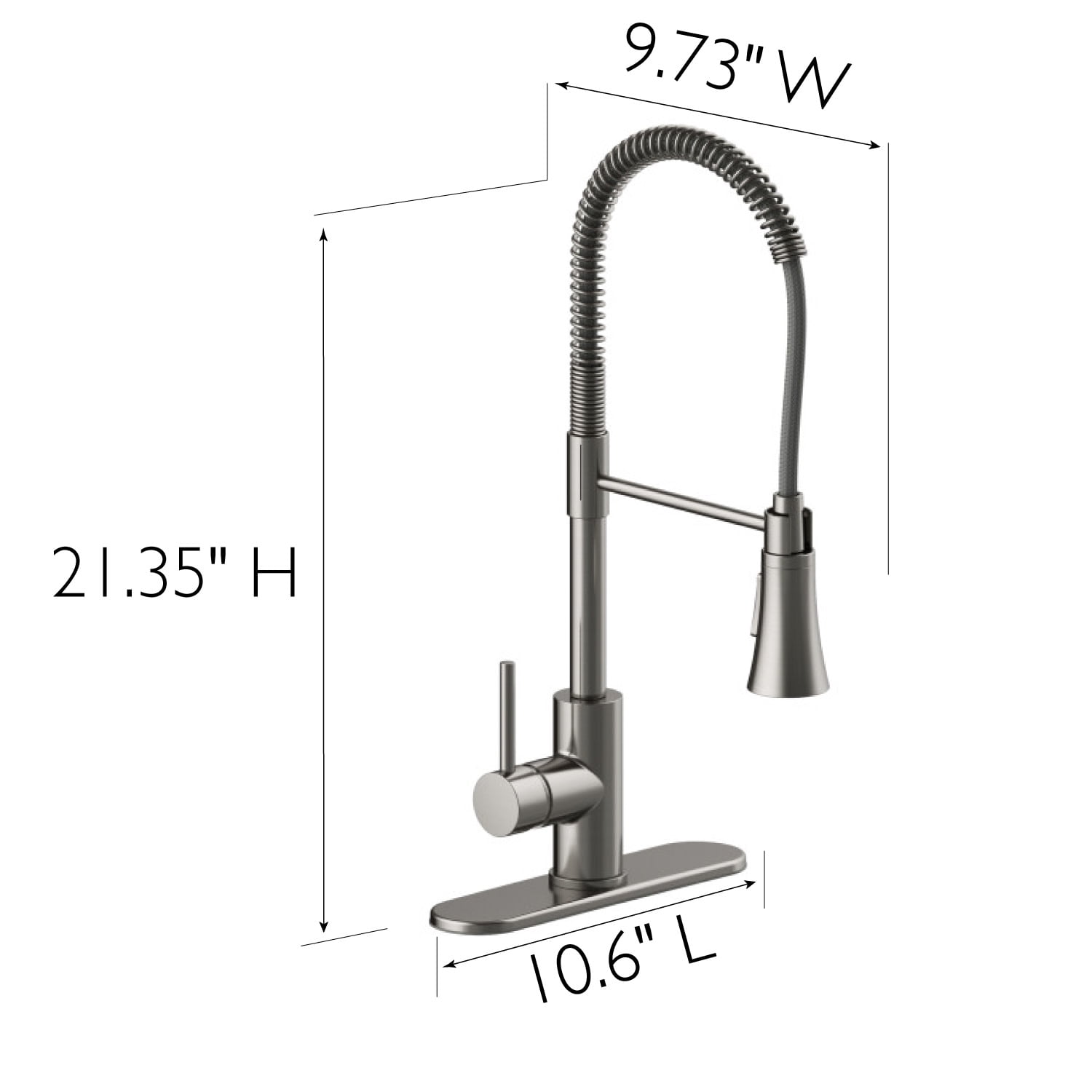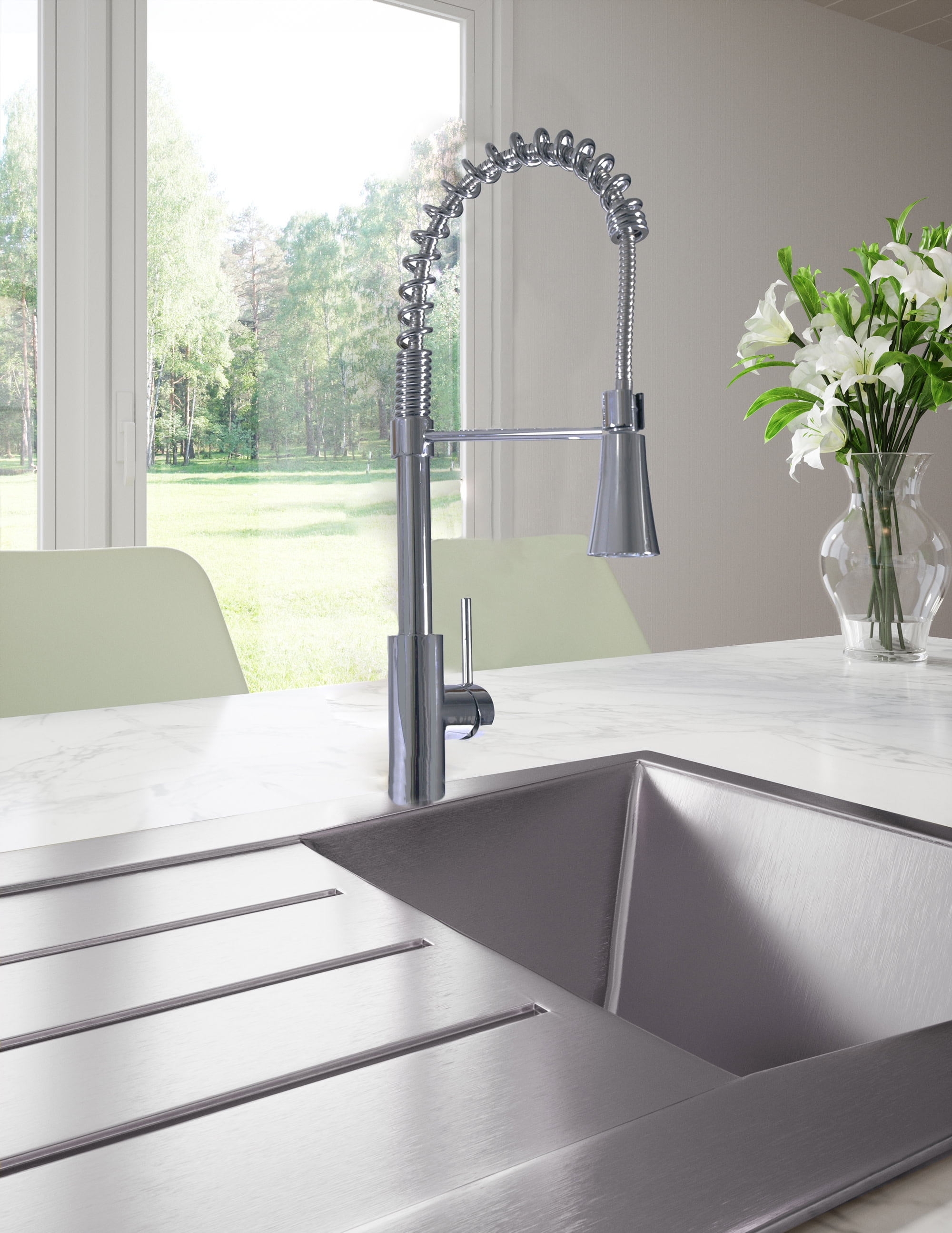 Commercial style kitchen faucet with coiled spring Pull-down, dual function spray head with sweeping spray or steady stream Designed to reach further with a 380-degree spout swivel and stainless steel 8-inch reaching hose Single handle faucet has low flow rate of 1.8 GPM 5-Year limited warranty/Lifetime finish warranty