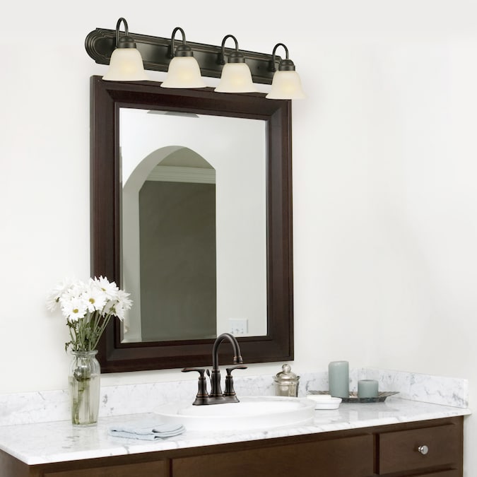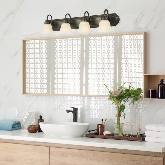 The Design House Allante 4-Light Vanity Light has frosted glass and curved arms that will add elegance to any room. This renovation-friendly vanity light features a large backplate to minimize paint touchups and drywall repair when replacing an existing vanity light. Constructed of formed steel with an oil rubbed bronze finish, this 4-light wall light adds style to your home. Measuring 8-inches (H) by 30-inches (W), the vanity light works great above a bathroom mirror or vanity. This fixture uses four 60-watt medium base bulbs or LED equivalent. Designed and manufactured by Design House, the trusted source for quality lighting, hardware, plumbing, kitchen, and bath products for every taste and budget.