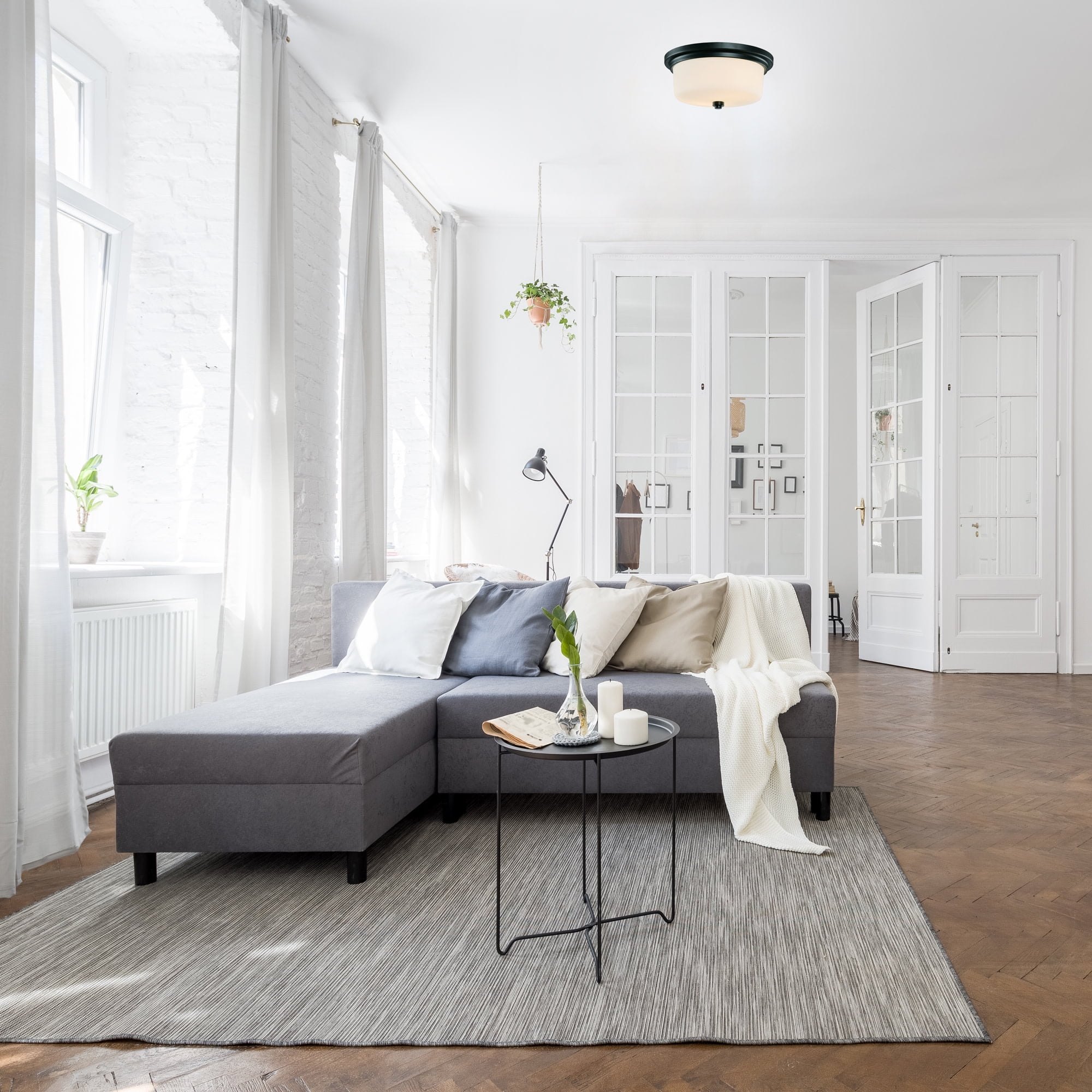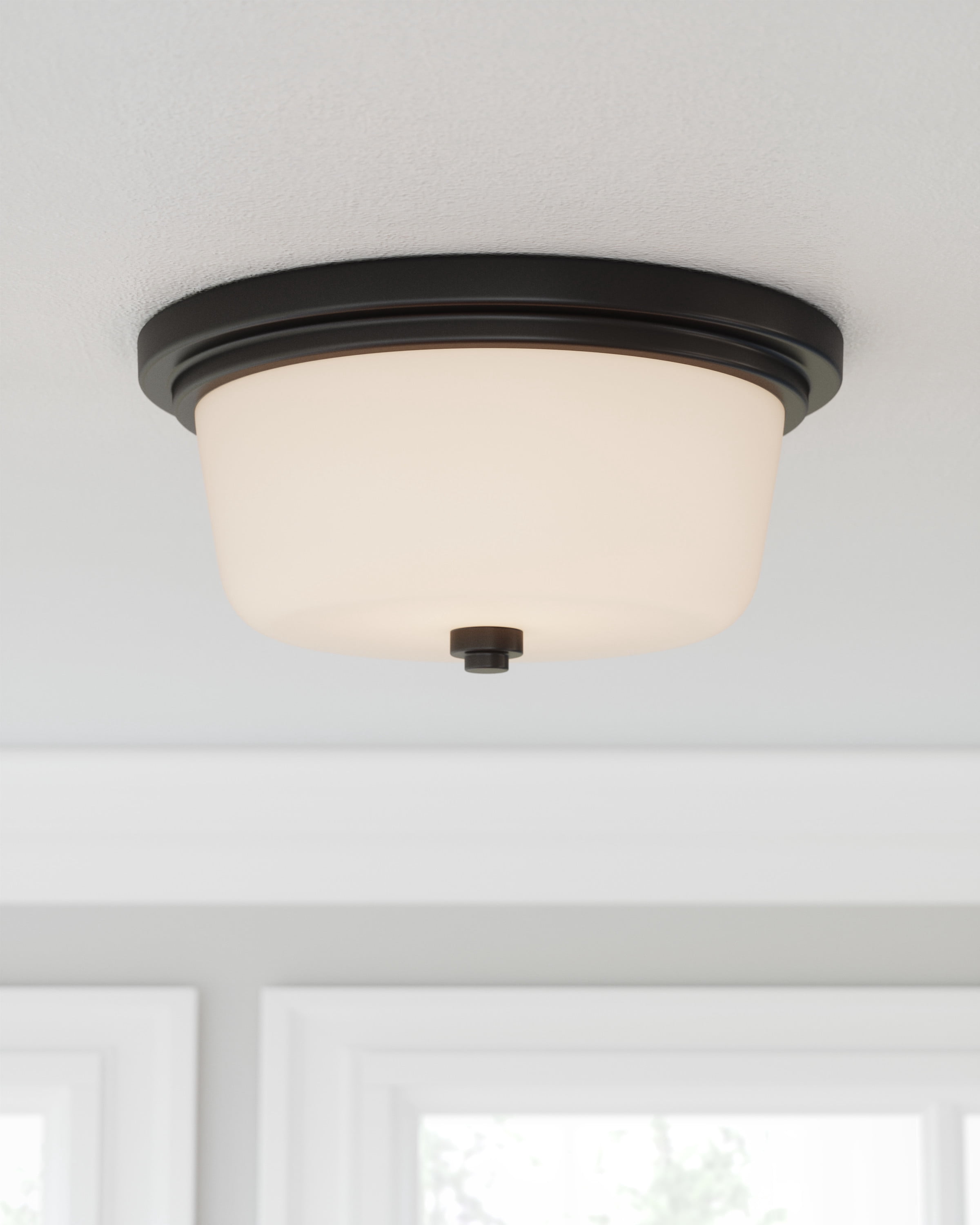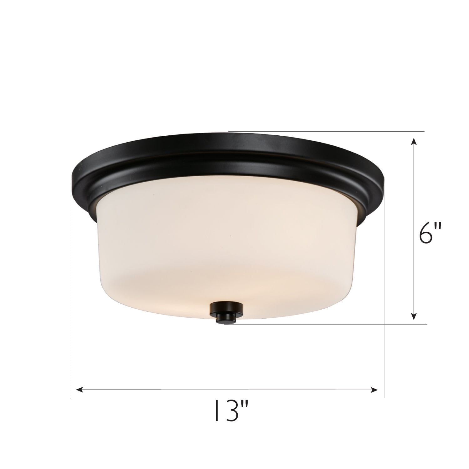 IDEAL FOR kitchens, bedrooms, hallways, dining rooms, foyers, cafes, and more, this traditional ceiling light has a modern matte black finish with a round frosted white glass shade DIMENSIONS: 6 in. H x 13 in. W Uses (2) 60 Watt Medium base bulbs or LED equivalent (Not included) DIMMABLE: Designed to be dimmable when used with a compatible dimmer switch (not included); allowing you to adjust the preferred light brightness cETL/ETL listed for use in dry locations 10-Year limited warranty