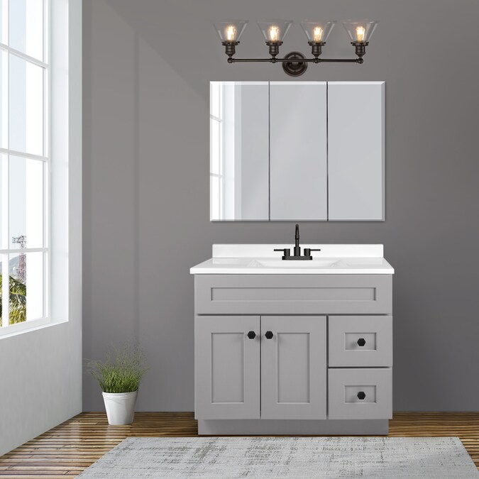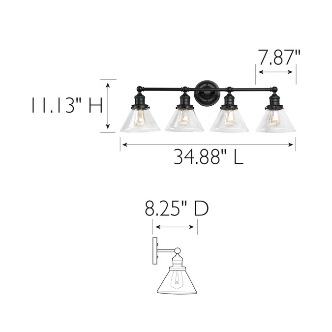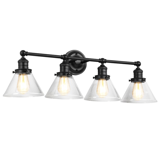 The Design House 589044-BLK Augustin 4-light bathroom vanity light features a transitional design with its matte black finish and cone-shaped seedy glass shades. The seedy glass conceals smudges, dirt, and fingerprints while capturing a brilliant glow of light. Pair this light with an Edison style light bulb to compliment the design aesthetic. This light is rated for 120-vlts and uses (4) 60 watt medium base bulb or LED equivalent (not included). Designed and manufactured by Design House, the trusted source for quality lighting, hardware, plumbing, kitchen, and bath products for every taste and budget.