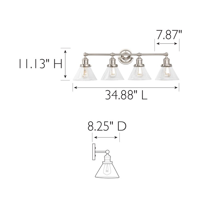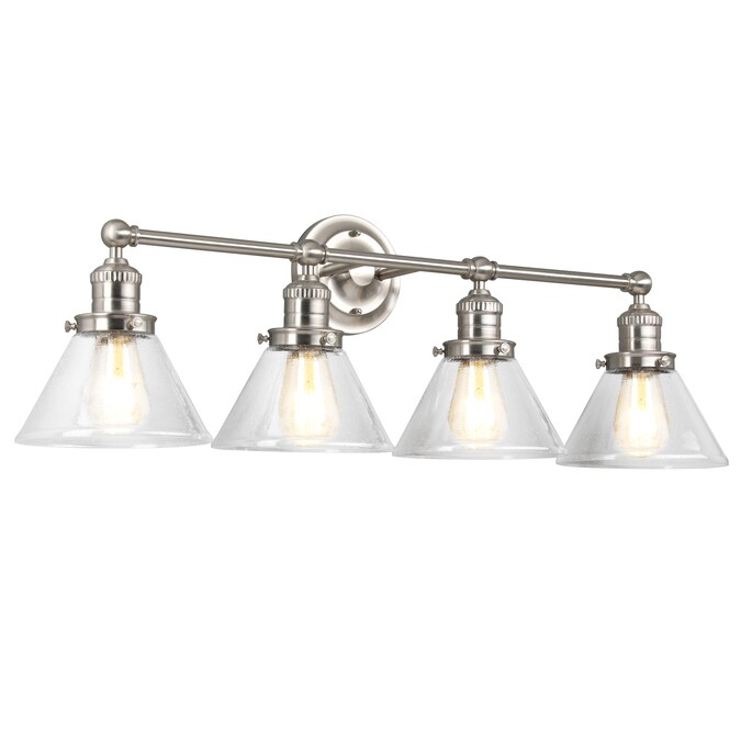 The Design House 589044-SN Augustin 4-light bathroom vanity light features a transitional design with its satin nickel finish and cone-shaped seedy glass shades. The seedy glass conceals smudges, dirt, and fingerprints while capturing a brilliant glow of light. Pair this light with an Edison style light bulb to compliment the design aesthetic. This light is rated for 120-vlts and uses (4) 60 watt medium base bulb or LED equivalent (not included). Designed and manufactured by Design House, the trusted source for quality lighting, hardware, plumbing, kitchen, and bath products for every taste and budget.