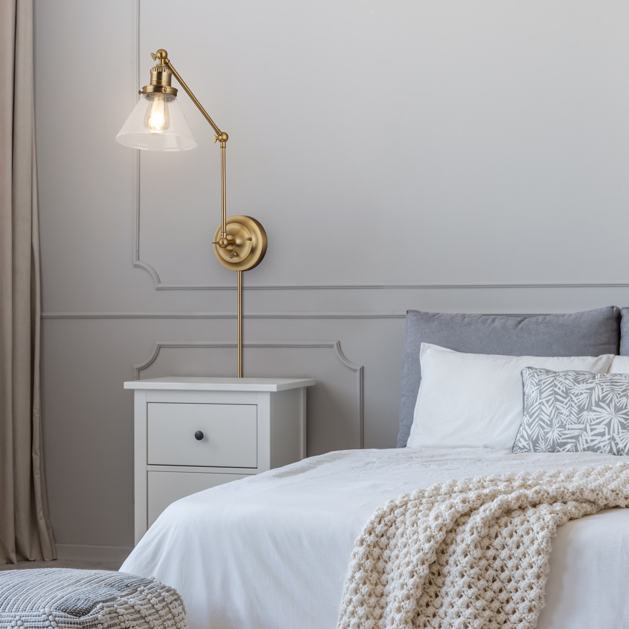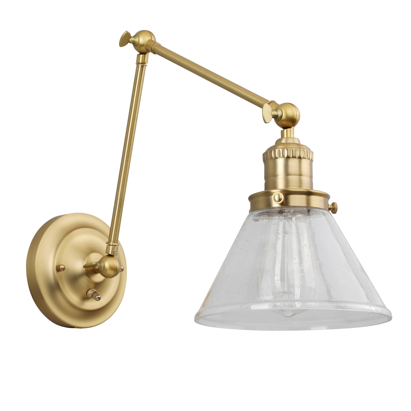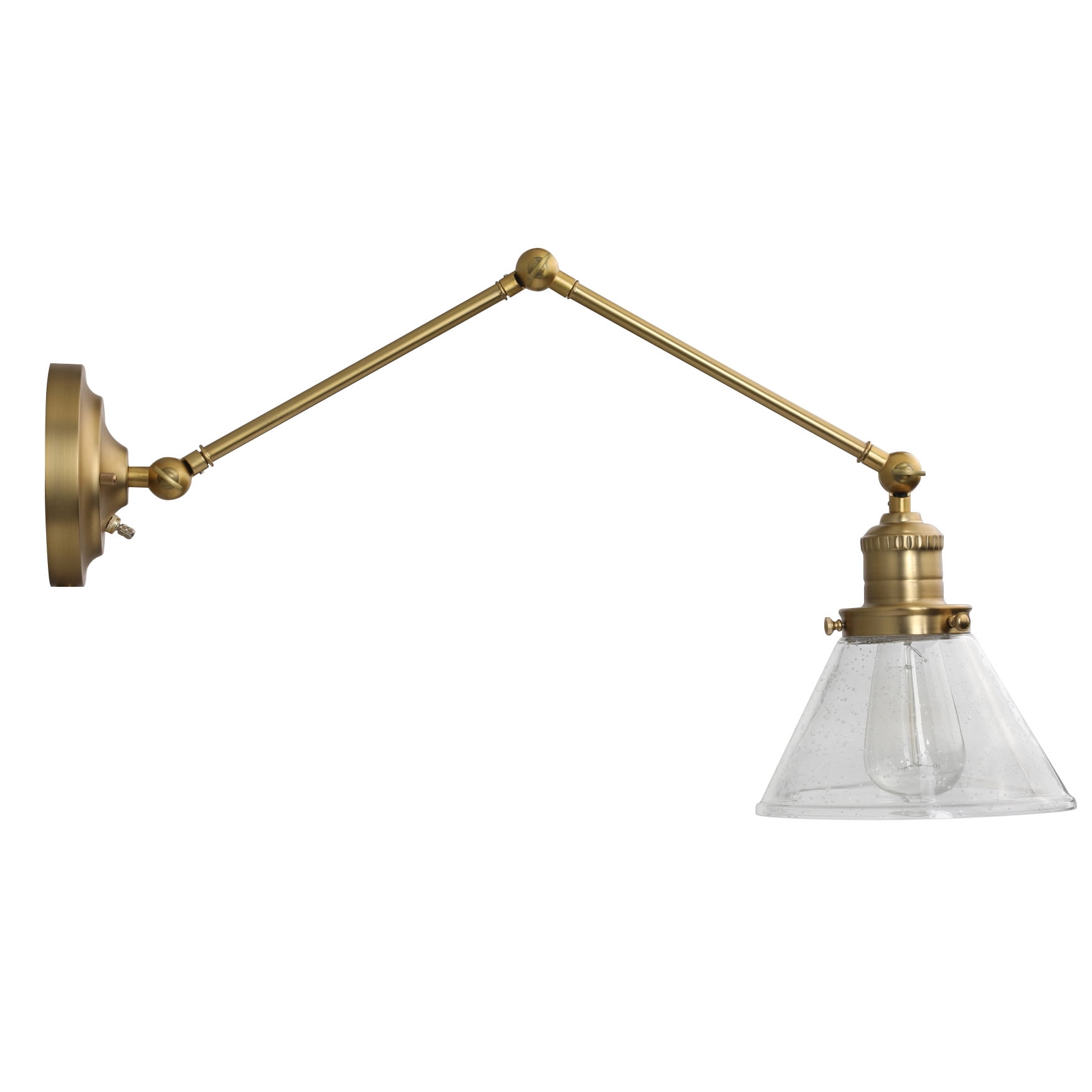 Transitional design with high functionality making it the perfect addition to the home-office, mudroom, laundry room or bedside. Conical lamp shade measures 5 inches with 7.9 inch diameter Uses (1) maximum 60W medium base bulb Crafted of steel with a satin gold finish and clear seedy glass shade, allowing for a brilliant glow of light while minimizing appearance of dust or fingerprints ON/OFF SWITCH housed on the backplate allows easy control of light when needed from either a plug-in or hardwire installation ADJUSTABLE swing arm design allows up and down movement at three different joints, perfecting the placement of direct light within a space 2-IN-1 DESIGN allowing for either a hardwire installation into the wall or plug-in installation with optional use of included cord covers to provide a finished look This product is ETL certified for use in damp locations and comes with a 10-year limited warranty Suitable for Damp Locations: This product is ETL certified for use in damp locations