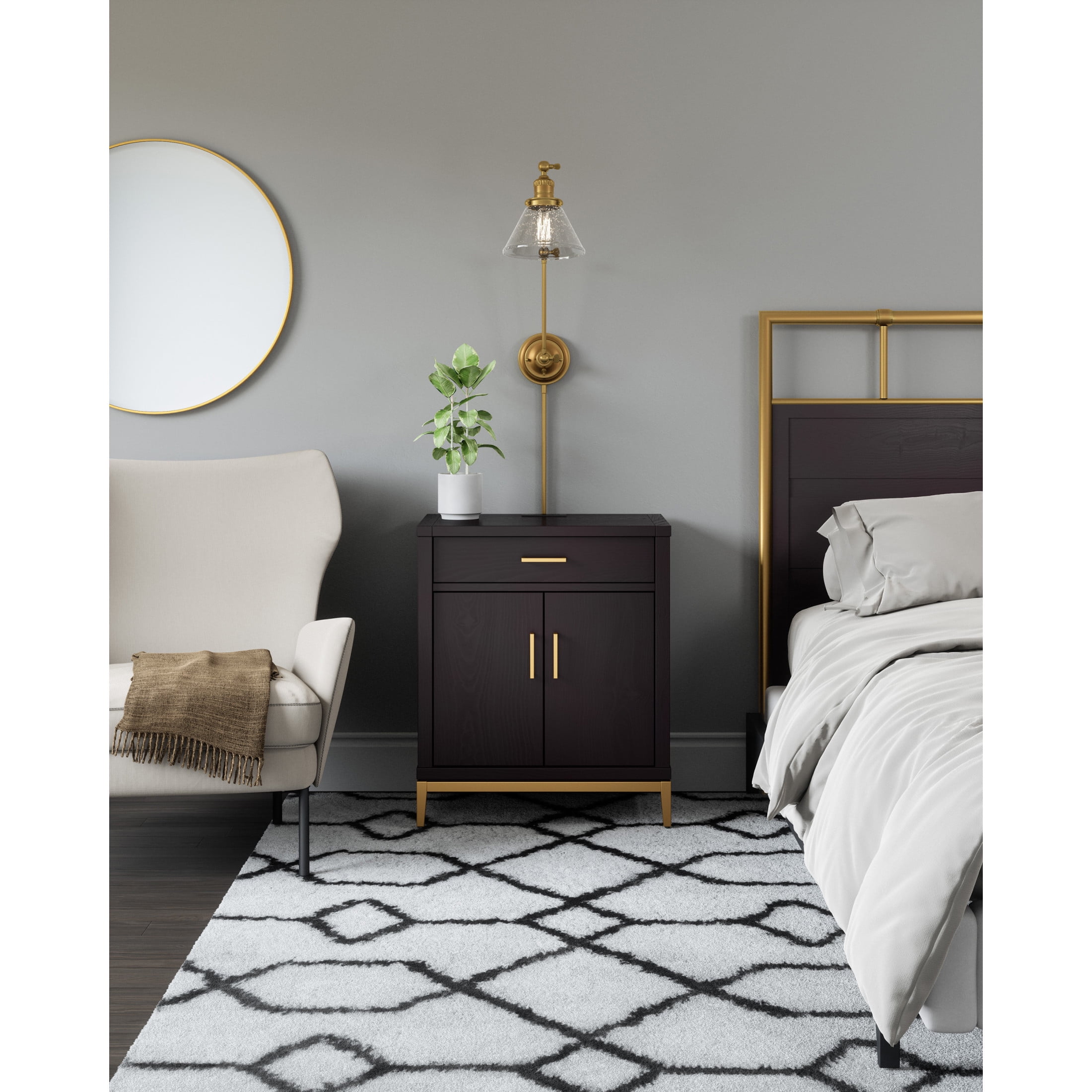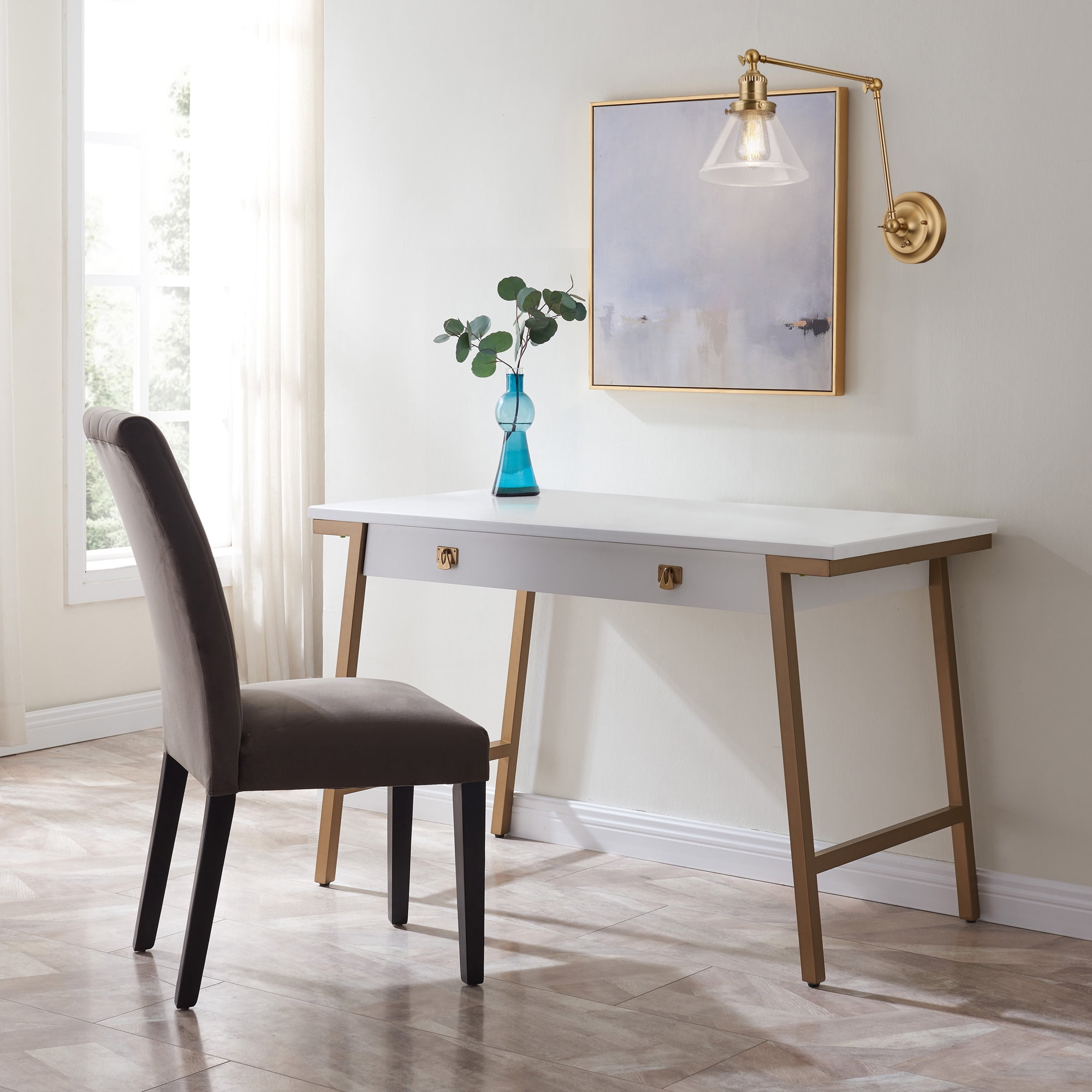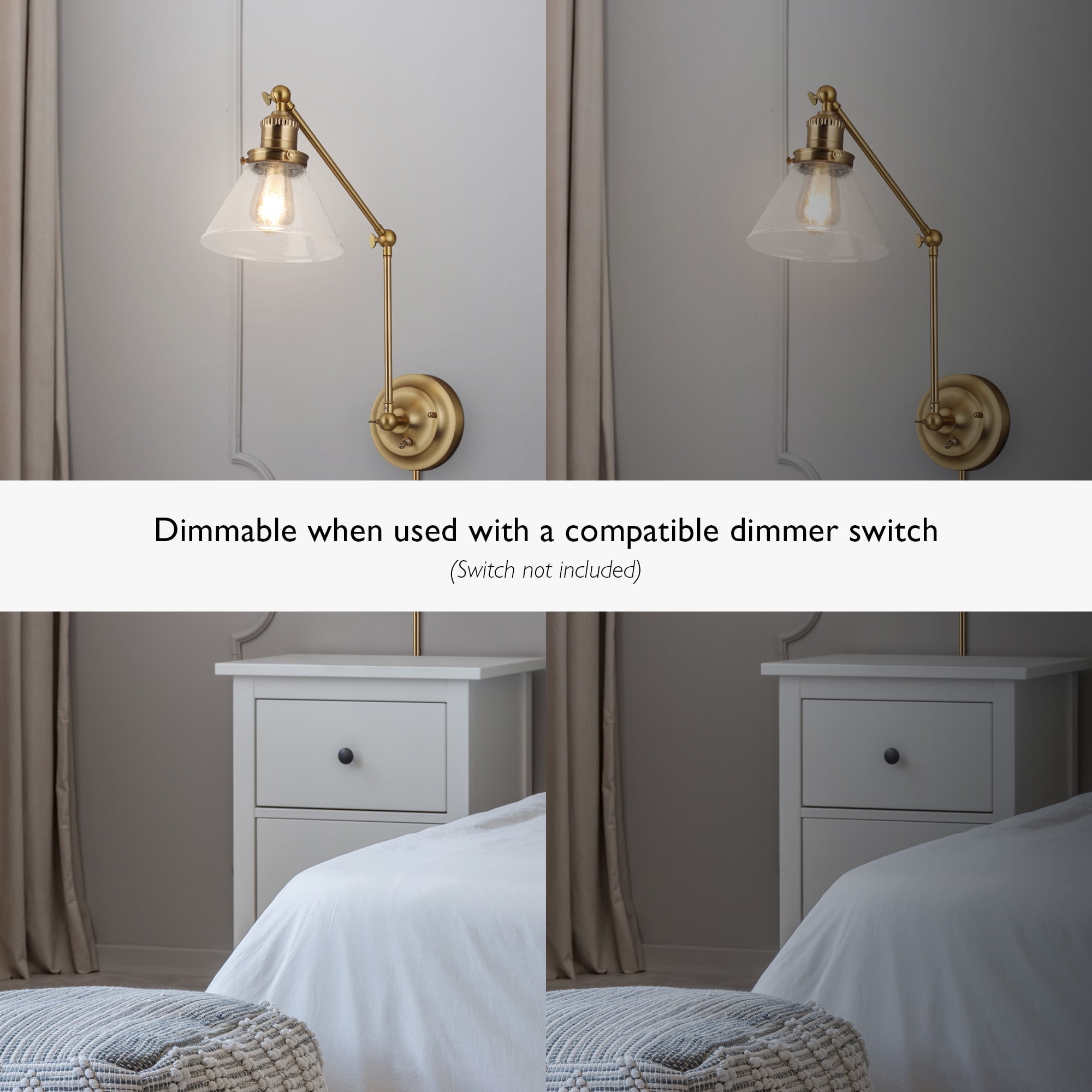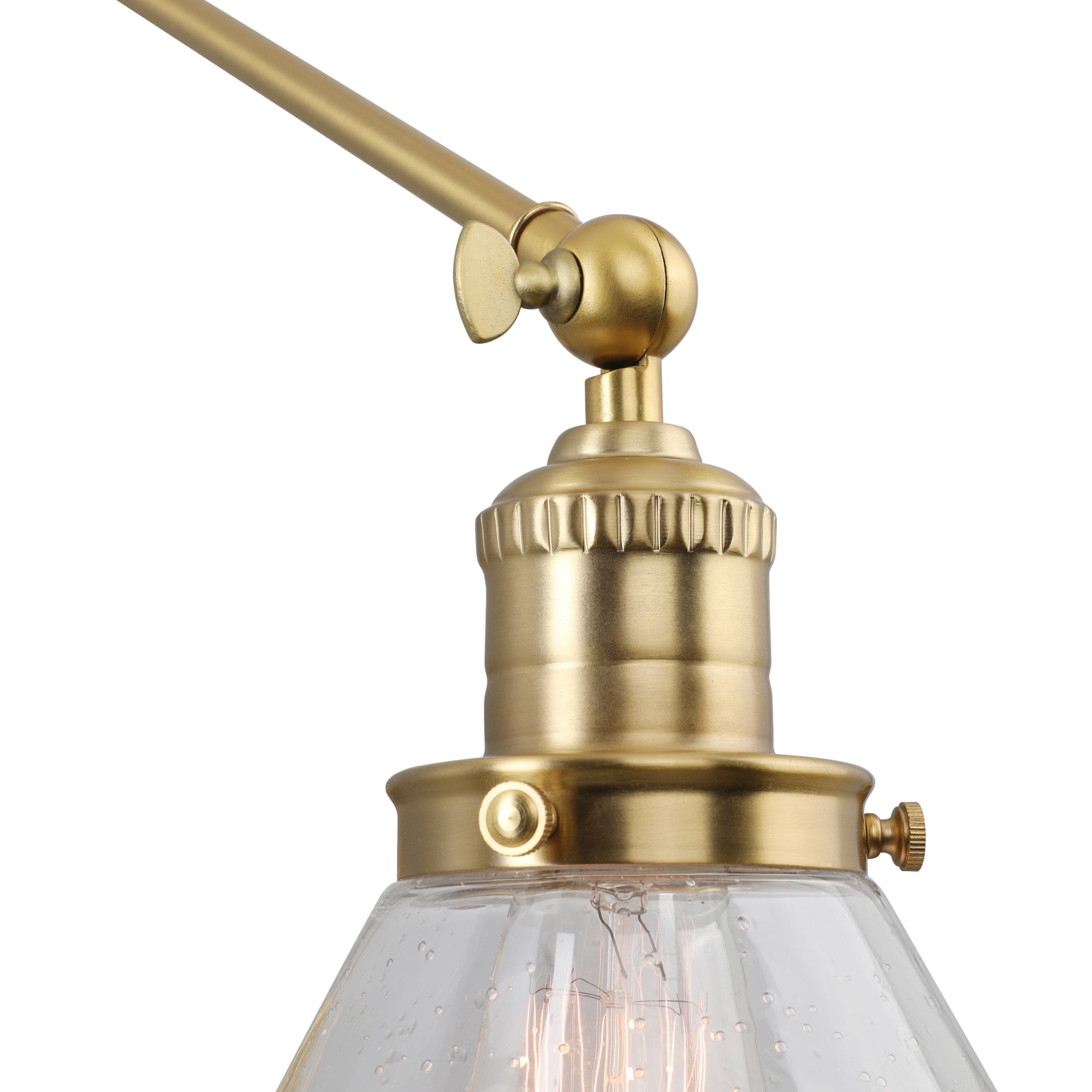 Transitional design with high functionality making it the perfect addition to the home-office, mudroom, laundry room or bedside. Conical lamp shade measures 5 inches with 7.9 inch diameter Uses (1) maximum 60W medium base bulb Crafted of steel with a satin gold finish and clear seedy glass shade, allowing for a brilliant glow of light while minimizing appearance of dust or fingerprints ON/OFF SWITCH housed on the backplate allows easy control of light when needed from either a plug-in or hardwire installation ADJUSTABLE swing arm design allows up and down movement at three different joints, perfecting the placement of direct light within a space 2-IN-1 DESIGN allowing for either a hardwire installation into the wall or plug-in installation with optional use of included cord covers to provide a finished look This product is ETL certified for use in damp locations and comes with a 10-year limited warranty Suitable for Damp Locations: This product is ETL certified for use in damp locations
