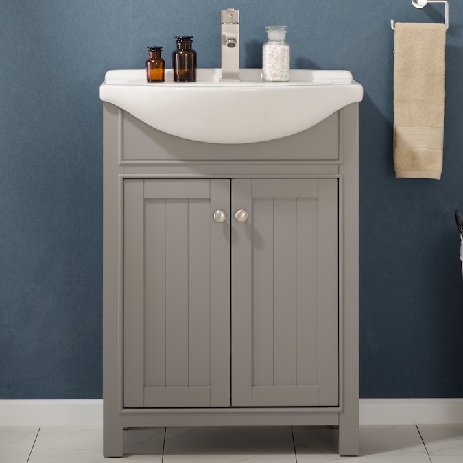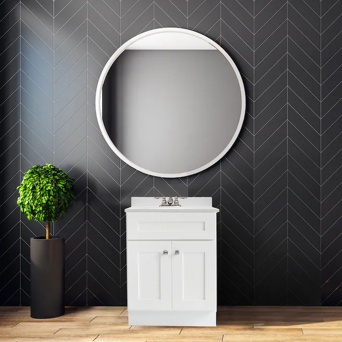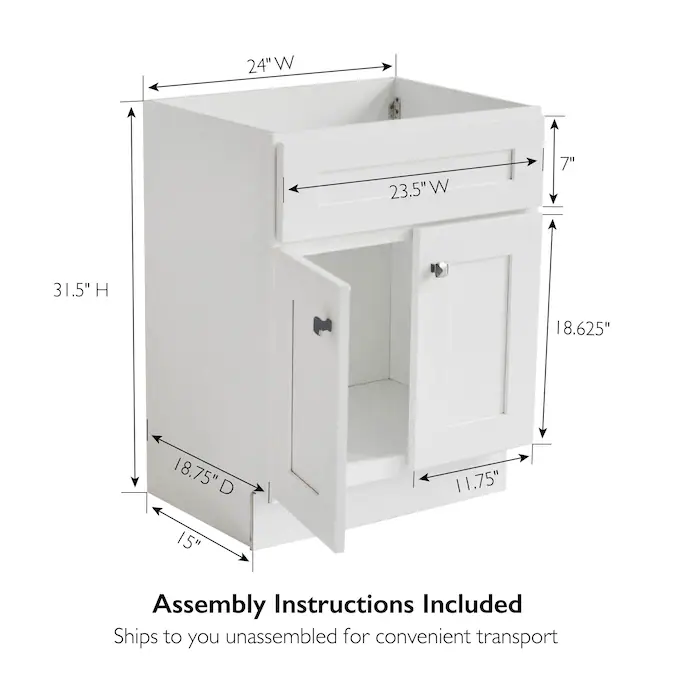 This Design House Brookings 24inch Bathroom Vanity Cabinet offers a look that will match any style, from rustic to modern. All vanities come equipped with 6-way adjustable soft-close hinges so your doors can remain as quiet as possible. Features include a 3inch wide shaker door trim, 1/2inch plywood with poplar veneer for side and bottom panels, and a 3/4inch solid maple face frame. Our RTA (ready to assemble) cabinets use a metal clip connector system, making the assembly process fast and easy. Style of drawers/doors: Shaker, Number of drawers: 0, Number of doors: 2, Number of shelves: 0.