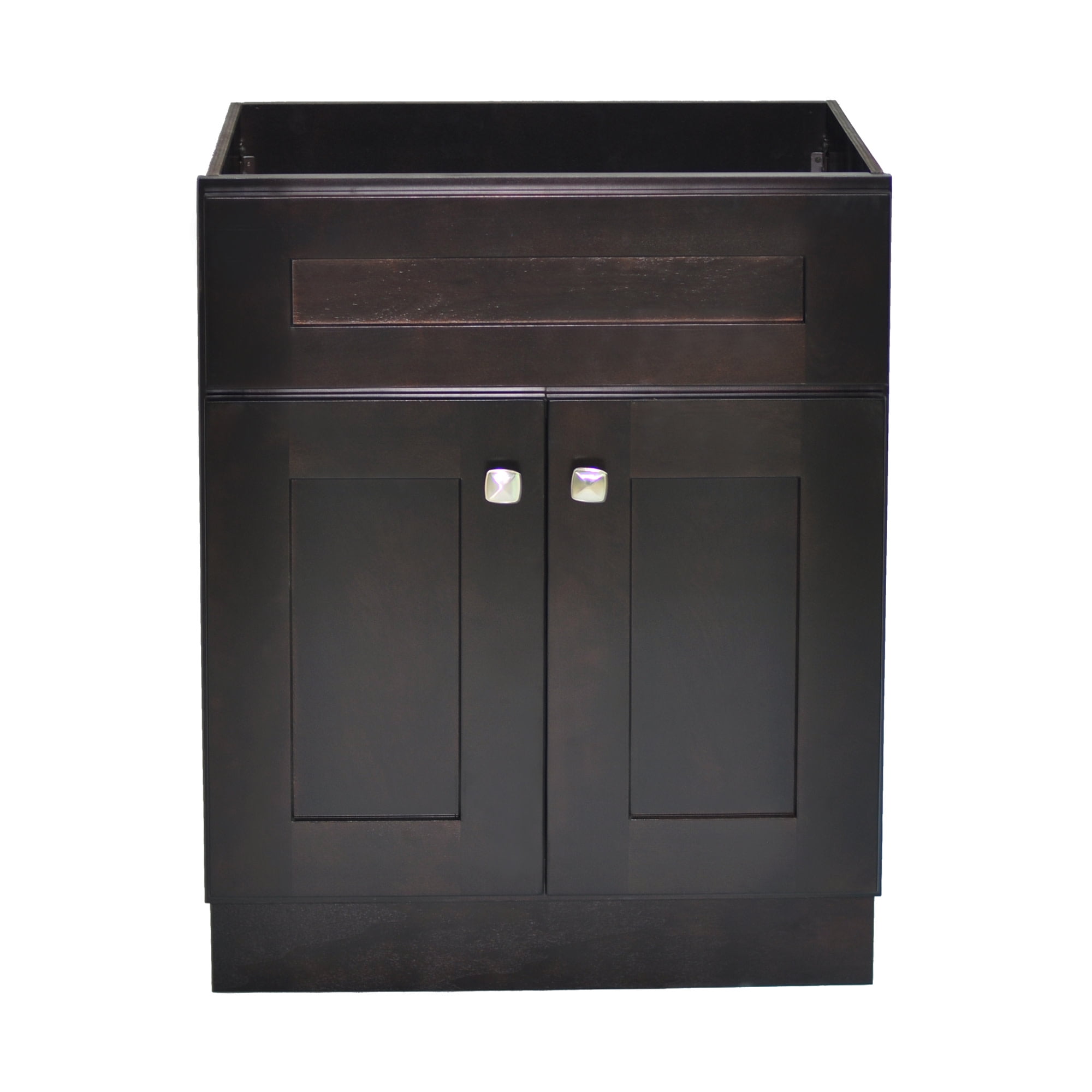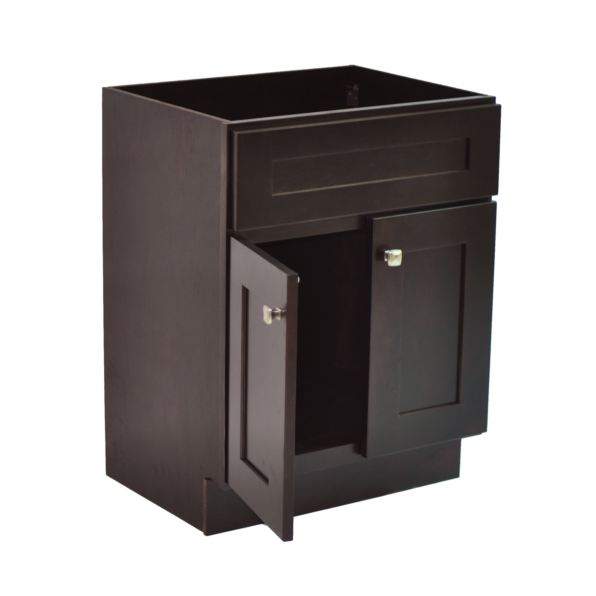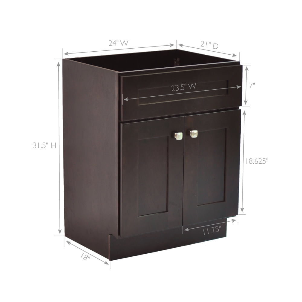 Dimensions: 24 inches W x 21 inches D x 31.5 inches H Vanity top not included; Vanity cabinet will accommodate a 25 inch W x 22 inch D vanity top 2 door design with satin nickel square cabinet knobs included 6-Way adjustable soft-close hinges, to ensure a gentle, quiet close of cabinet doors Contemporary shaker design features gently recessed paneling on the door and drawer fronts, a simple style accented by metal knob hardware, optimized to bring a clean look to fit any space, pilot holes in the back of cabinet to change out pulls/knobs if needed Shaker-style raised door design, finished in Espresso Touch-Up Repair Kit available (sold separately). Kit contains 1 marker, 1 fill stick, and 1 tool – plastic scrapper. Part # 921387-ES This product is TSCA Title VI compliant and comes with a 1-year limited warranty