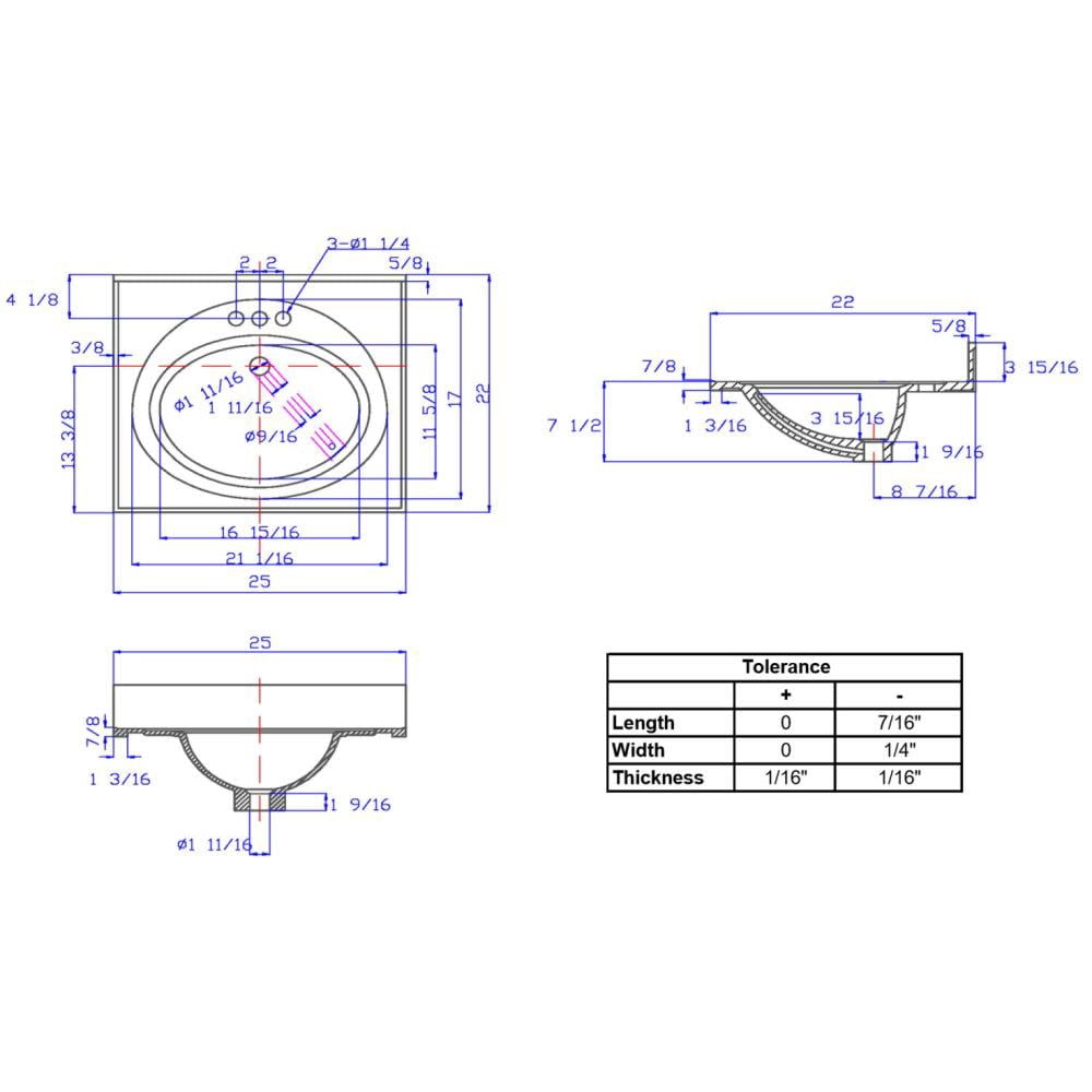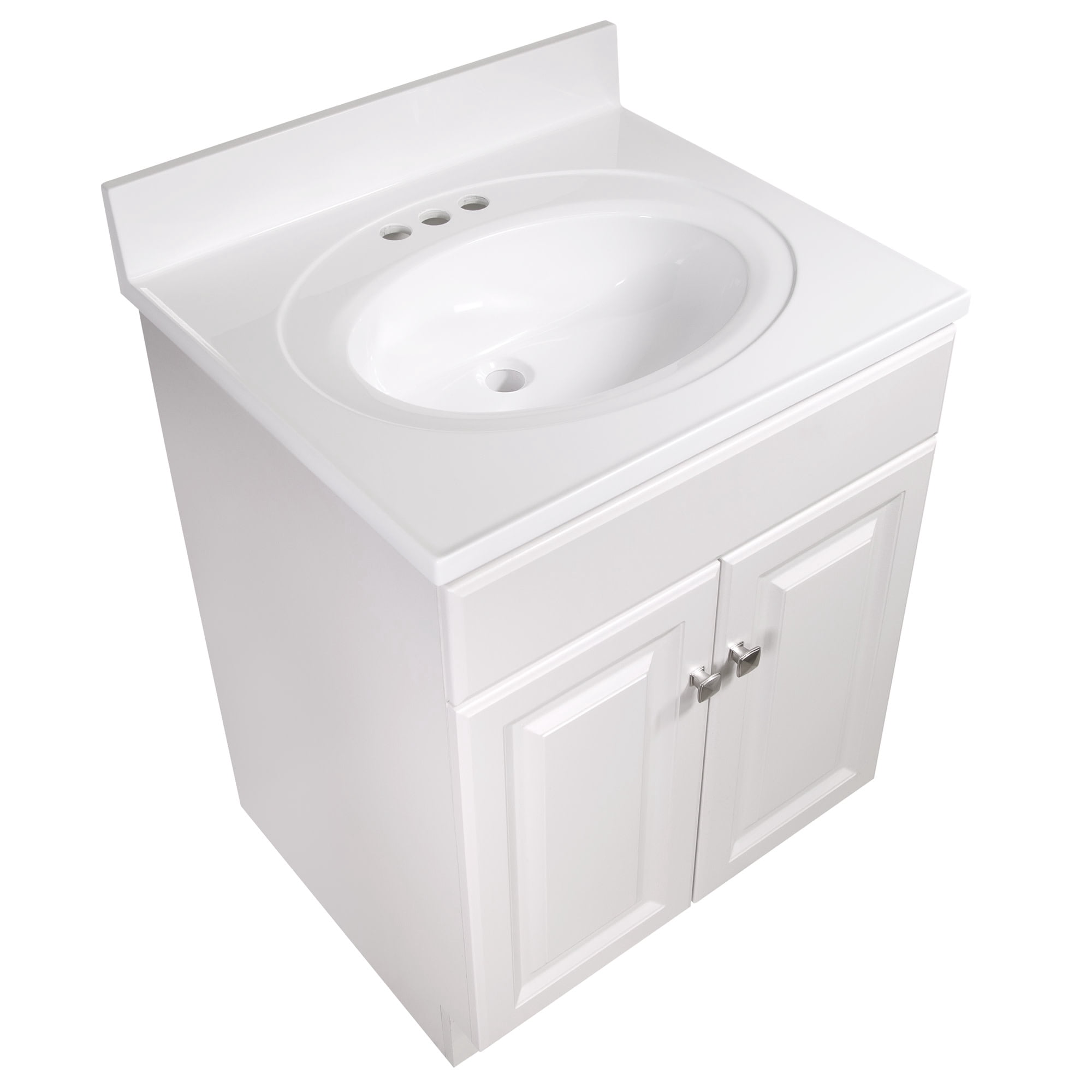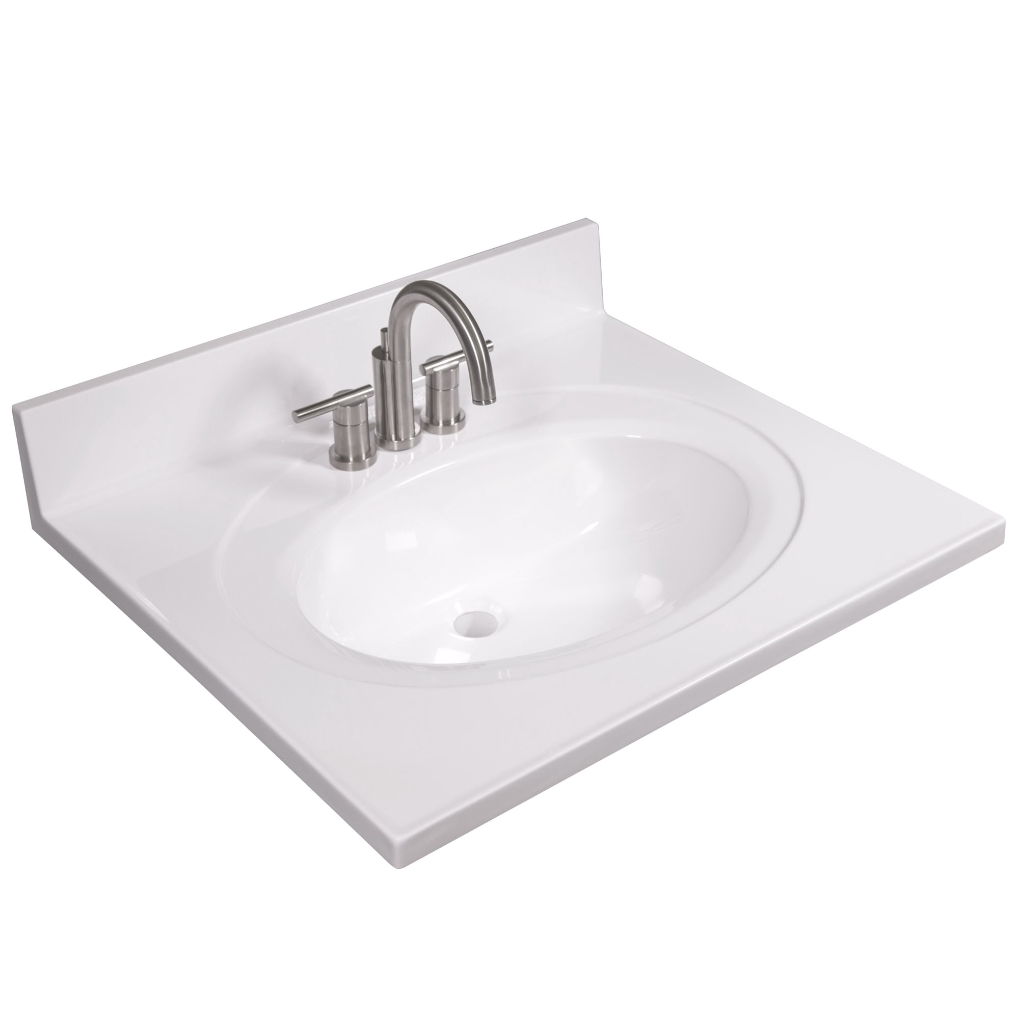 Add a clean, bright look to your bathroom with the Design House Cultured Marble Vanity Top. This countertop is 25 inches long and fits 24-inch vanity cabinets. It has a solid white finish for a modern style that works with any bathroom decor. The oval bowl and square edge give it an updated but simple look. The sink has three pre-drilled holes for a 4-inch centerset faucet, but you can also use a single faucet with a deck plate. The sink has a drip-free edge and a safety overflow hole to help stop spills. A 4-inch backsplash helps protect your wall from water damage. The smooth marble surface is stain-resistant and easy to clean — just use mild soap and a damp cloth. Designed and made by Design House, the trusted source for quality lighting, hardware, plumbing, kitchen, and bath products for every taste and budget.