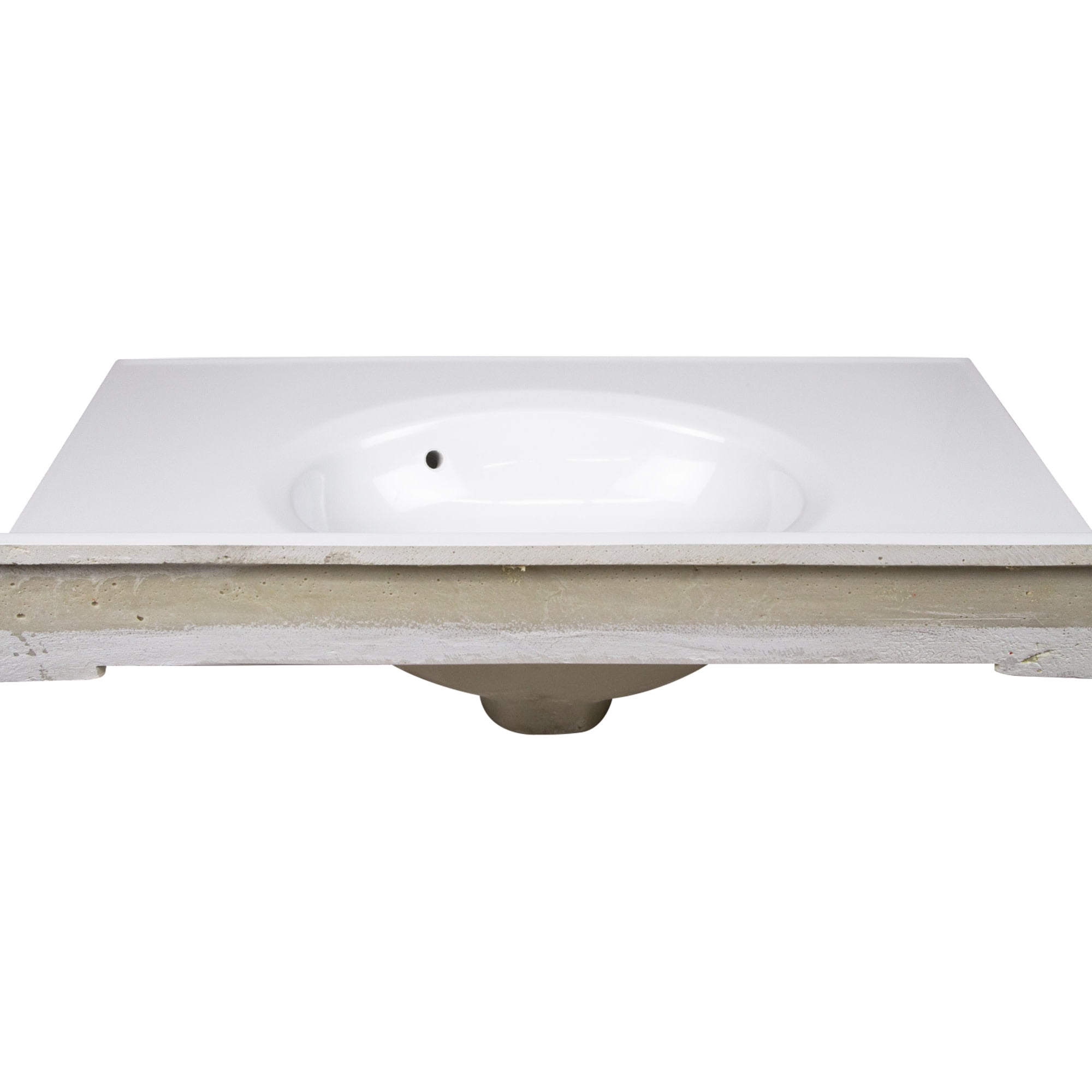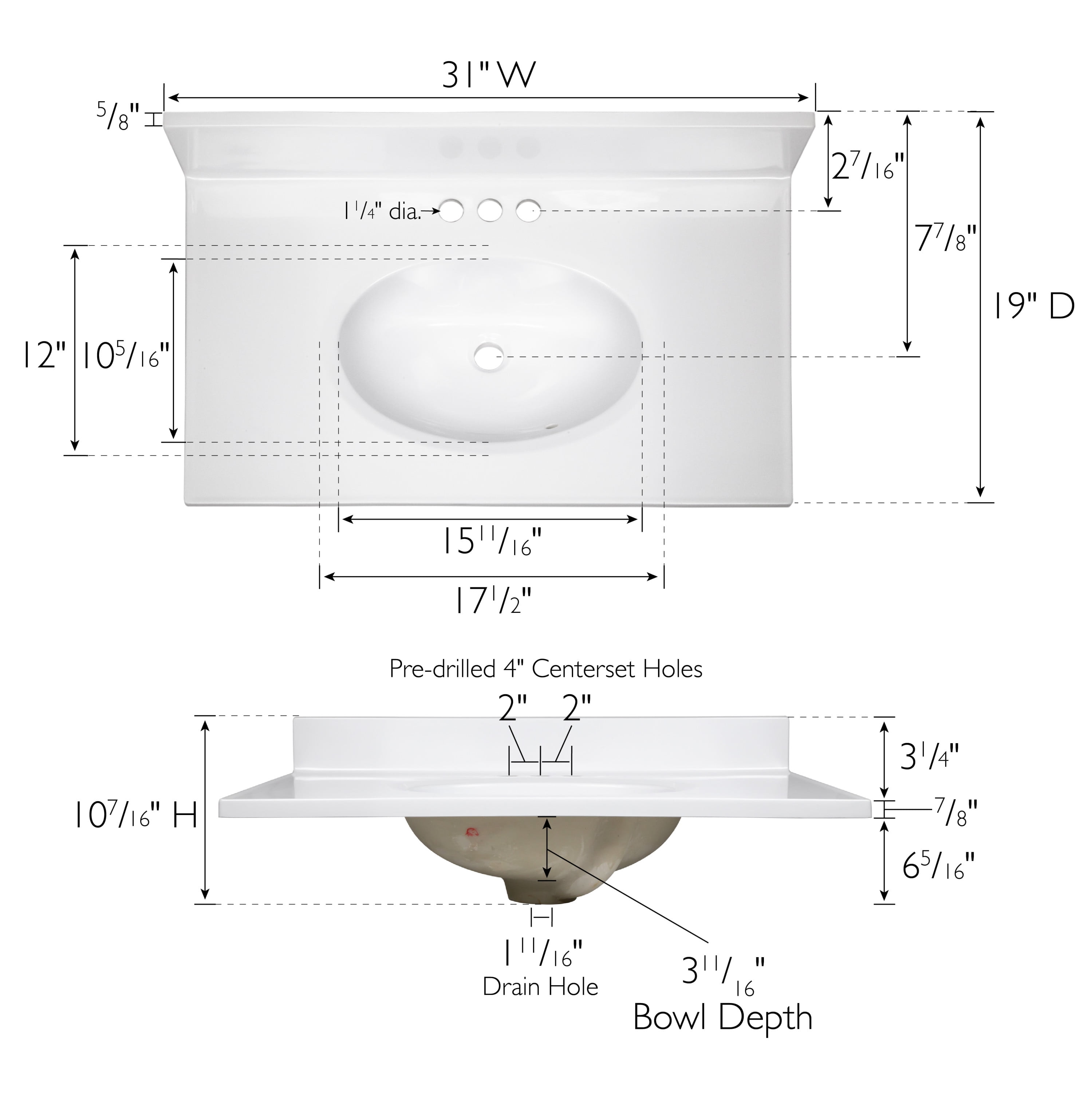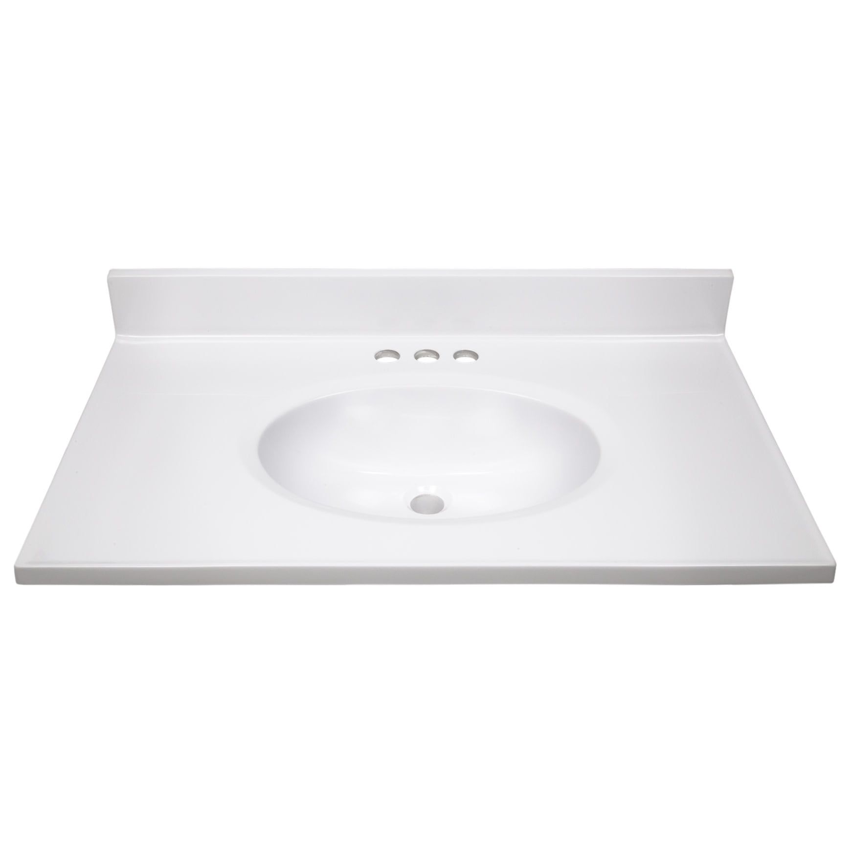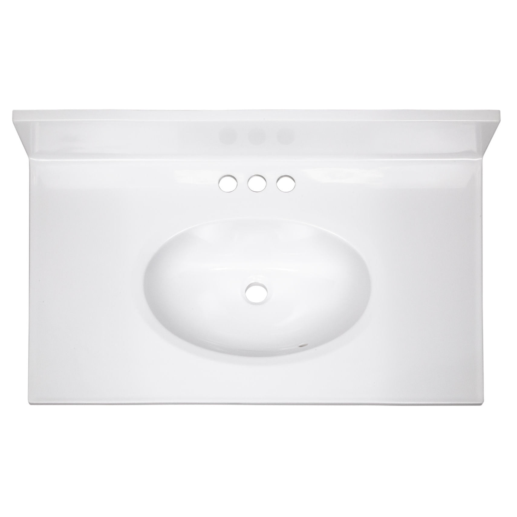 Clean & Modern Vanity Sink for Bathroom: Features an integrated oval sink and contemporary solid white finish that pairs well with any bathroom decor style Pre-Drilled 4-Inch Centerset: Three pre-drilled holes allow for a standard 4-inch centerset mount faucet on this vanity top Durable Construction: Crafted with cultured marble to create a highly durable and water-resistant surface Efficient Design: Includes an overflow hole and a 4-inch integrated backsplash to prevent water damage to your wall Convenient Clean-Up: Cultured marble surface is stain-resistant and easy to clean; simply wipe using a non-abrasive soap and a damp cloth Buy with Confidence: Customer satisfaction has been our priority for 150 years; with our 5-year limited warranty, you can rest assured your purchase is risk-free