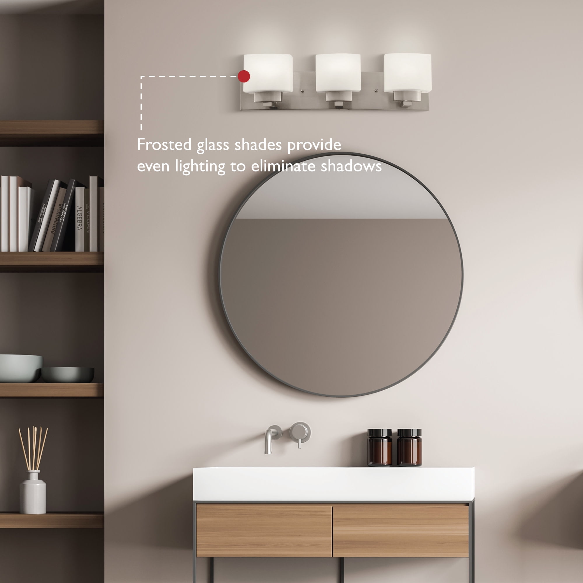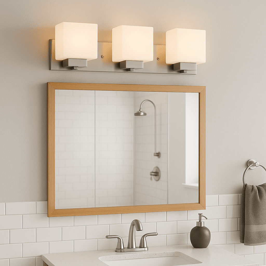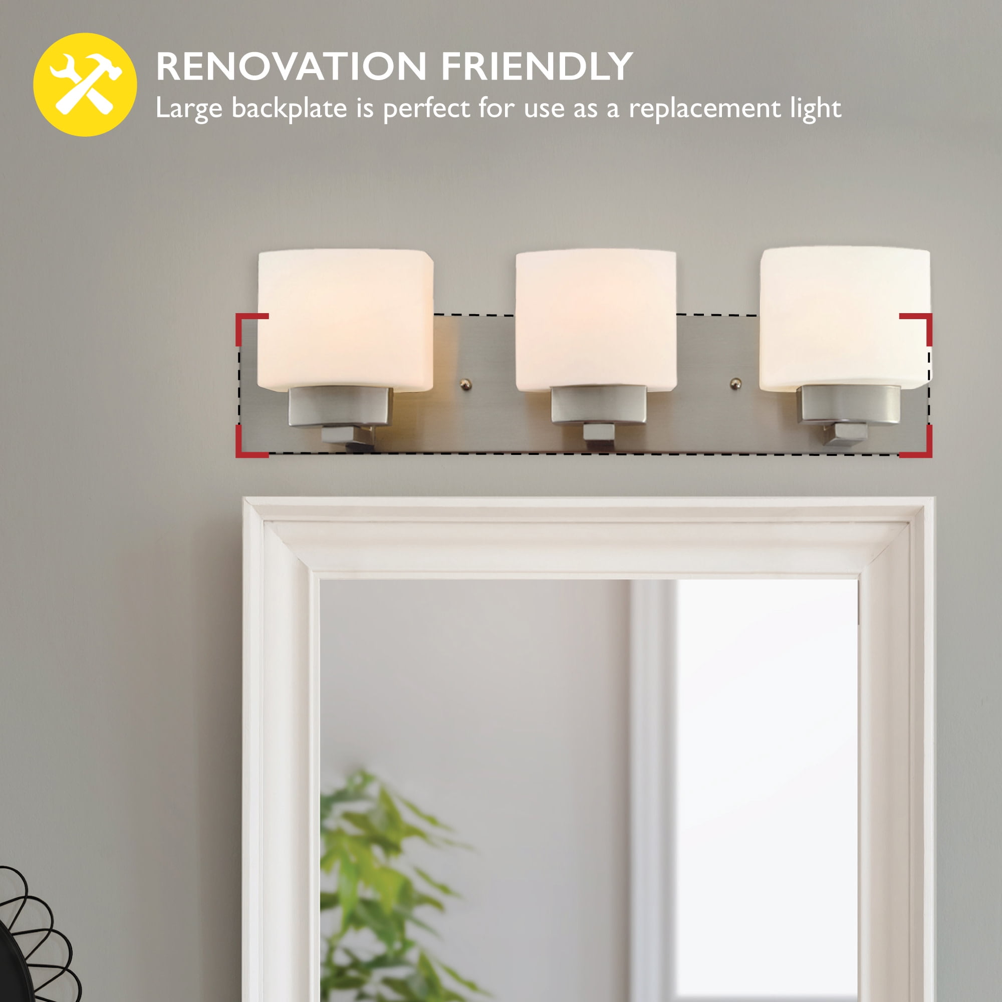 Traditional Style Vanity Light: Stunning satin nickel finish with square frosted glass shades that can be mounted up or down Renovation Friendly: Large rectangular backplate minimizes paint touchups and drywall repairs Three Light Vanity Light: Uses three 60-watt medium base bulbs or LED equivalent (not included) Dimmable: Allows you to create the perfect atmosphere when used with a compatible dimmer switch (not included) Sturdy and Durable: Steel construction for long-lasting use; cETL/ETL listed for use in damp locations Buy with Confidence: Customer satisfaction has been our priority for 150 years; with our 10-year limited warranty, you can rest assured your purchase is risk-free This product is UL certified for use in damp locations and comes with a 10-year limited warranty. Sturdy and Durable: Steel construction for long-lasting use; this product is UL certified for use in damp locations