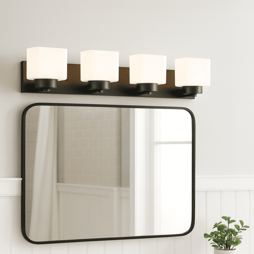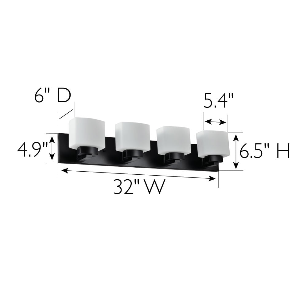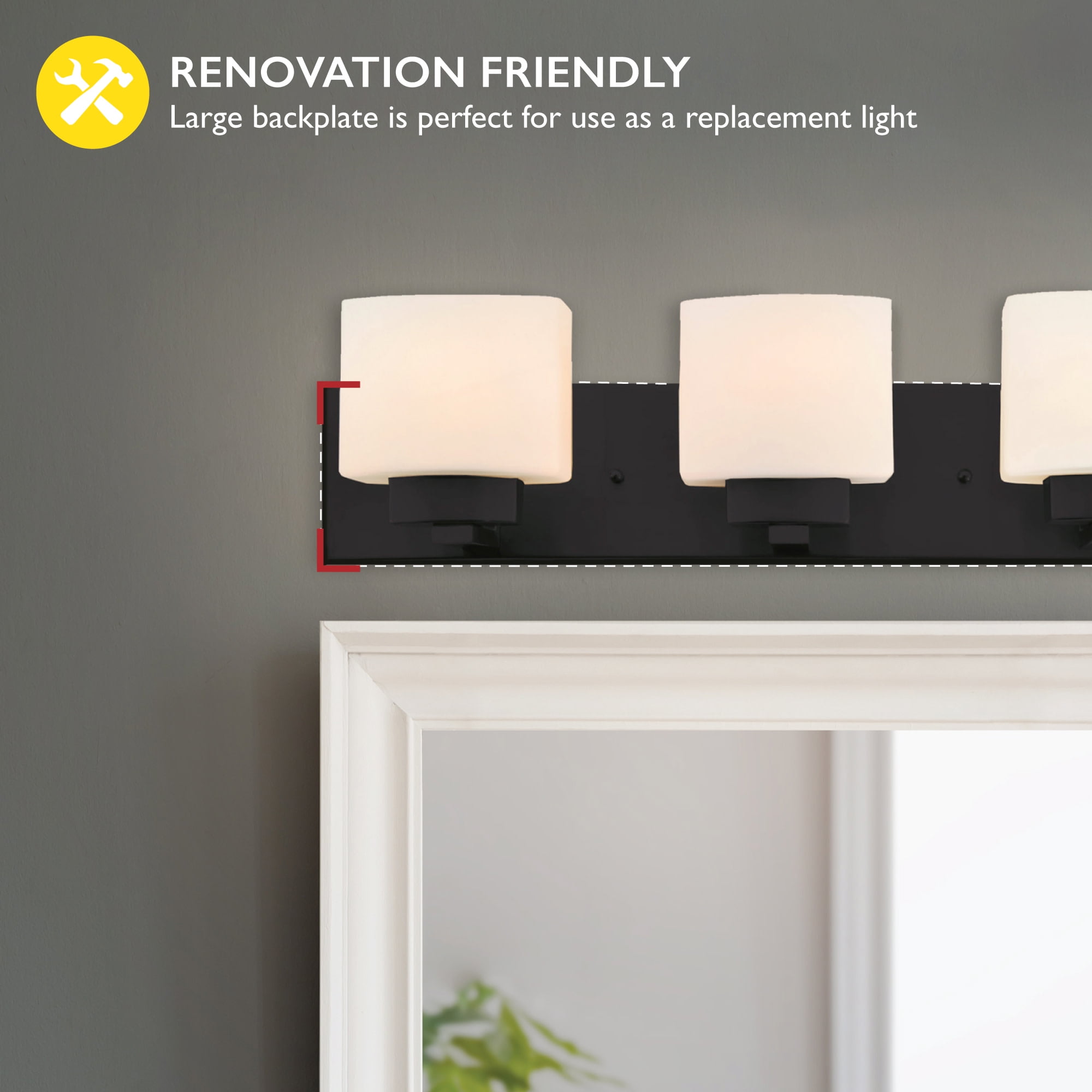 Traditional Style Vanity Light: Stunning matte black finish with square frosted glass shades that can be mounted up or down Renovation Friendly: Large rectangular backplate minimizes paint touchups and drywall repairs Four Light Vanity Light: Uses four 60-watt medium base bulbs or LED equivalent (not included) Dimmable: Allows you to create the perfect atmosphere when used with a compatible dimmer switch (not included) Sturdy and Durable: Steel construction for long-lasting use; this product is UL certified for use in damp locations Buy with Confidence: Customer satisfaction has been our priority for 150 years; with our 10-year limited warranty, you can rest assured your purchase is risk-free This product is UL certified for use in damp locations and comes with a 10-year limited warranty.
