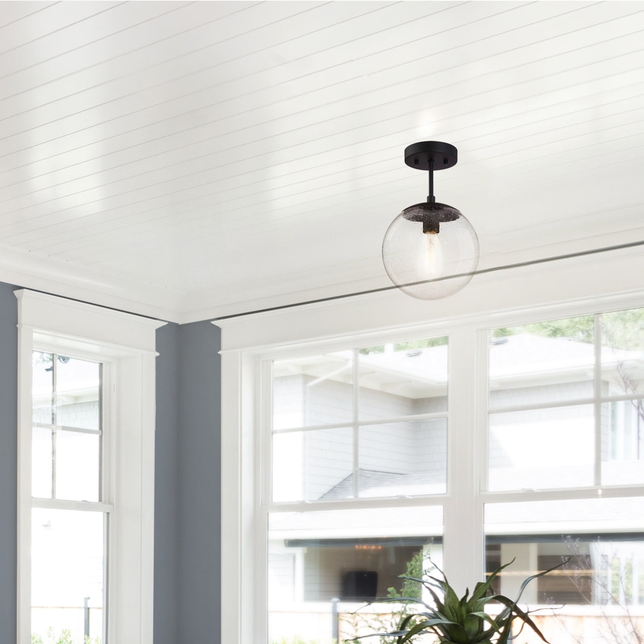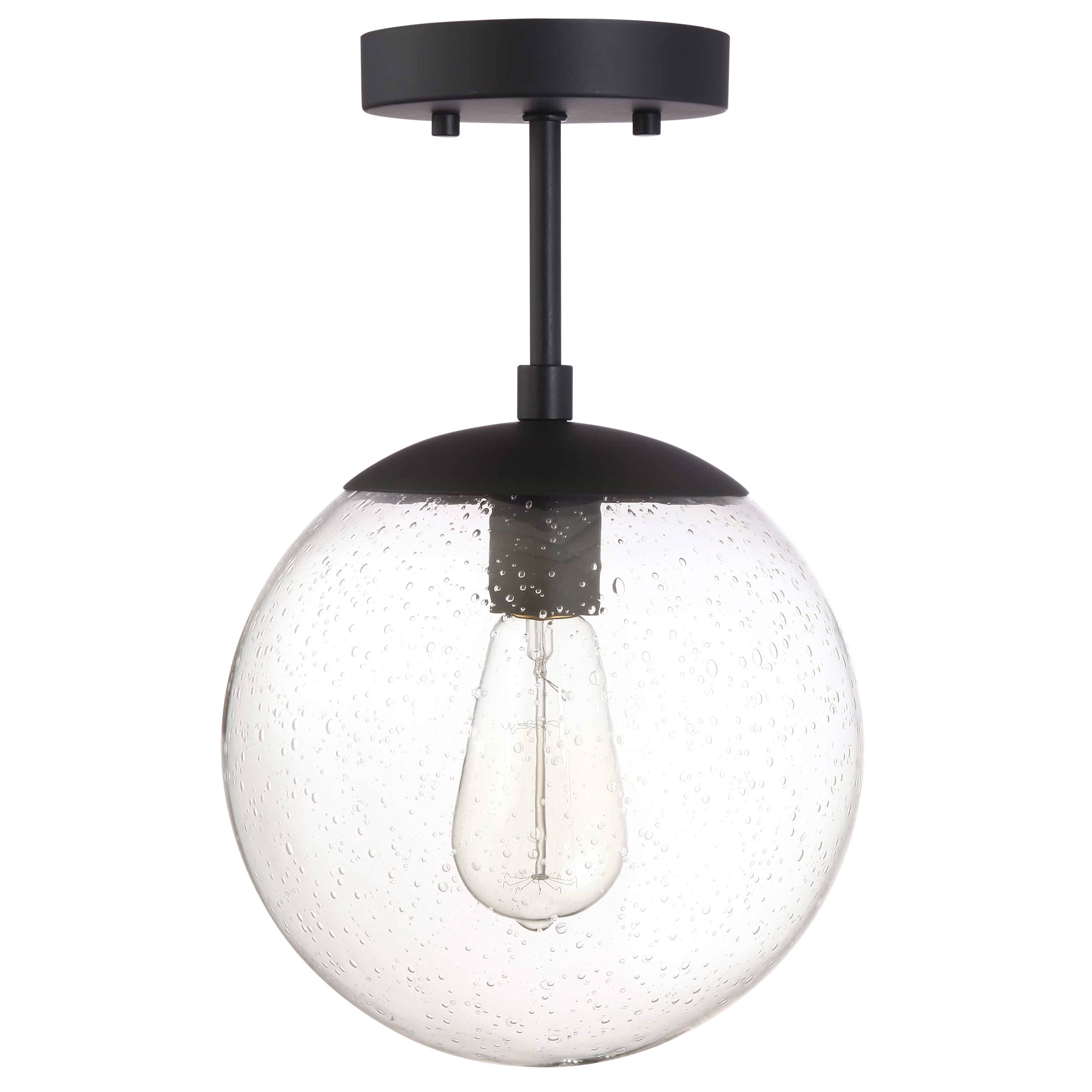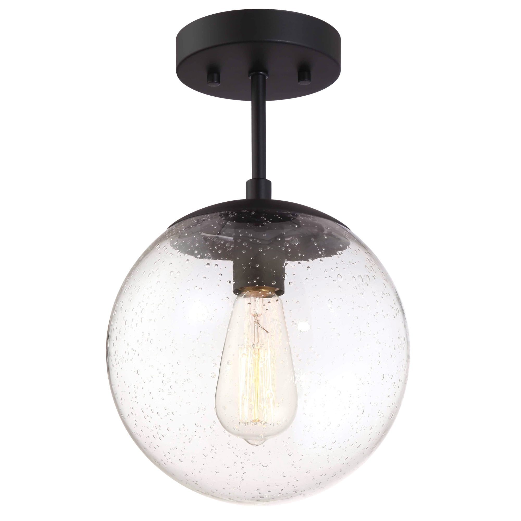 IDEAL FOR kitchens, bedrooms, hallways, entryways, closets and more, this modern ceiling light has a sleek matte black finish and a clear, seedy glass globe shade DIMENSIONS: 14 inches H x 9 inches W Uses (1) 60W standard medium base bulb or LED equivalent (Not included) DIMMABLE: Designed to be dimmable when used with a compatible dimmer switch (not included); allowing you to adjust the preferred light brightness ETL listed for use in dry locations 10-year limited warranty