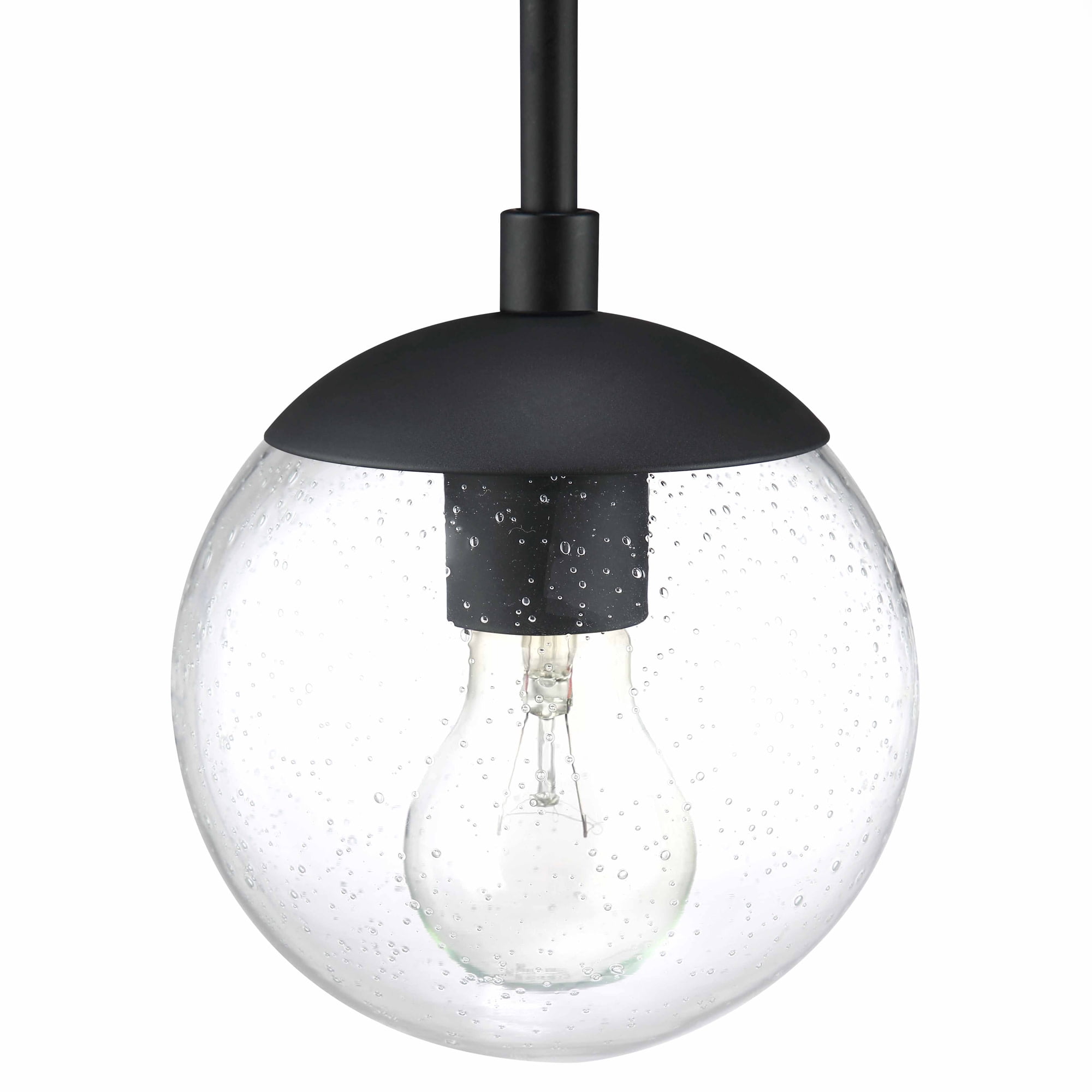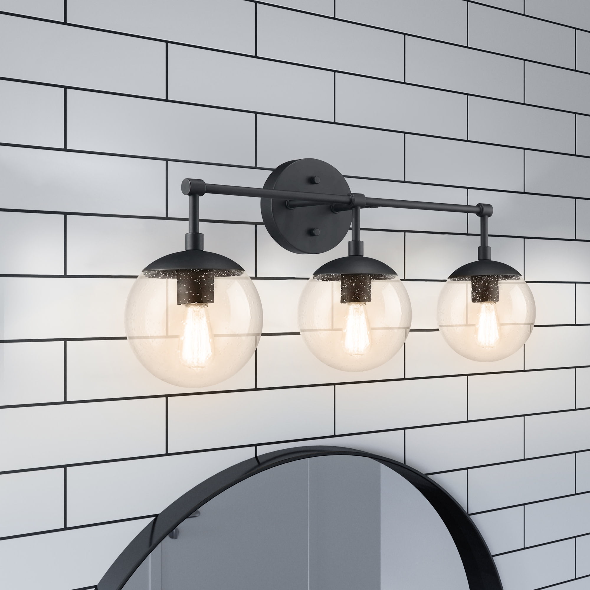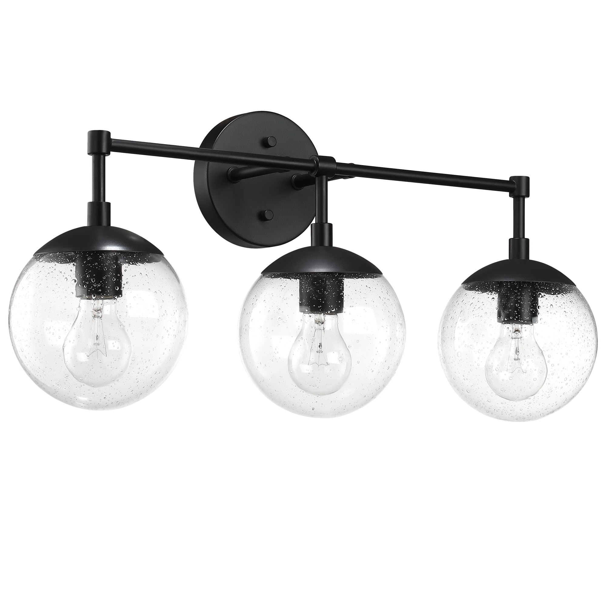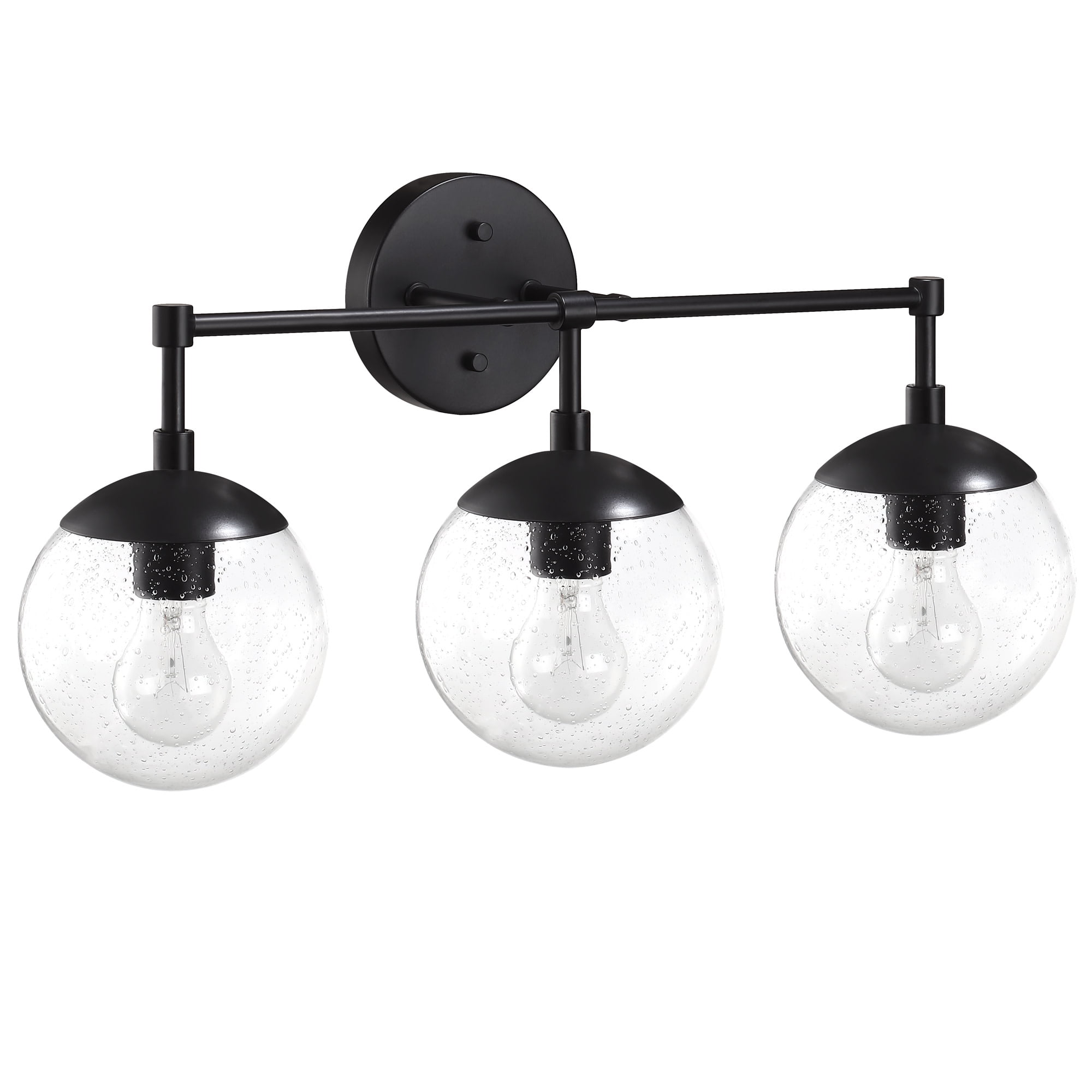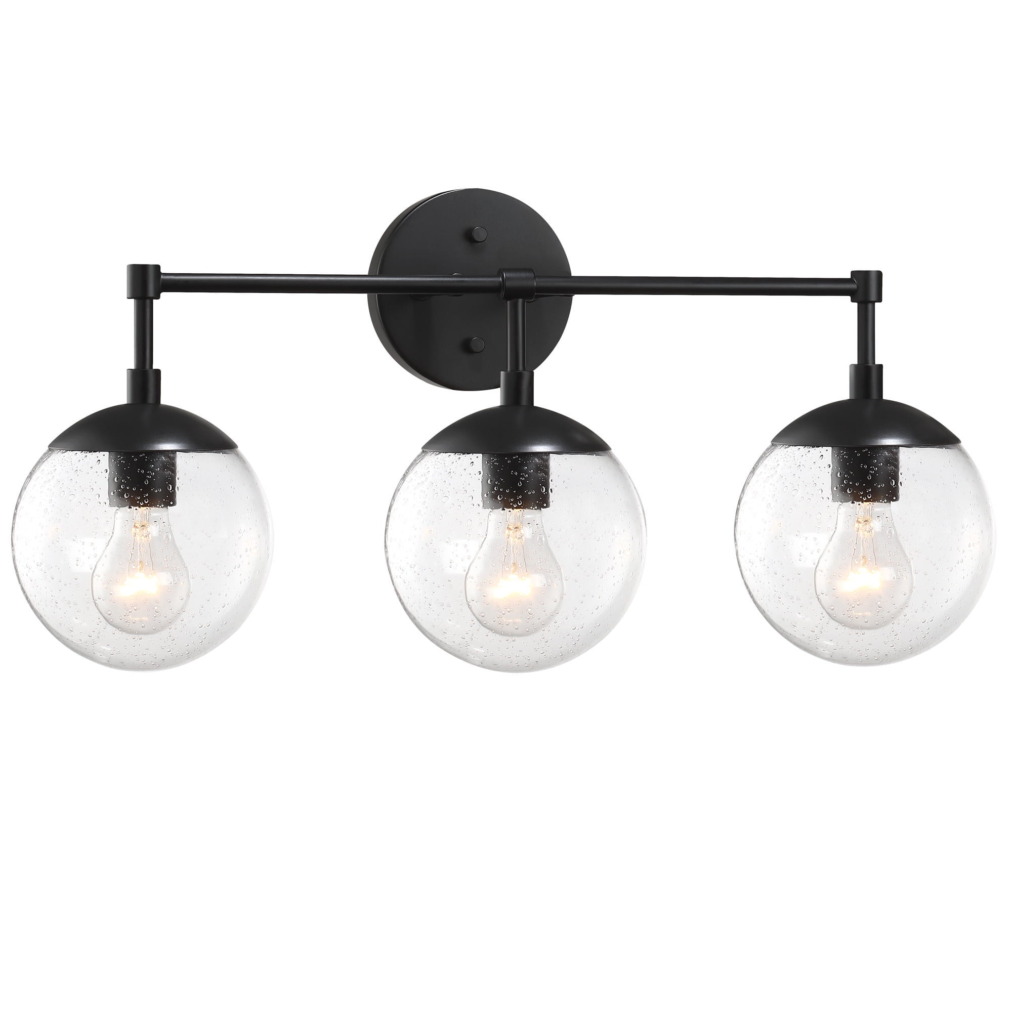 IDEAL FOR bathrooms, this modern wall light has a sleek matte black finish with clear, seedy glass globe shades DIMENSIONS: 11.65 inches H x 24 inches W x 8 inches D Uses (3) 60W standard medium base bulbs or LED equivalent (Not included) DIMMABLE: Designed to be dimmable when used with a compatible dimmer switch (not included); allowing you to adjust the preferred light brightness This product is ETL certified for use in damp locations and comes with a 10-year limited warranty Suitable for Damp Locations: This product is ETL certified for use in damp locations