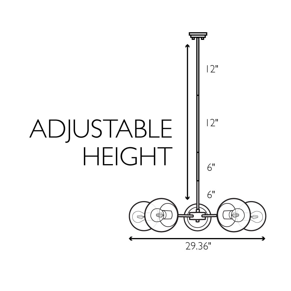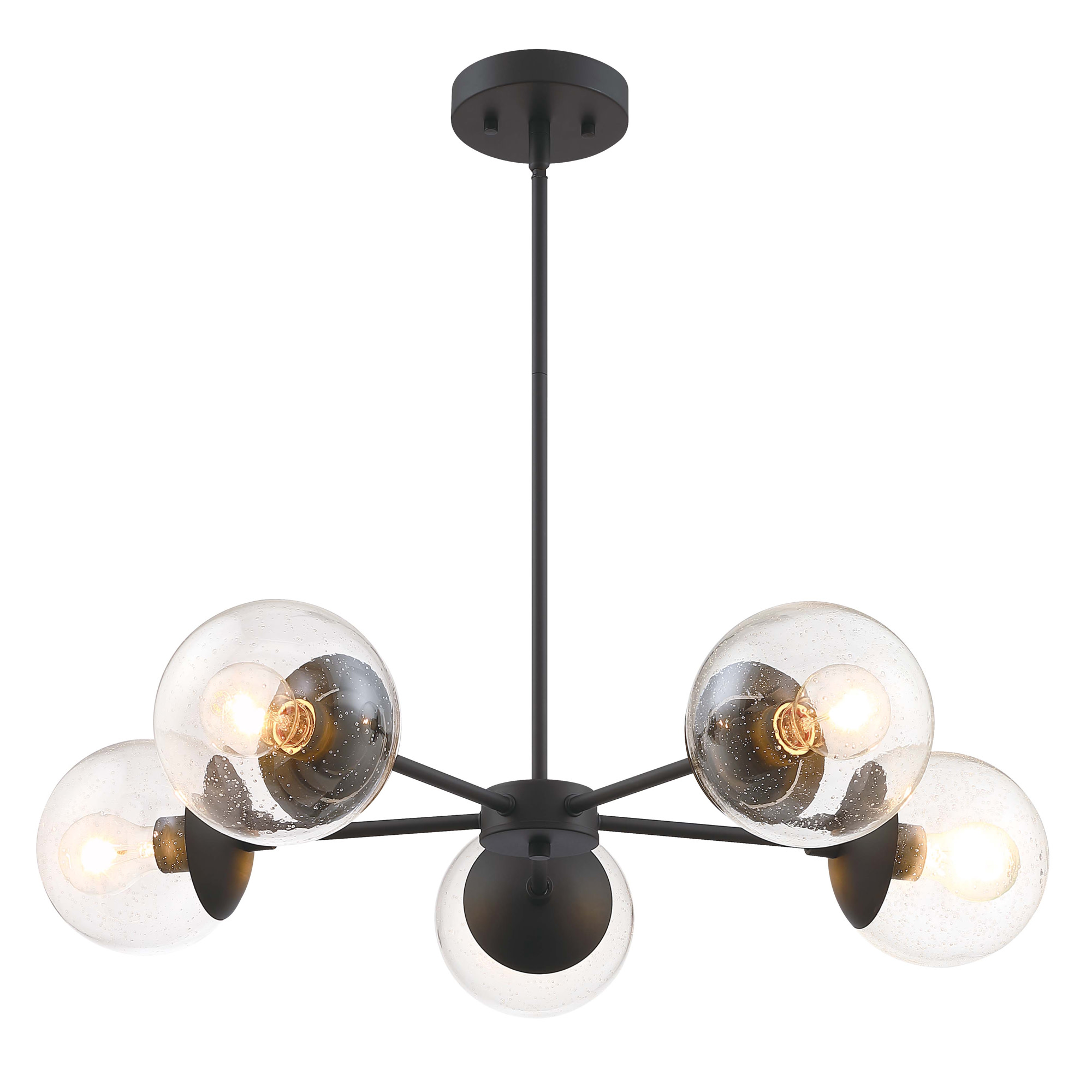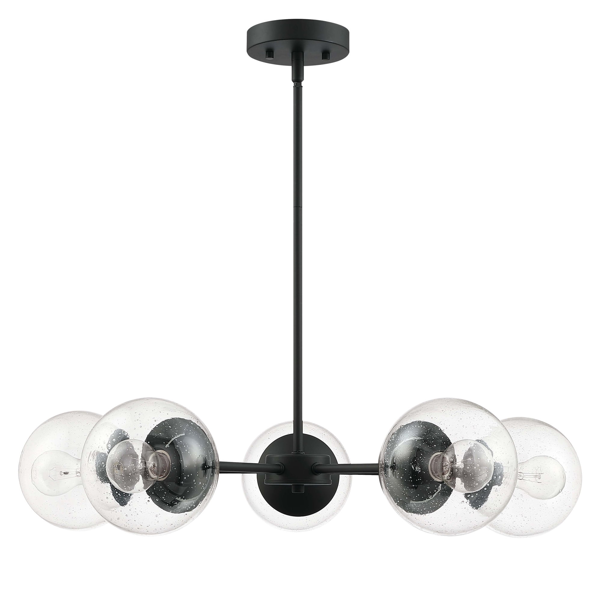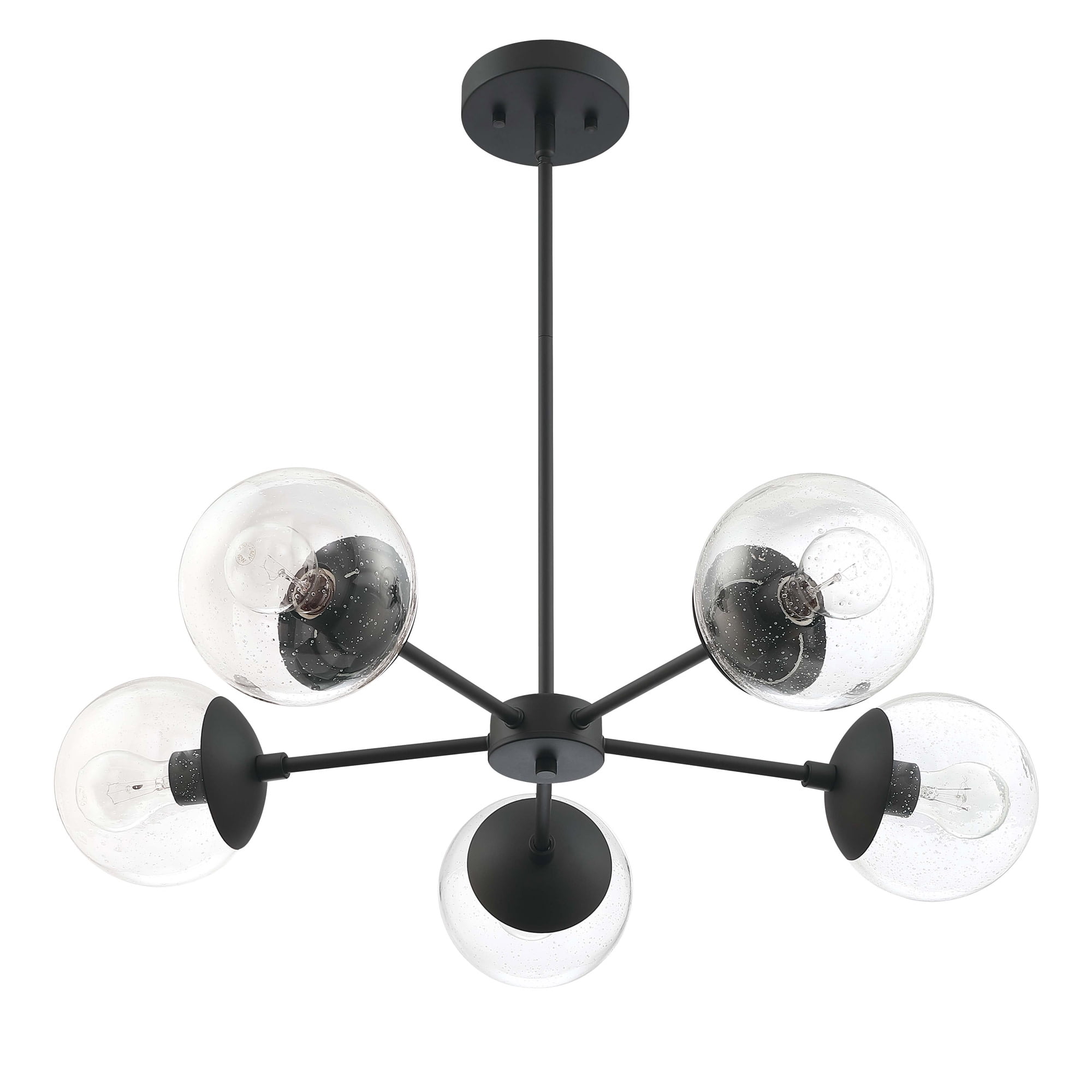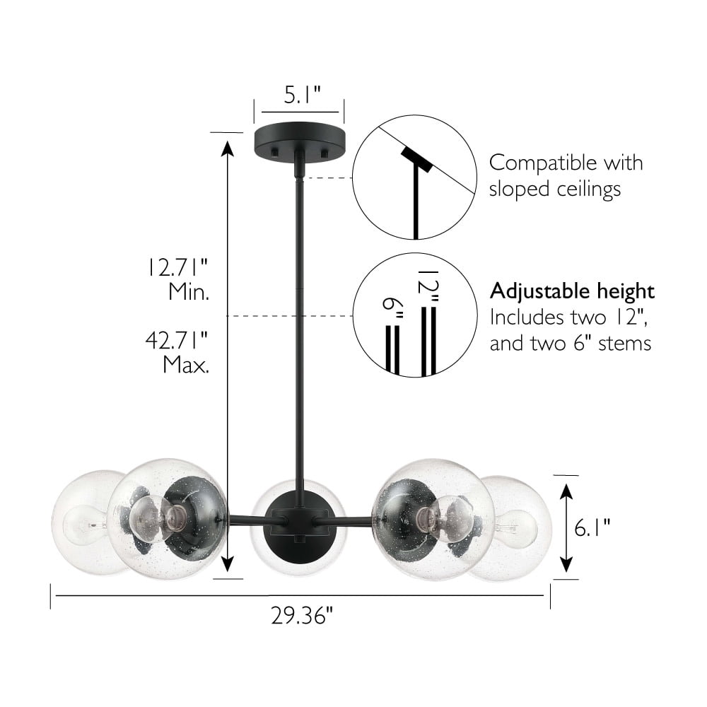 IDEAL FOR kitchens, bedrooms, hallways, entryways, and more, this modern chandelier has a sleek matte black finish and clear, seedy glass globe shades DIMENSIONS: 42.71 inches H x 29.36 inches W x 29.36 inches D USES (5) 60W standard medium base bulb or LED equivalent (Not included) DIMMABLE: Designed to be dimmable when used with a compatible dimmer switch (not included); allowing you to adjust the preferred light brightness INCLUDES (2) 6 inch and (2) 12 inch standard adjustable rods for varied hanging heights COMPATIBLE with sloped ceilings, up to 45-degree angle ETL listed for use in dry locations 10-year limited warranty