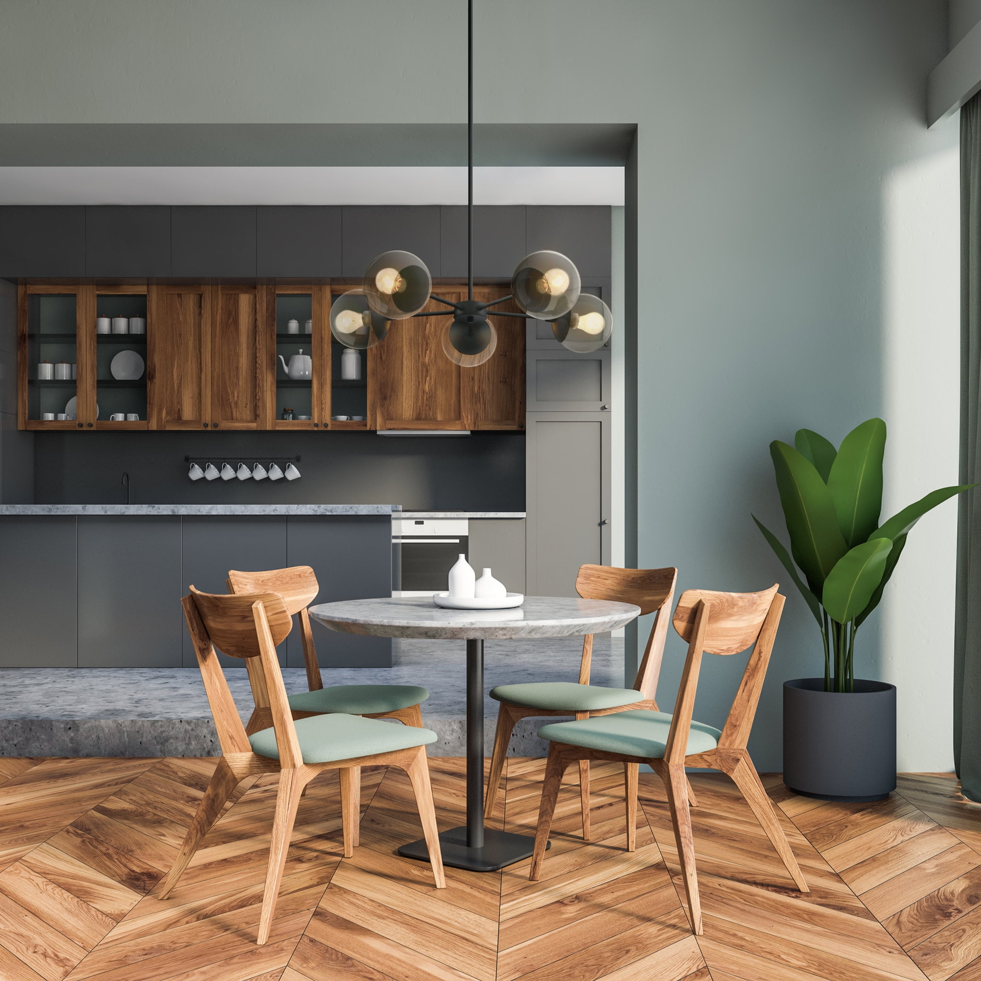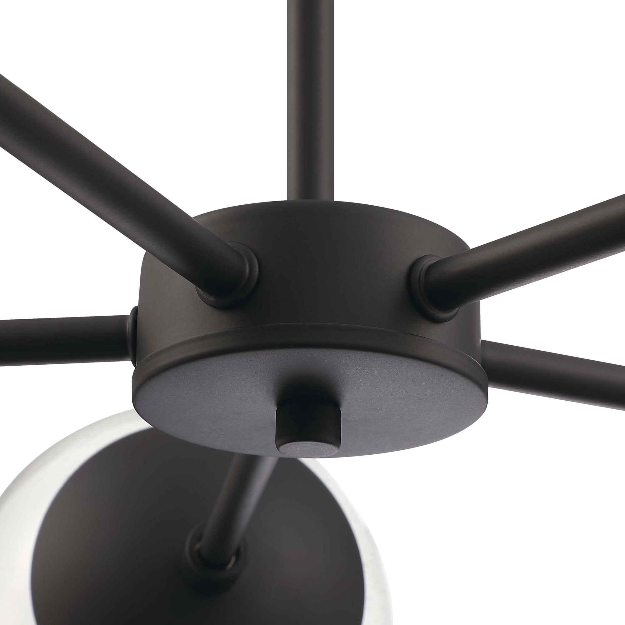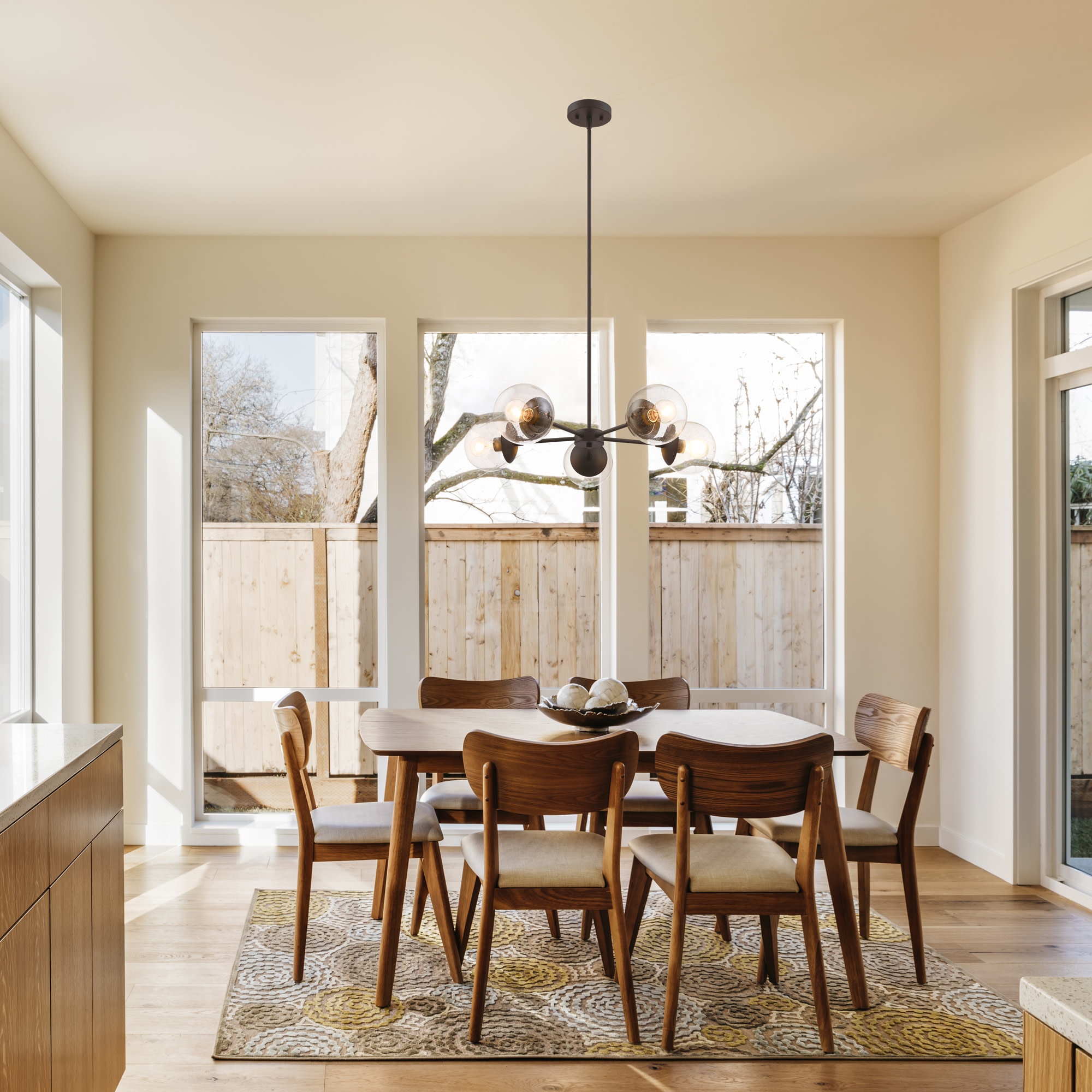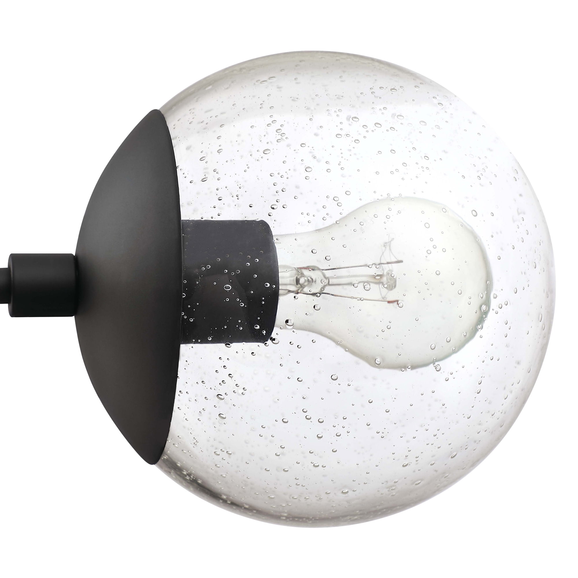 IDEAL FOR kitchens, bedrooms, hallways, entryways, and more, this modern chandelier has a sleek matte black finish and clear, seedy glass globe shades DIMENSIONS: 42.71 inches H x 29.36 inches W x 29.36 inches D USES (5) 60W standard medium base bulb or LED equivalent (Not included) DIMMABLE: Designed to be dimmable when used with a compatible dimmer switch (not included); allowing you to adjust the preferred light brightness INCLUDES (2) 6 inch and (2) 12 inch standard adjustable rods for varied hanging heights COMPATIBLE with sloped ceilings, up to 45-degree angle ETL listed for use in dry locations 10-year limited warranty