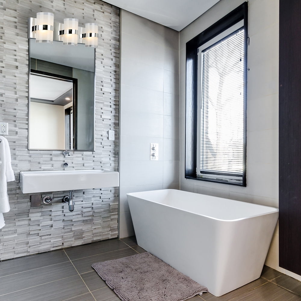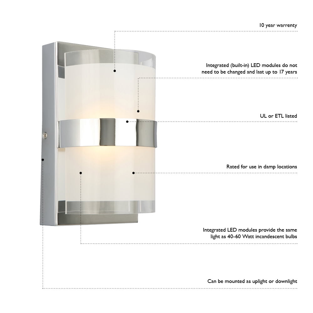 IDEAL FOR bathrooms, bedrooms, hallways, and more, this transitional wall light has a polished chrome finish with cylinder frosted acrylic and clear edged shades DIMENSIONS: 7 in. H x 24 in. L x 3.88 in. W LED LIFESPAN of 35,000 hours; Built-in 18-Watt LED; 3000K LED light offers a warm feel INTEGRATED LED light source built in, no need to replace a bulb with this fixture, Instant on, no flicker or hum This product is ETL certified for use in damp locations and comes with a 10-year limited warranty Suitable for Damp Locations: This product is ETL certified for use in damp locations