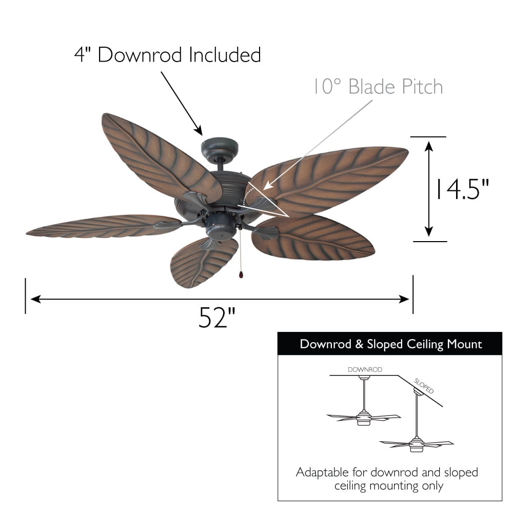 LEAF-SHAPED BLADES give your space a tropical look, the chestnut blade finish complements the rich oil rubbed bronze fan body EASILY CHANGE between three different speed settings with remote control (included) DOWNROD mount and sloped ceiling compatible IDEAL FOR USE in medium to large sized rooms, perfect for All Seasons room, patio, porch, and more FAN PERFORMANCE on High Speed Airflow: 5150 cfm; Energy Usage: 55 watts without light; Airflow efficiency: 93.6 cfm Down rod dimensions: 4 in. L x 3/4 in. diameter FAN MOTOR can run in reverse to help conserve energy costs during all seasons Universal Remote Control available (sold separately). Functions: Lights on/off, fan on/off, dimmer and 3-speed control. Part # 154288 ETL Listed for use in wet locations 10-Year limited warranty
