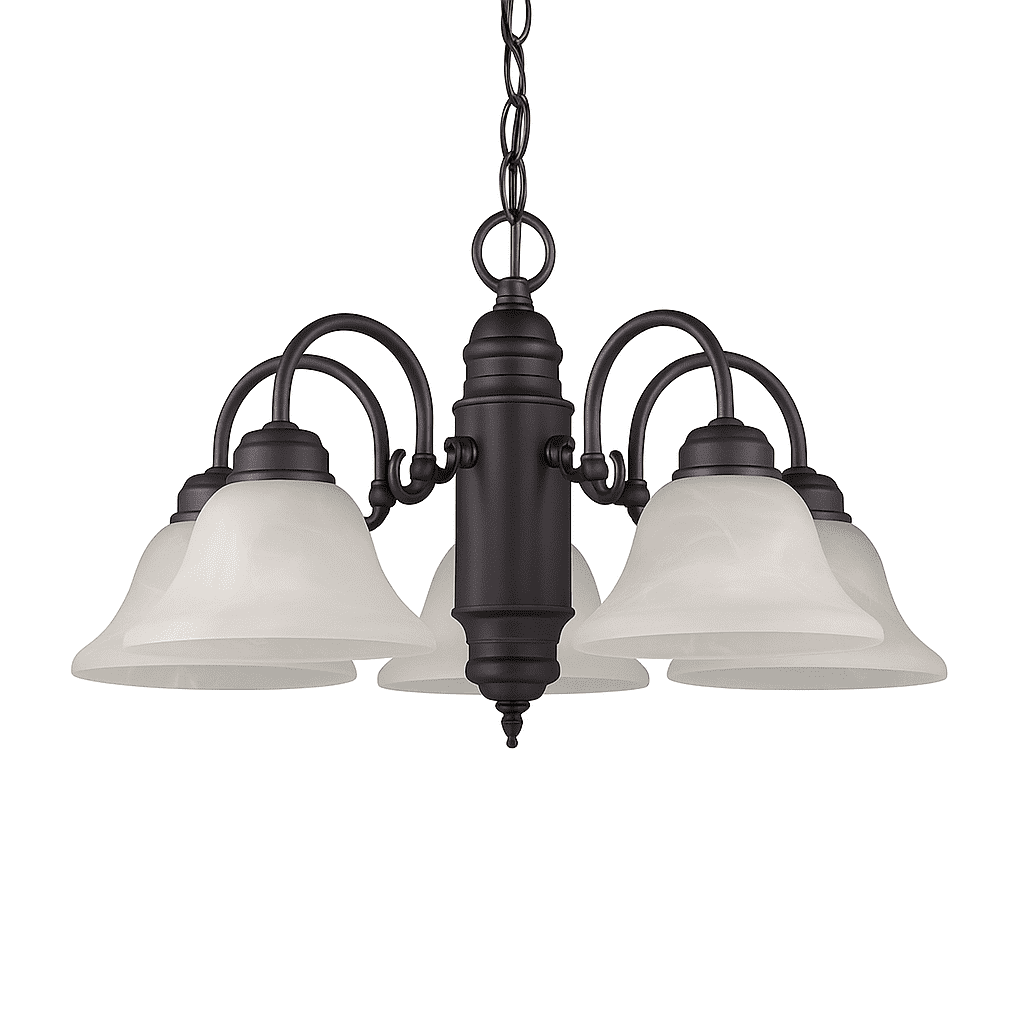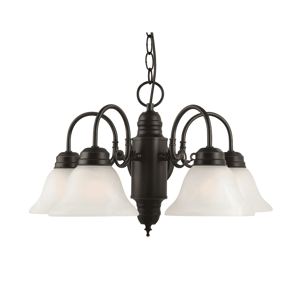 IDEAL FOR entryways, dining rooms, foyers, cafes, and more, this traditional chandelier has a rich oil rubbed bronze finish and bell-shaped alabaster glass shades DIMENSIONS: 13.5 in. H x 22 in. W Uses (5) 60 Watt Medium base bulb or LED equivalent (Not included) DIMMABLE: Designed to be dimmable when used with a compatible dimmer switch (not included); allowing you to adjust the preferred light brightness cETL/ETL listed to meet safety standards
