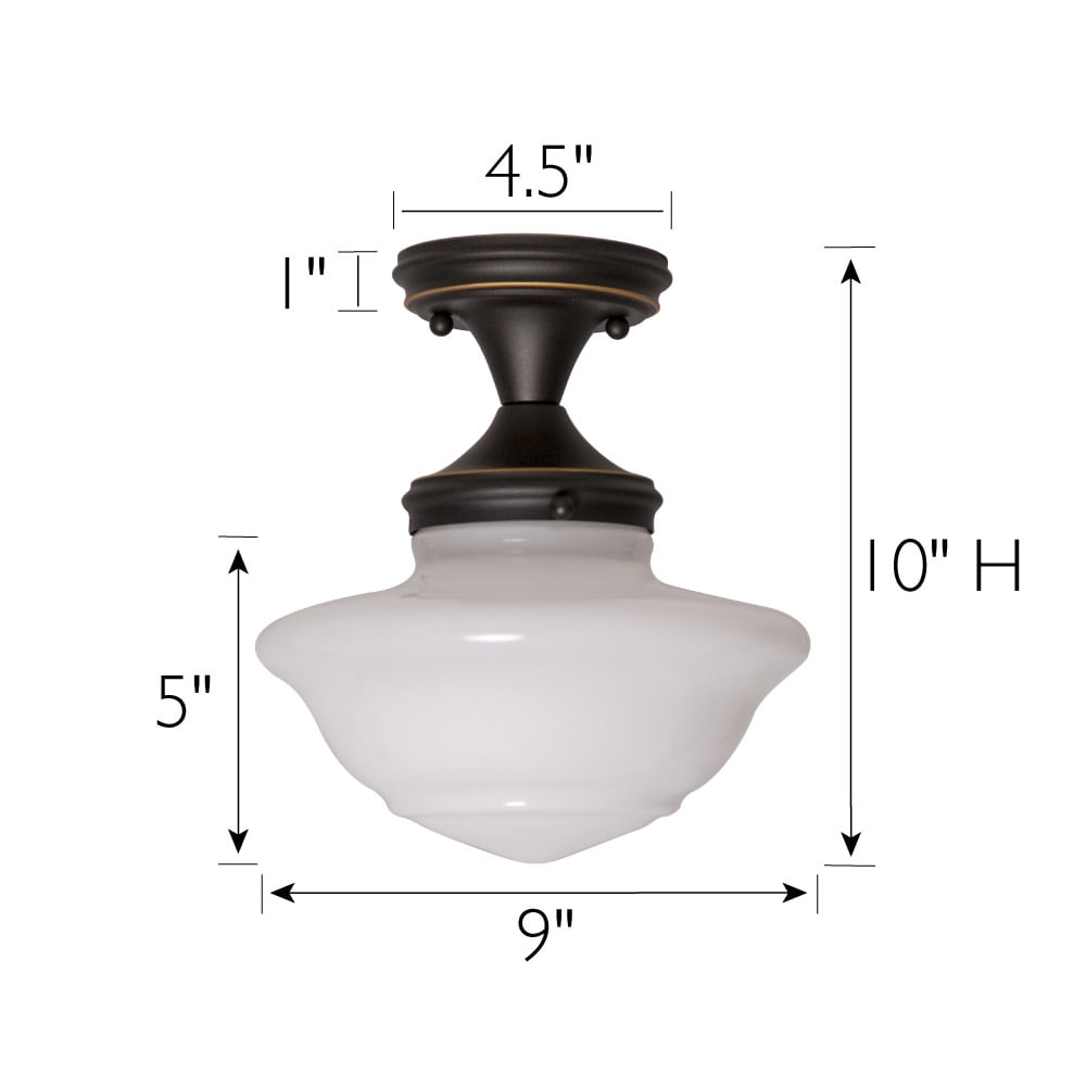 Add a vintage-inspired touch to your modern farmhouse or industrial décor with the Design House 577502 Schoolhouse Semi Flush Mount Ceiling Light. Featuring a stunning oil rubbed bronze finish and a 9-inch bell-shaped white glass shade, this fixture delivers a timeless look ideal for foyers, kitchens, hallways, dining rooms, and more. The sturdy steel construction ensures durability, while the opal glass shade diffuses the light softly for a warm, inviting ambiance. Measuring 10 inches in height and 9 inches in width, this fixture accommodates one 60-watt medium base bulb or LED equivalent (not included). Fully dimmable when paired with a compatible dimmer switch (sold separately), you can customize the brightness to suit your space. This product is ETL Listed for use in dry locations. Backed by a 10-year limited warranty, Design House offers high-quality lighting solutions for every style and budget.