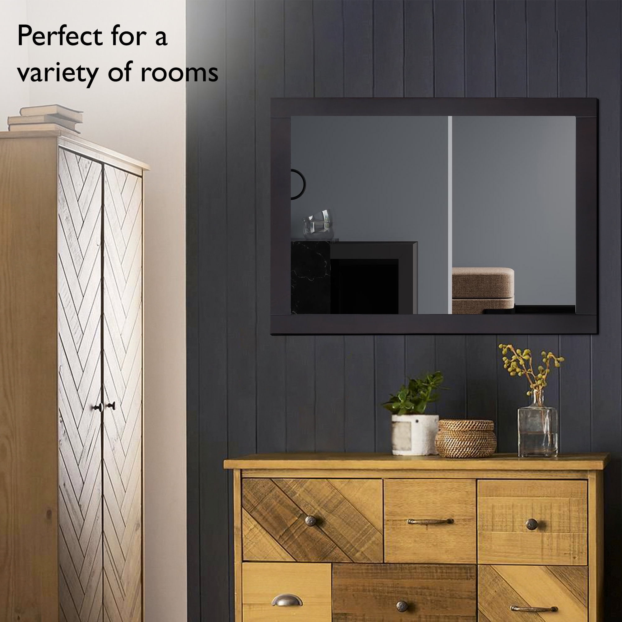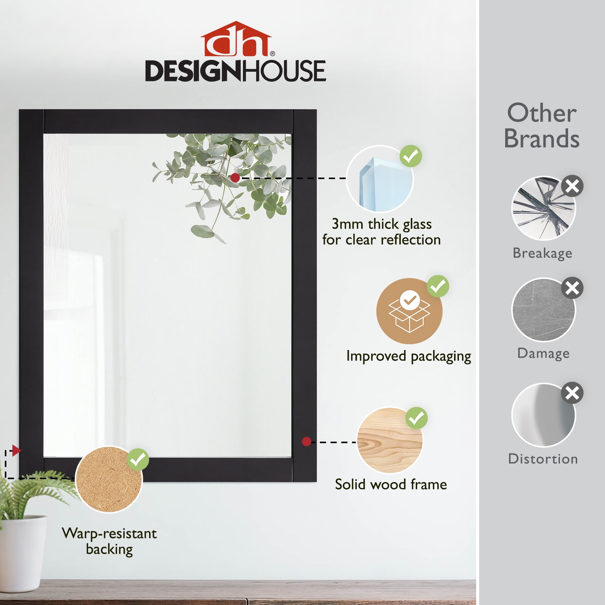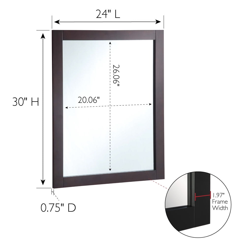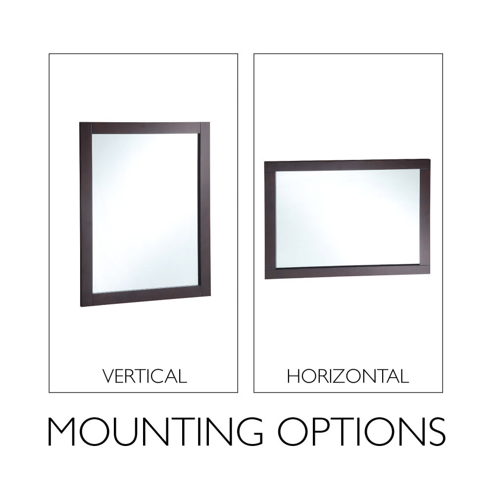The Design House Shorewood 30-Inch Rectangle Wooden Espresso Wall Mirror is the essential piece for all of your daily routines. This espresso wall mount hanging mirror is made of high quality glass and durable wood. This wall mirror’s minimalist design creates a versatile look you can use as a vanity mirror in bathrooms and bedrooms or as a decorative mirror in entryways, hallways, living rooms, office spaces, hotel rooms, and more. Measuring 30 inches by 24 inches, this traditional decorative mirror is inset within the wooden frame, providing increased depth and dimension that enhances your space. The pine wood frame with an espresso finish is perfect for farmhouse, contemporary, or traditional decor styles. This accent mirror boasts a fully functional design, which you can use to style empty wall spaces, enhance natural light, and create the illusion of more space. This Shorewood mirror includes mounting hardware for a smooth installation process. It is made of medium density fiberboard backing to be more warp resistant compared to a solid wood backing. Thoughtful packaging helps prevent damage during transit, so your mirror arrives ready to install. Ships to your home in improved packaging, ensuring your mirror gets delivered safely without damage. Customer satisfaction has been our priority for 150 years; this mirror comes with a 1-year limited warranty so you can rest assured your purchase is risk-free.