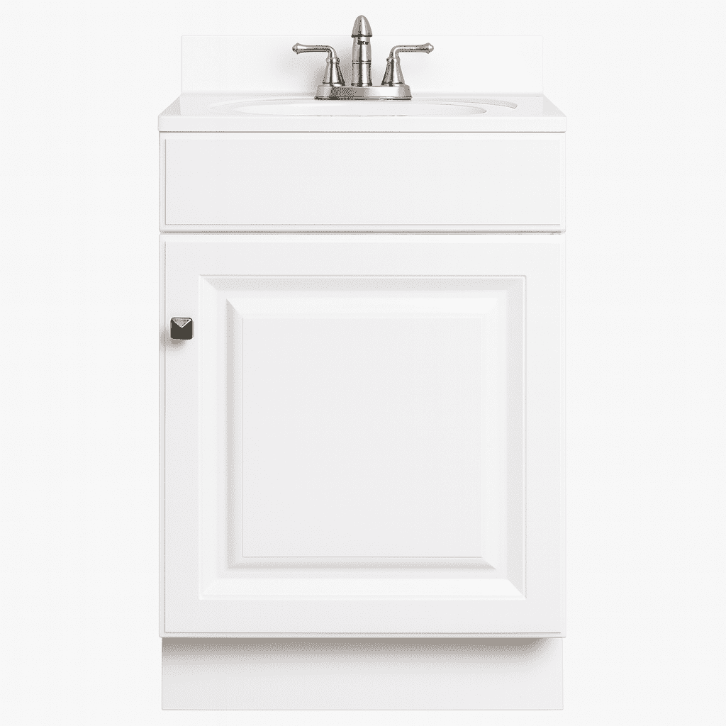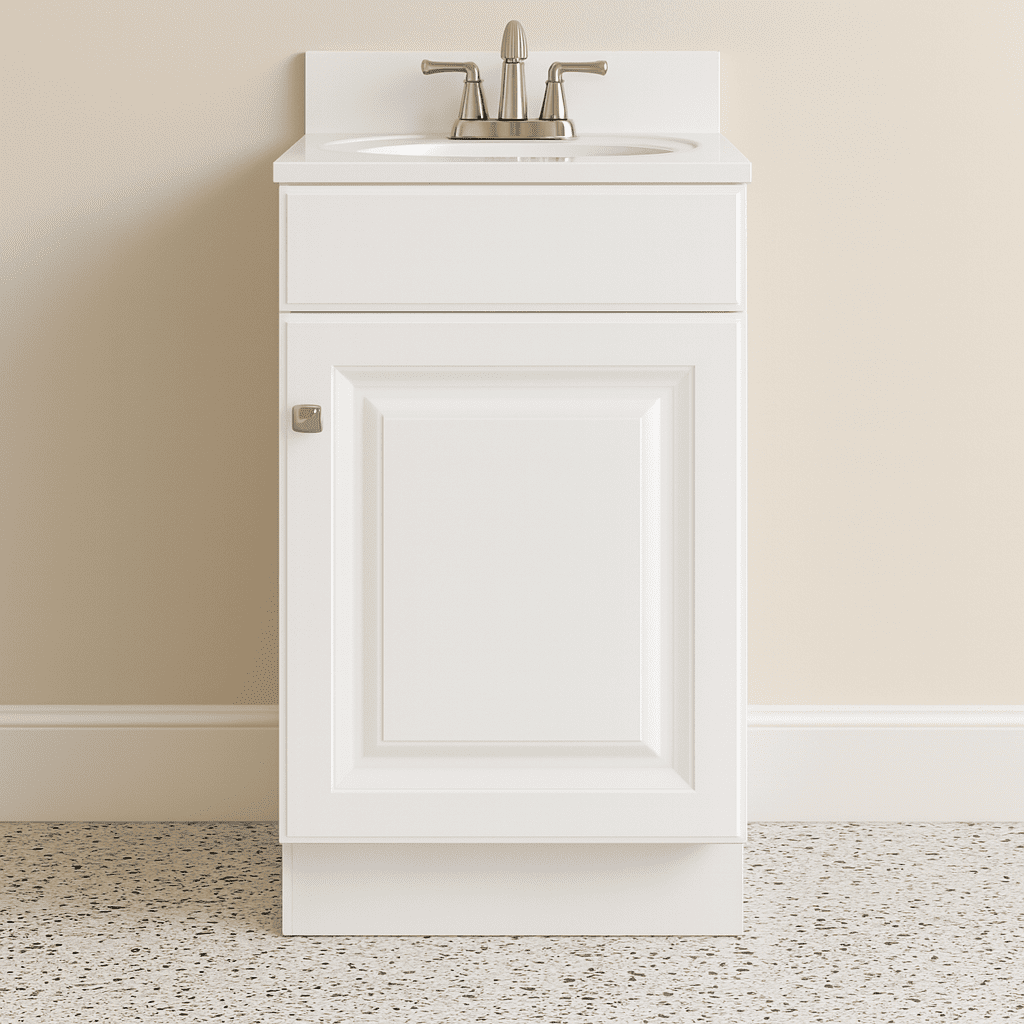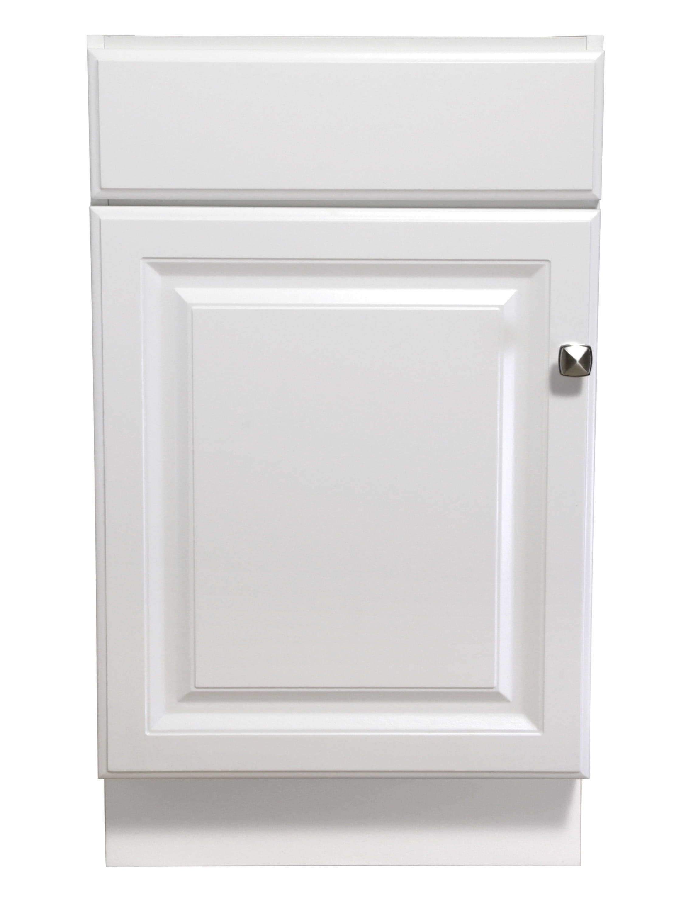 The Design House Wyndham Ready to Assemble Vanity Without Top features a durable white finish and satin nickel knob hardware. Perfect for any style home, this vanity has clean lines and concealed hinges. The 1-door construction gives you plenty of storage for toiletries to keep your countertop free of clutter. The door opens with a fluid motion, does not whine or creak, and can endure moderate stress. Measuring 18inch by 16.25inch by 31.5inch, this vanity can fit into a small bathroom. The frameless design provides ample storage and accessibility to store toiletries for the entire family. Traditional construction meshes with subtle modern details to quickly brighten up your bathroom. This product is perfect for remodeling your bathroom and matches granite countertops and colored walls.