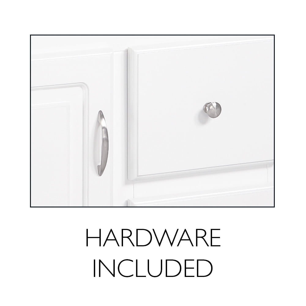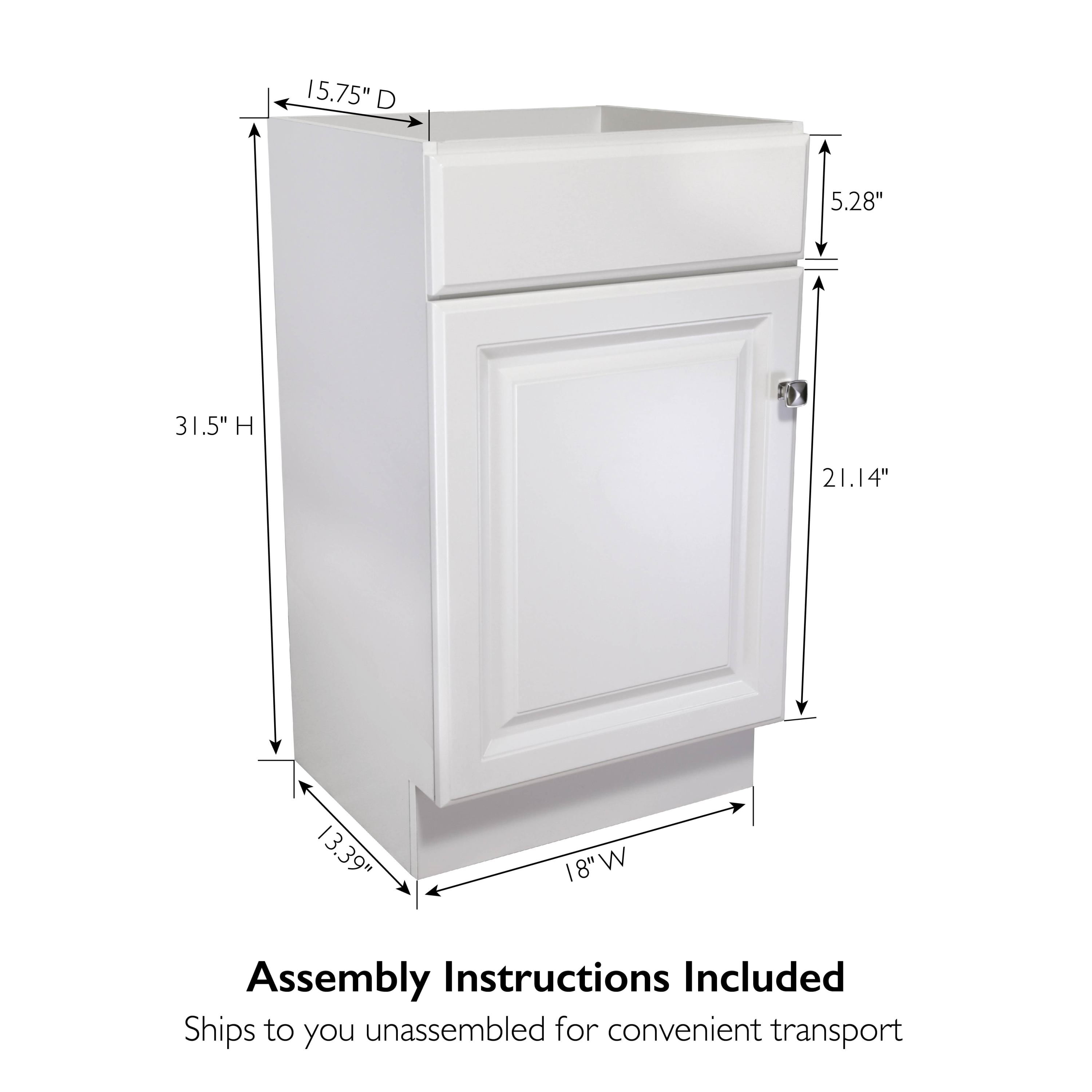 18 in. W x 16 in. D x 31.5 in. H; holds standard countertop materials including quartz and granite Plenty of storage for toiletries to keep your countertop free of clutter Clean lines and concealed hinges Ready to Assemble; Vanity Top sold separately Touch-Up Repair Kit available (sold separately). Kit contains 1 marker, 1 fill stick, and 1 tool – plastic scrapper. Part # 921387-WH 1-Year limited warranty