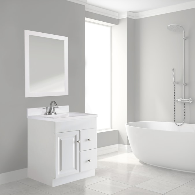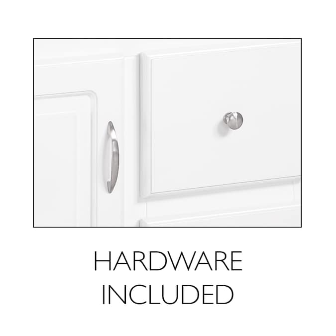 The Design House Wyndham Unassembled Vanity Without Top features a durable white finish and satin nickel knob hardware. Perfect for any style home, this vanity has clean lines and concealed hinges. The 1-door, 2-drawer construction gives you plenty of storage for toiletries to keep your countertop free of clutter. Measuring 24inch by 21inch by 31.5inch, this vanity fits in small bathrooms while providing ample storage space. Modern construction meshes with subtle vintage details for an elegant addition to your bathroom. This product is perfect for remodeling your bathroom and matches granite countertops and colored walls.