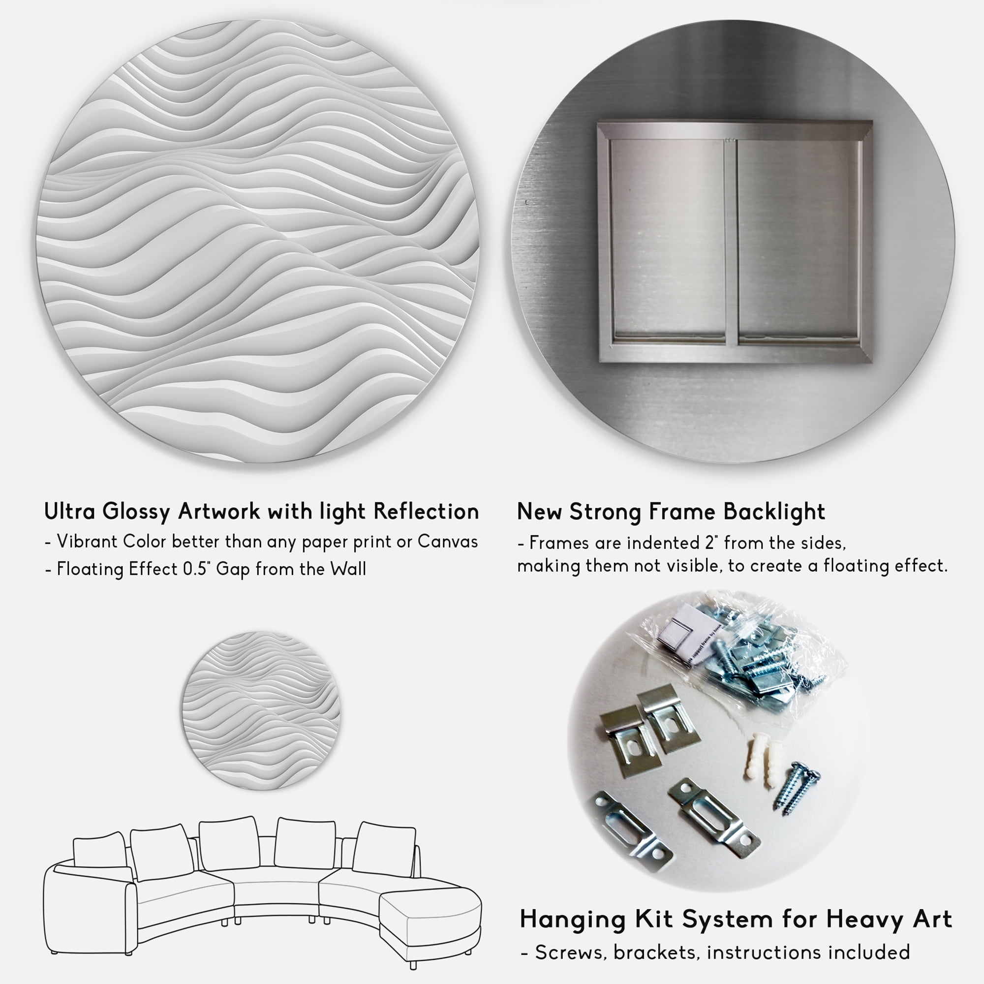 White Gloss Coating ensures colors are extra vibrant with light reflection 1-inch mounting frame gives the illusion of artwork floating on the wall Mounting brackets and instructions are included Water, fire, and scratch resistant HD aluminum panels Easy to clean with a microfiber cloth