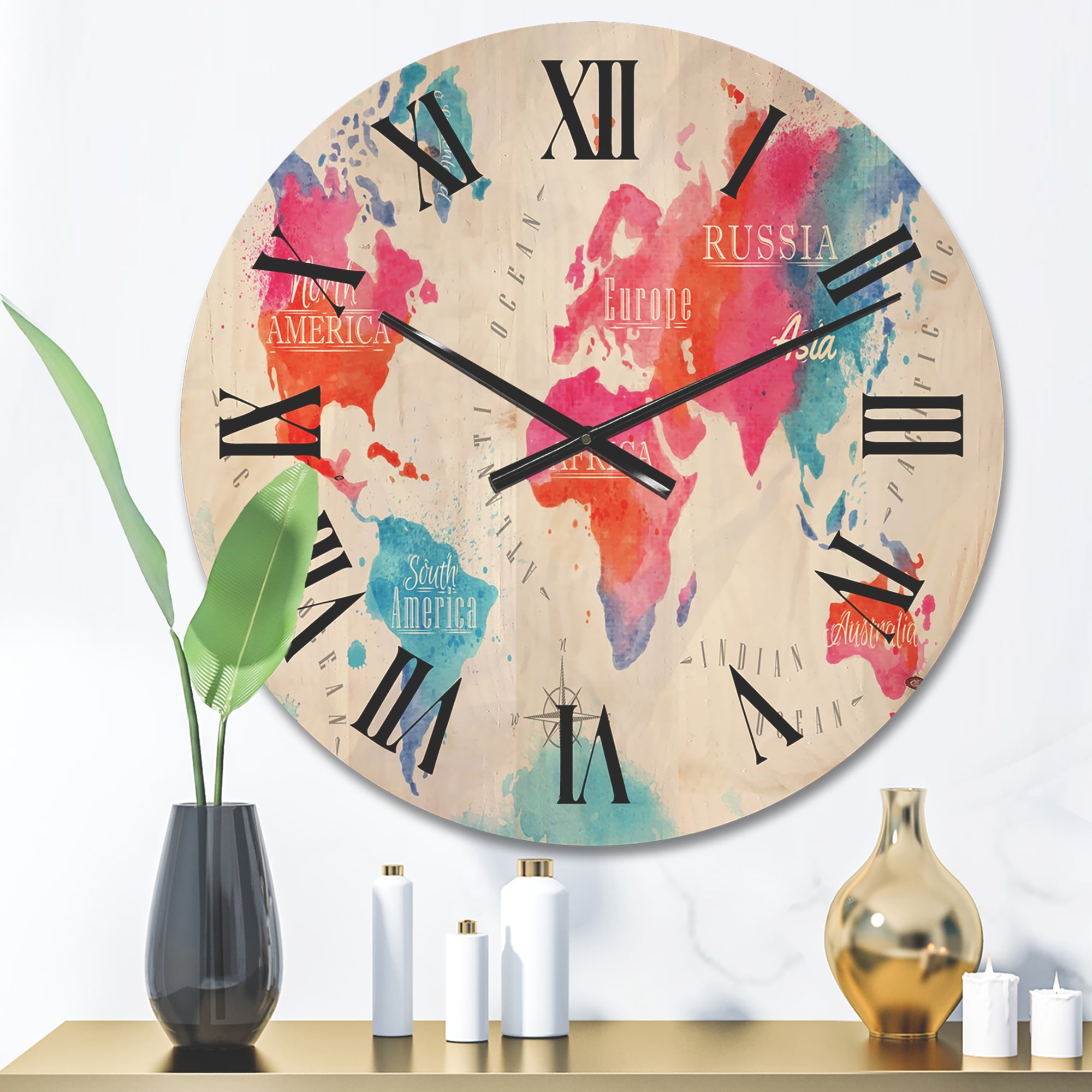 This original Modern round wood wall clock fits in both in rustic decors as well as contemporary spaces. The woodgrain detailing surfaces slightly through the colors of the design, adding to authentic wood character of your artwork wood clock. The World Map In Blue and Pink fine art is directly printed on the wood using superior quality 6 Color UV ink, providing an impressive and unique design for your office or home in modern as well as traditional interiors. The natural grain varieties of each panel of wood creates a truly original round wall clock making it the focal point of every room. Features – Style: Modern & Contemporary Type: Wood Wall Art, Fine Art, Wood Fine Art, Print on Plaque – Using the highest quality ink which will not fade over time. – Arrives ready to hang on the wall with hanging kit included – Material: Made with 100% natural pine wood. – Number of Pieces: 1 – Size: Medium, Large, Small – Color: Pink – Country of Origin: Canada – “AA” battery included with your order. – Easy to hang. See Options drop down for available sizes.