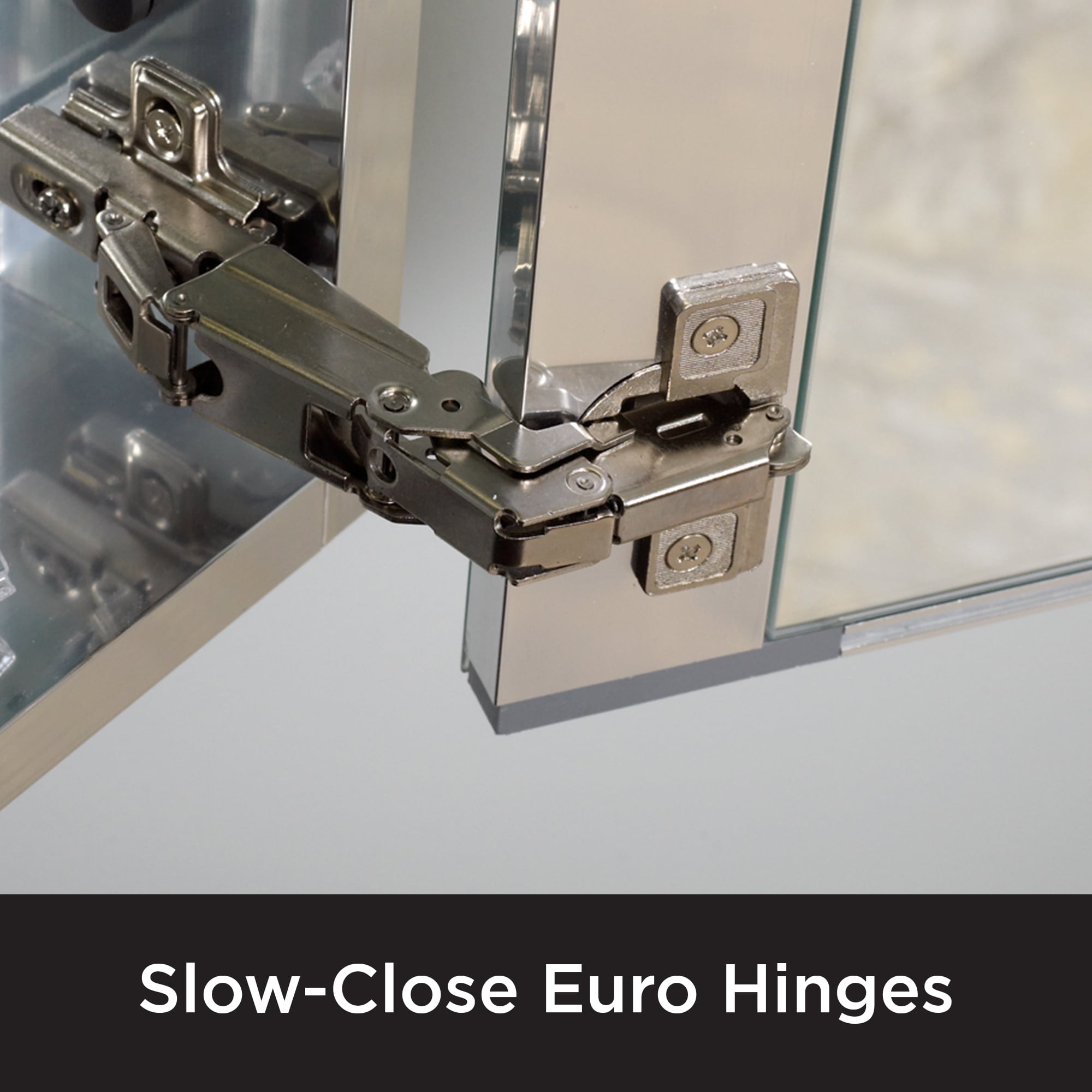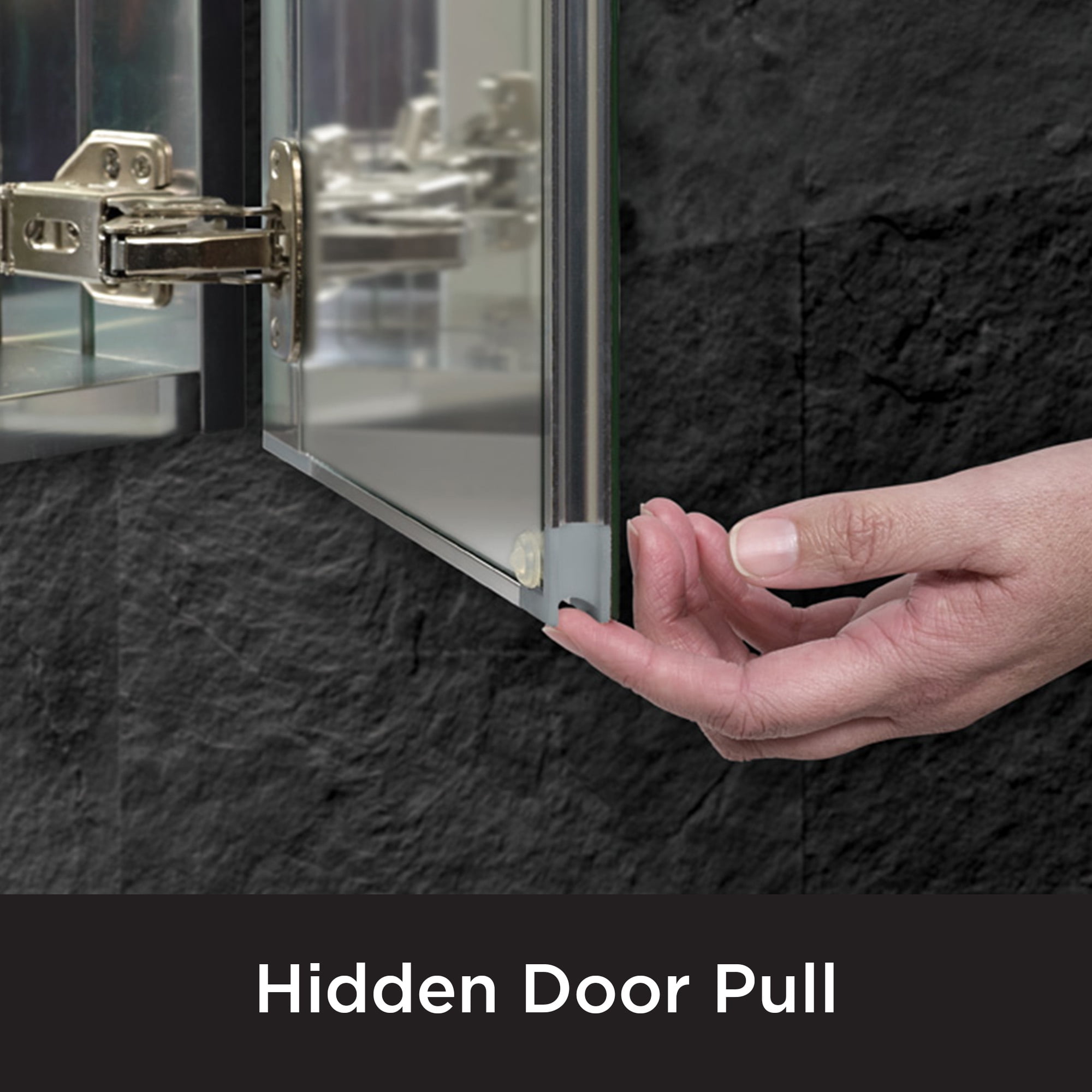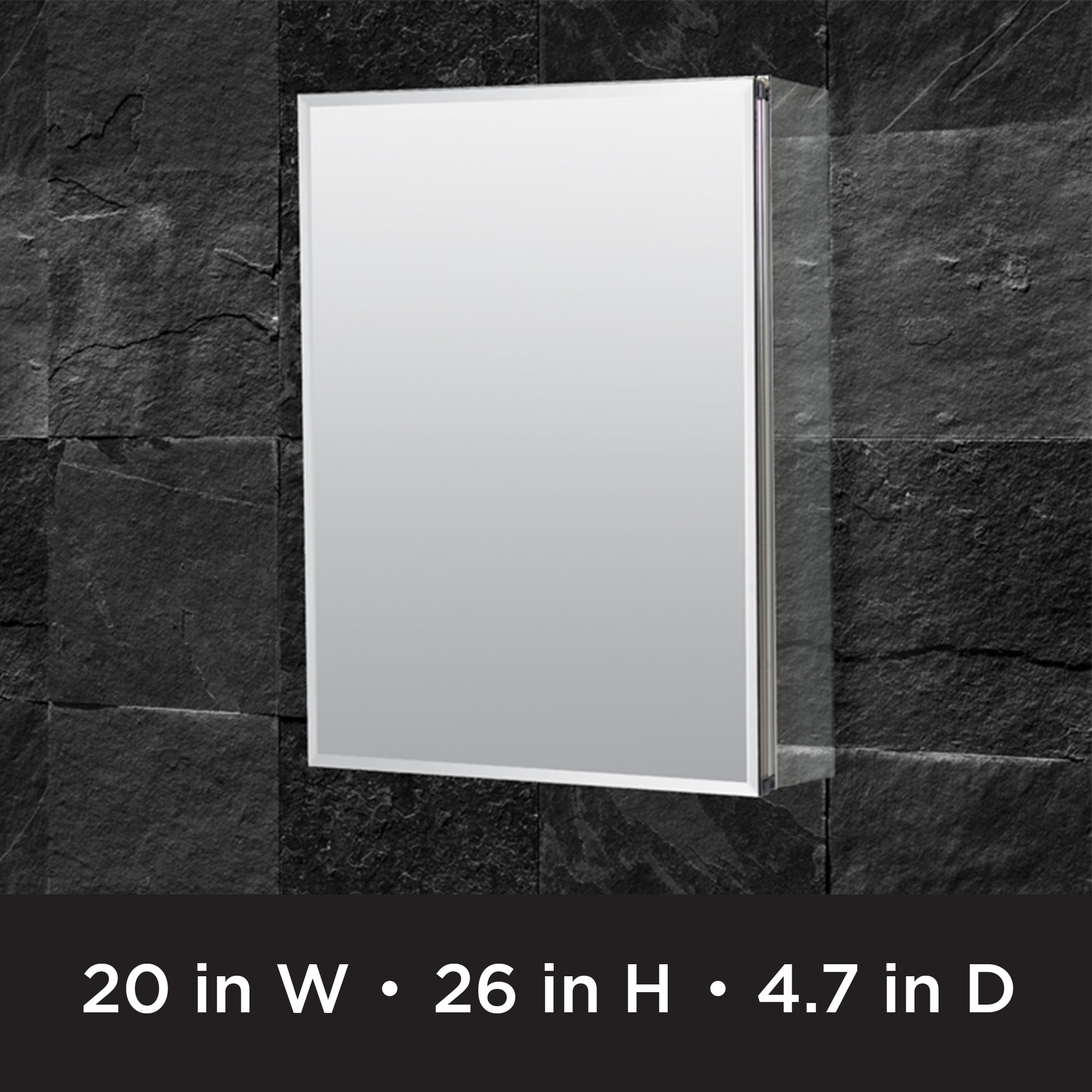 Zenith medicine cabinet with rustproof aluminum construction: Expect long-lasting rust-free use in your bathroom or powder room Bathroom medicine cabinet features mirrored sides and interior, and has 3 adjustable shelves for customizable storage of cosmetics, medicine bottles and other personal belongings 20 in. x 26 in. mirrored door opens 170 degrees Choose which side the door opens during installation Hidden door pulls make it easy to open and close door with no fingerprint smudges on cabinet mirror Frameless medicine cabinet upgrades the look your bathroom and complements your current furniture and décor Recess-mount installation allows cabinet to fit snug inside your wall (recommended minimum rough wall opening size is 19.25 in. W x 25.25 in. H); or choose easy surface-mount installation