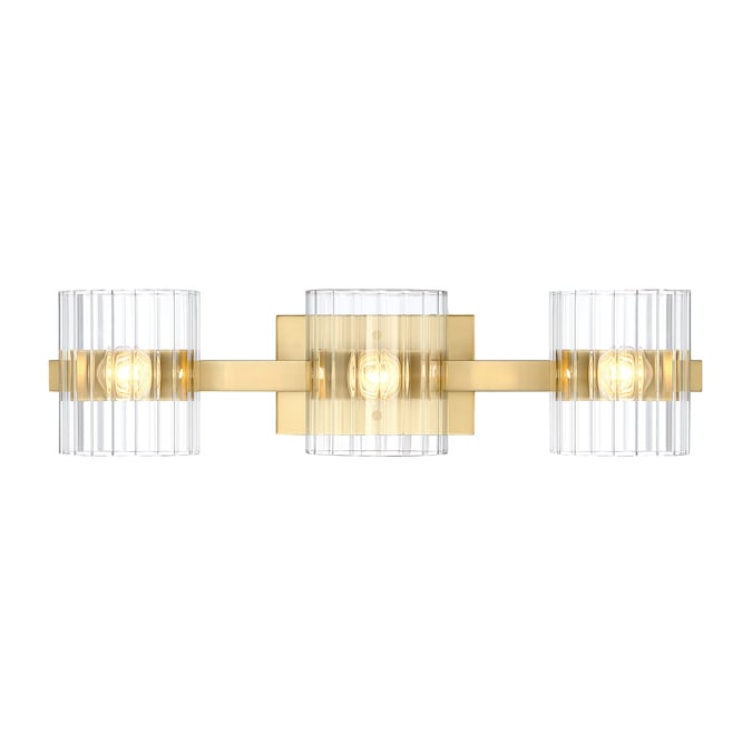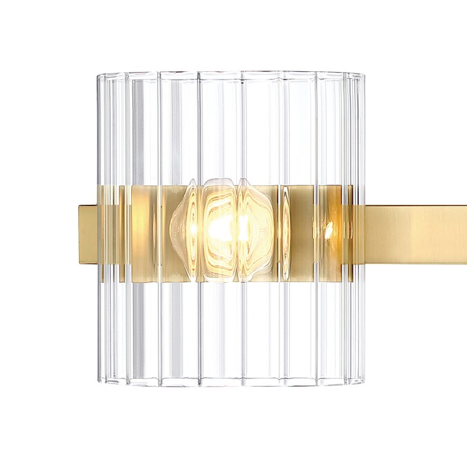 - Transitional vanity in Brushed Gold with Ribbed Glass shades