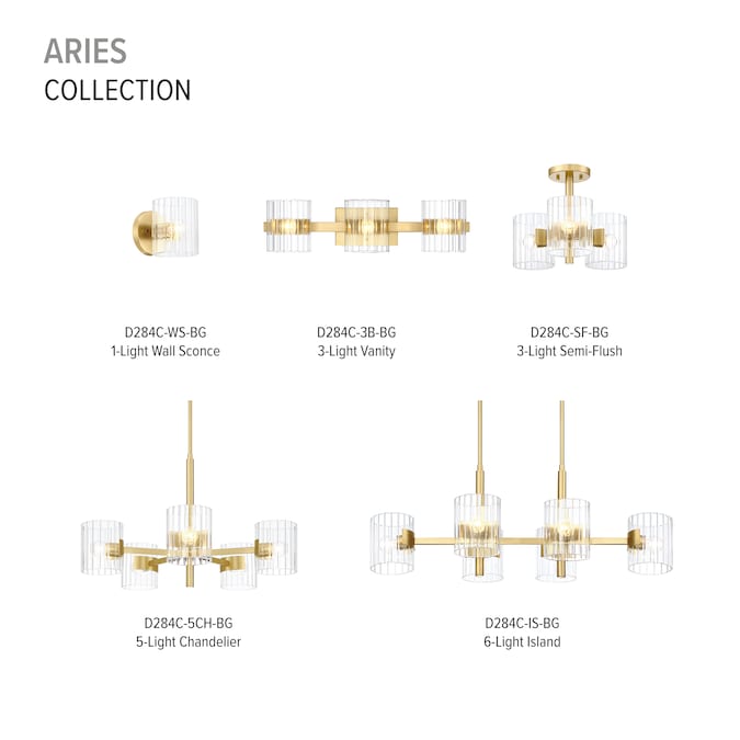 With a modern glam aesthetic, the Aries collection from Designers Fountain is a beautiful reminder of old Hollywood. The warm and luxurious brushed gold finish is accented by clear ribbed glass shades that create interesting lighting patterns. Aries features a wide variety of fixtures, so you’ll be sure find that perfect solution for any room in your home.