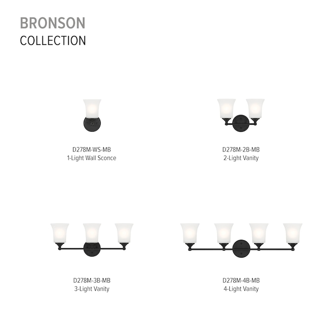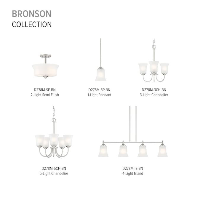With simple elements and flared Frosted Glass shades, Bronson is a Transitional collection that blends Traditional and Modern styling. It’s available in either Matte Black or Brushed Nickel, and a wide variety of fixture types to suit all of your lighting needs. Made from durable steel for years of enjoyment and illumination.