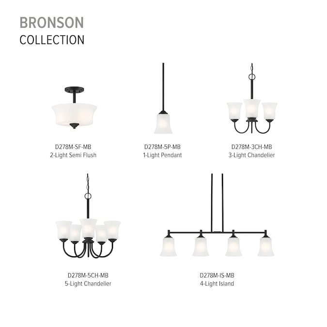 With simple elements and flared Frosted Glass shades, Bronson is a Transitional collection that blends Traditional and Modern styling. It’s available in either Matte Black or Brushed Nickel, and a wide variety of fixture types to suit all of your lighting needs. Made from durable steel for years of enjoyment and illumination.