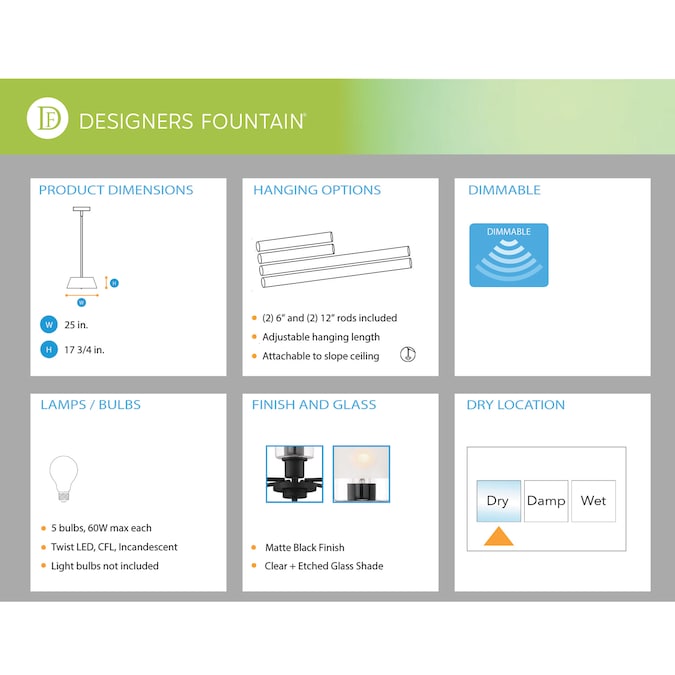 - Requires (5) medium based light bulbs – 60-Watts or less each (not included)