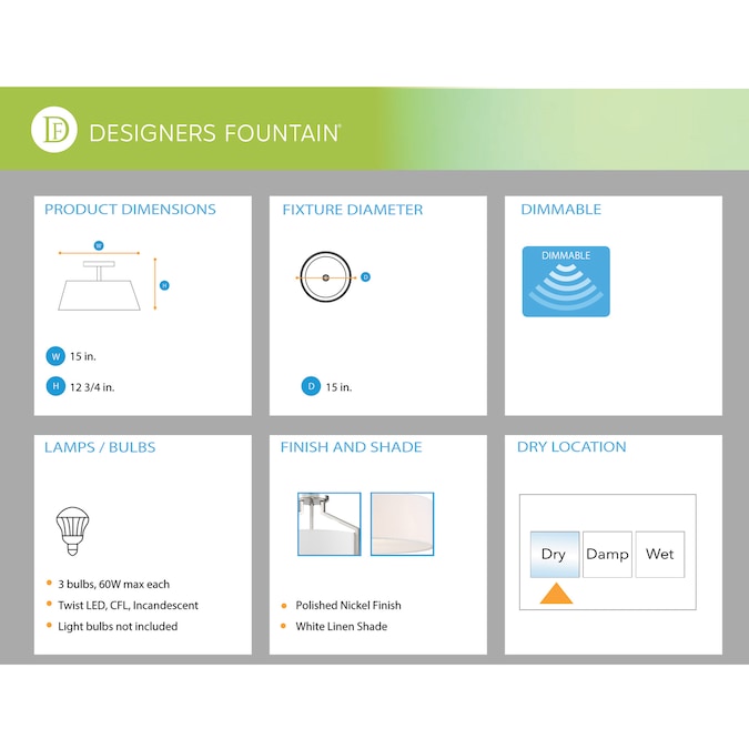- (3) 60-Watt Medium Bulbs Required (Not Included)