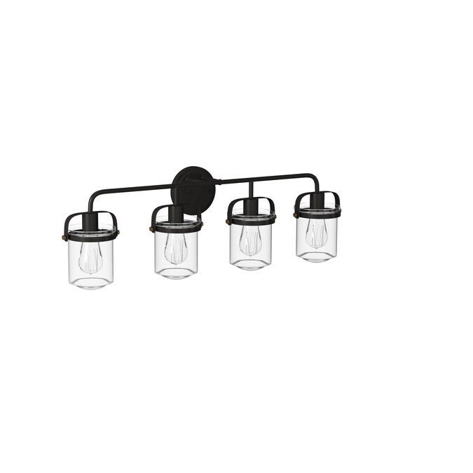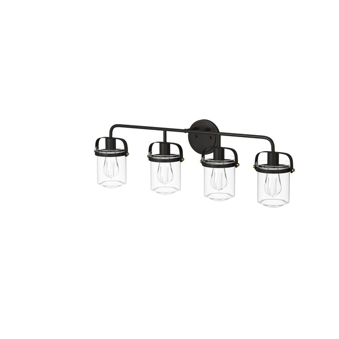 With its robust metal frame, old satin brass accents, vintage bronze finish, and clear glass shade, Jaxon’s simple yet refined design blends classical and industrial elements together to bring a unique aesthetic to any space. This sophisticated 4-light fixture offers both versatility and style to your bathroom, and is composed of durable steel for reliable, long-lasting style in your home.