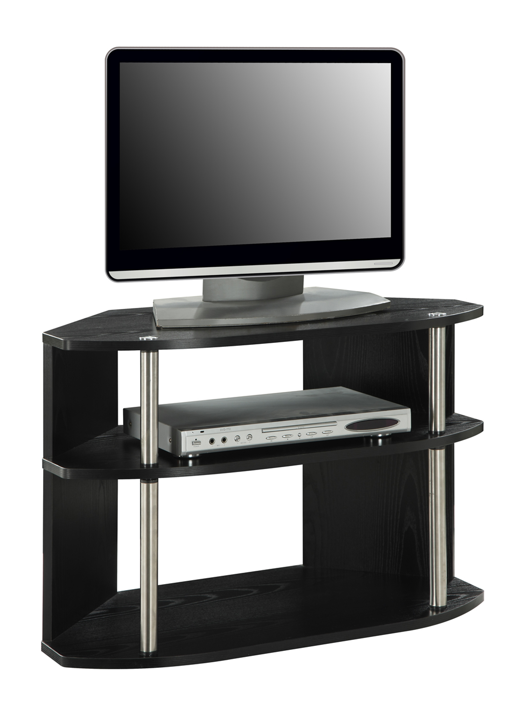 Designs2Go Swivel Black TV Stand for TVs up to 32″: The Convenience Concepts Designs2Go Swivel TV Stand is here to make your life easier. With the 180-degree swivel feature, you can easily turn the TV Stand to face in any direction you are in so that you will never have to miss another minute of your favorite TV Show or miss a second of the game This modern TV Stand is made of particle board and finished with a rich woodgrain melamine veneer, plastic, and stainless steel poles The Designs2Go Swivel TV Stand is also able to hold a TV up to 32 inches and has a maximum weight capacity of 80 pounds Two large shelves offer plenty of space for storage and with the open concept you do not have to worry about cable management Available in multiple finishes, you are able to match any new or existing décor See all TV stands on . Save money. Live better. Televisions sold separately. See all televisions.