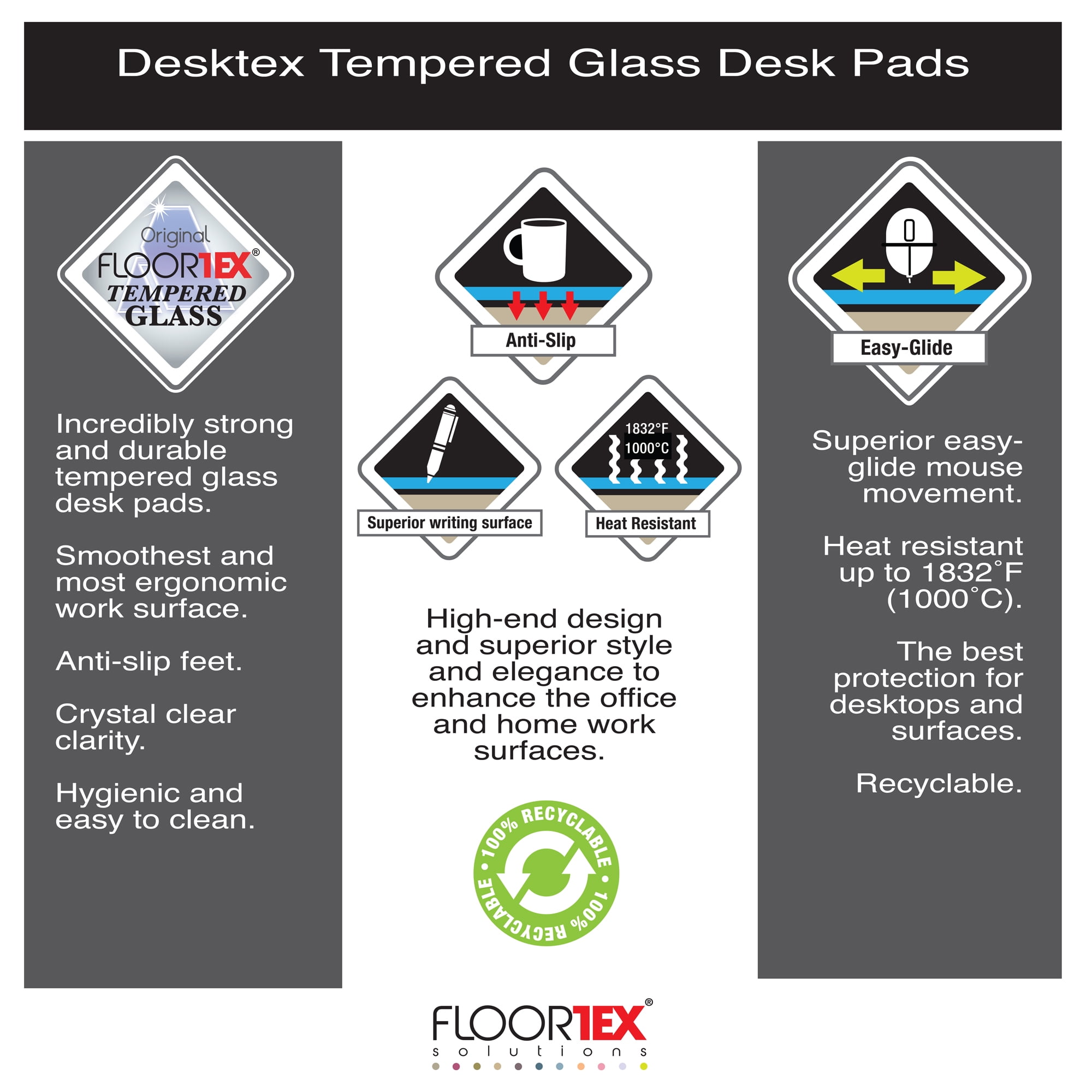The Desktex Glaciermat is manufactured from tempered glass for the ultimate in protection, elegance and style Protects from scratches, scuffs and spills and heat resistant to 1800°F Crystal clear. Ideal for viewing notes, lists or photographs safely stored under the mat surface Use as a handy scribble pad with dry erase pens (not included) for everyday notes and reminders Complete with silicone feet for added stability Rectangular with rounded corners – 19” x 24”. 1 Year Limited Warranty. FCDE1924G. 9.70 lb Weight.