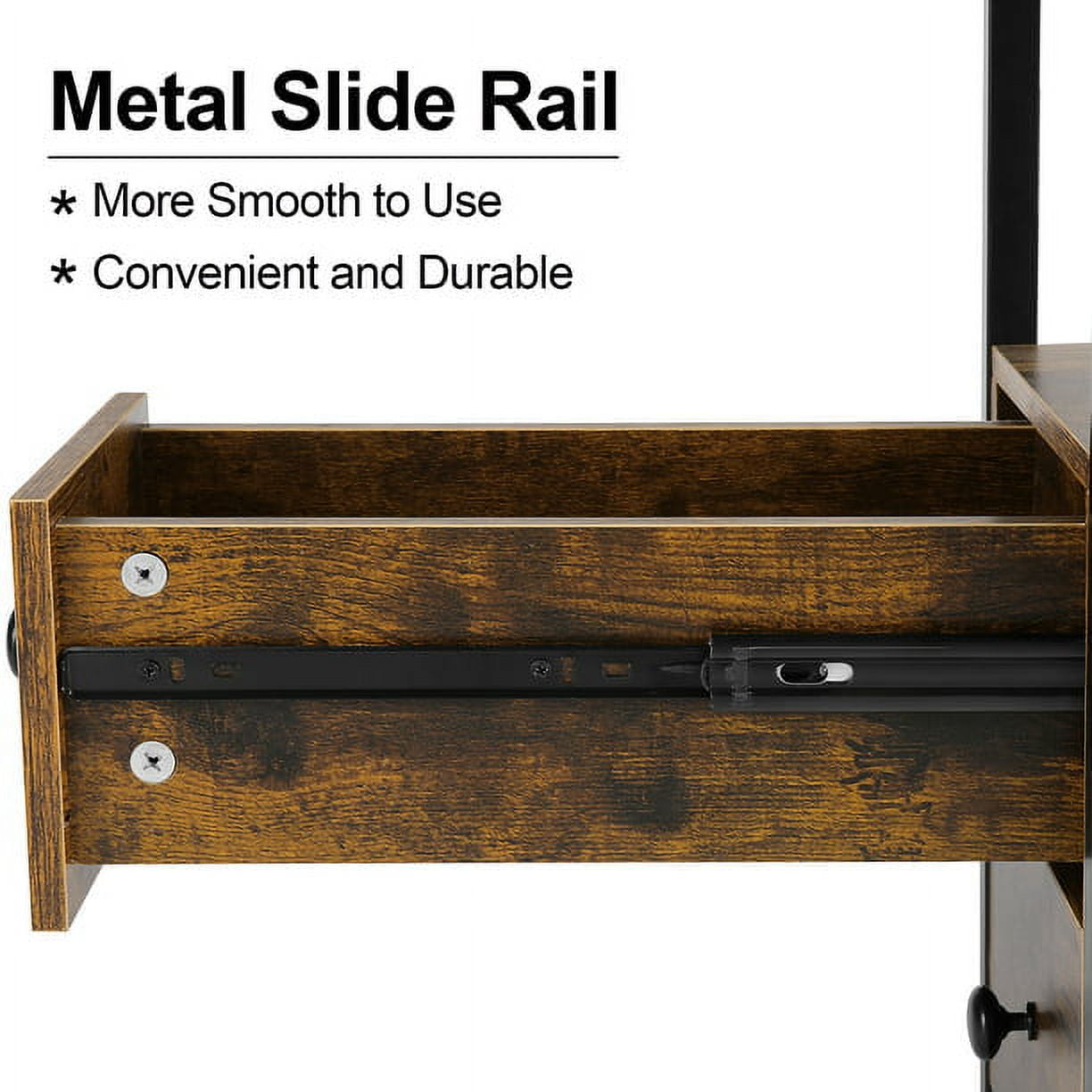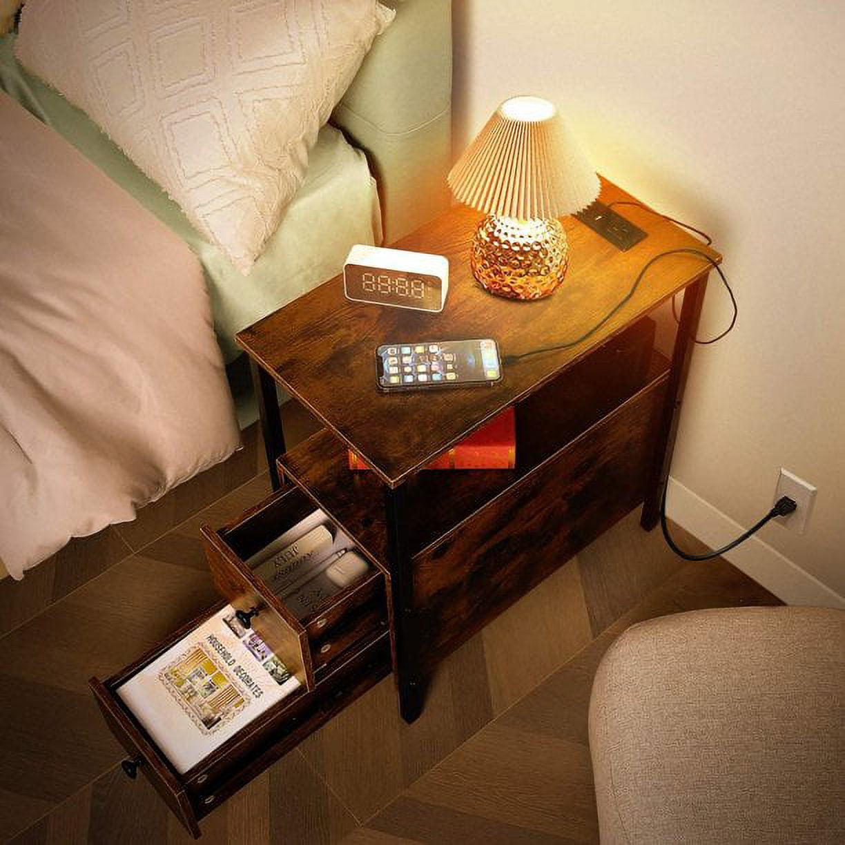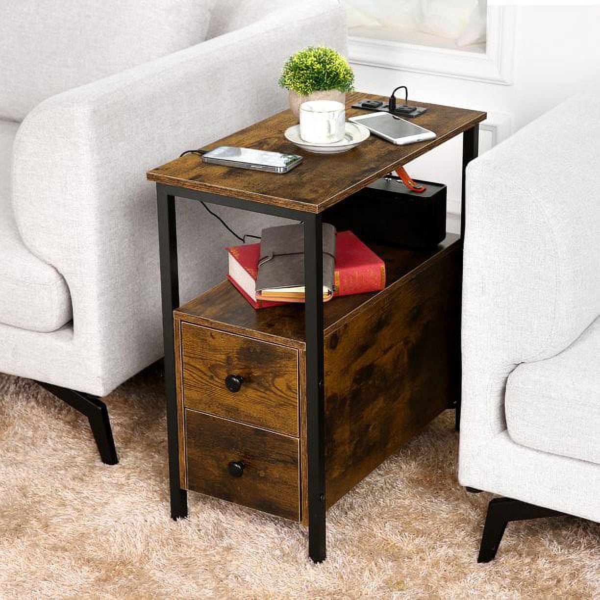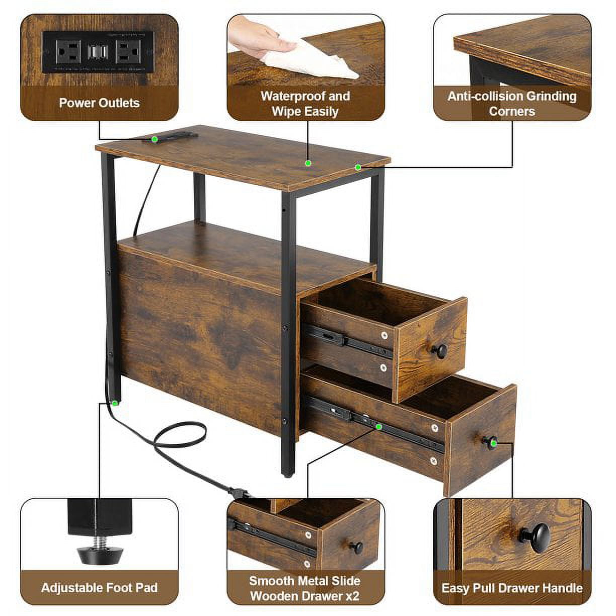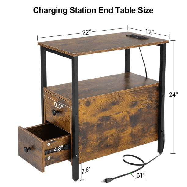 High Lights: Hassle-free assembly includes clear instructions A load capacity of 44 lbs for the tabletop and 22 lbs for each drawer 2 standard plug outlets and 2 USB ports for convenient charging of devices Equipped with 4 anti-slip adjustable foot pads to protect floors and ensure balanced Waterproof wood surface for easy cleaning and anti-collision grinding corners for child safety Multifunction End Table with Charging Station Sofa Side Table with 2 Standard Plug Qutlets & 2 USB Ports which can easily charge your phone, tablet, desk lamp, or laptop, 5.1ft long power supply cord, Don’t worry about staying away from the power source. Ample Storage Capacity With 2 spacious drawers and an open shelf, this side table provides plenty of storage and display space, allowing you to keep your essentials organized and within reach. Sturdy and Durable Materials Constructed with a robust metal frame that supports up to 44 lbs on the tabletop and 22 lbs in each drawer, this end table is not only stylish but also built to last. Eco-Friendly and Safe The industrial-style design incorporates eco-friendly wood and features anti-collision grinding corners for child safety, while the waterproof wood surface makes cleaning a breeze. Easy Assembly and Versatile Use Designed for hassle-free assembly with clear instructions and accessible tools, the compact size of 22″ L x 12″ W x 24″ H makes this side table an excellent choice for small spaces, ensuring stability with 4 anti-slip adjustable foot pads. Specifications: Color: Brown Desktop Weight: 44lb Drawer Weight: 22lb Dimensions: 22″ L x 12″ W x 24″ H Power Cord Length: 5.1in Package: 1 x Side Table 1 x Tools 1 x Instruction Manual