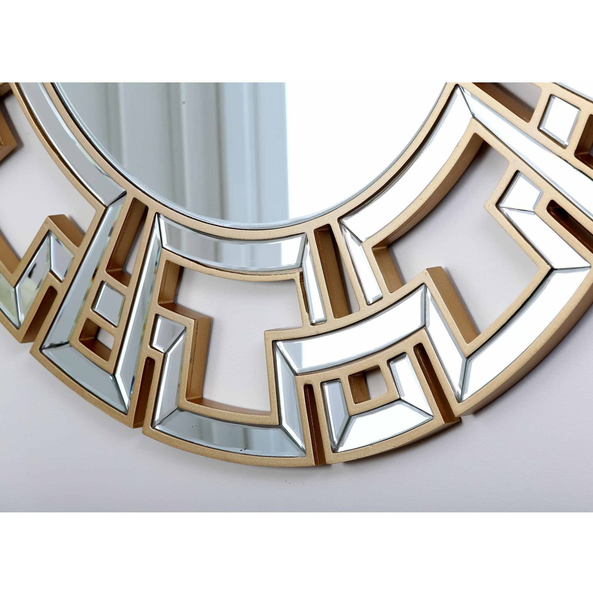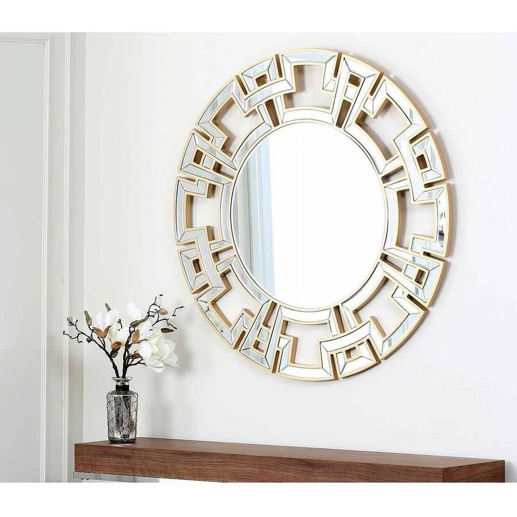 This gold wall mirror adds a contemporary feel to any room or office. Made of wood and glass, the mirror features geometric shapes that bring an attractive accent to hallways and rooms alike. This round wall mirror is painted gold, adding warmth to your decor. Place in an entryway or above a mantle to catch the attention of any guest. Reflect light to create a look of spaciousness while adding decorative beauty to your decor with this Devon and Claire round wall mirror. The frame’s mirrored surfaces, gold-colored framework and lacy geometric design combine to form a modern sunburst effect. Hang this stunning frame in an open entryway and welcome guests in luxurious style.