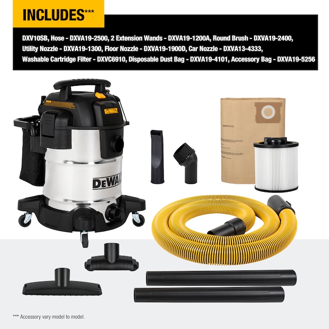 This 10 Gal.*, 5.0 HP** Stainless Steel Wet/Dry Vacuum is rugged, portable and convenient for quick jobsite cleanups. With a powerful motor for maximum performance, it delivers strong suction power for heavy-duty pickup. Use the included fine-dust cartridge filter for small, dry debris and wet materials. *Tank capacity refers to actual tank volume and does not reflect capacity available during operation.**Peak Horsepower” (PHP) is a term used in the wet/dry vacuum industry for consumer comparison purposes. It does not denote the operational horsepower of a wet/dry vacuum but rather the horsepower output of a motor, including the motor’s inertial contribution, achieved in laboratory testing. In actual use, motors do not operate at the peak horsepower shown. *Tank capacity refers to actual tank volume and does not reflect capacity available during operation.**Peak Horsepower” (PHP) is a term used in the wet/dry vacuum industry for consumer comparison purposes. It does not denote the operational horsepower of a wet/dry vacuum but rather the horsepower output of a motor, including the motor’s inertial contribution, achieved in laboratory testing. In actual use, motors do not operate at the peak horsepower shown.