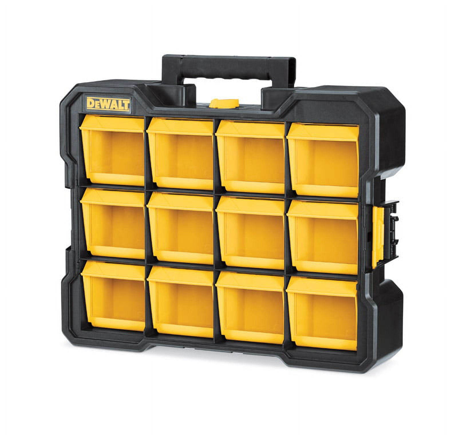 DEWALT 17.2″ L x 4.2″ W x 13.5″ H Flip Bin Storage Organizer Plastic 12 pocket Yellow 12 Removable cups Locking mechanism for all bins