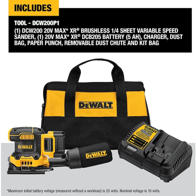 The 20V MAX XR brushless cordless 1/4 sheet variable-speed sander provides you with the power and runtime needed to get the job done. A variable-speed dial provides speed control from 8,000-14,000 OPM for a variety of applications. One-handed locking dust bag attaches securely to the sander to aid in dust collection, or the user can attach the sander directly to the DWV010 or DWV012 dust collectors. Rubber overmold grip provides comfortable sanding. The paper clamp is designed to hold paper securely and for easy installation.