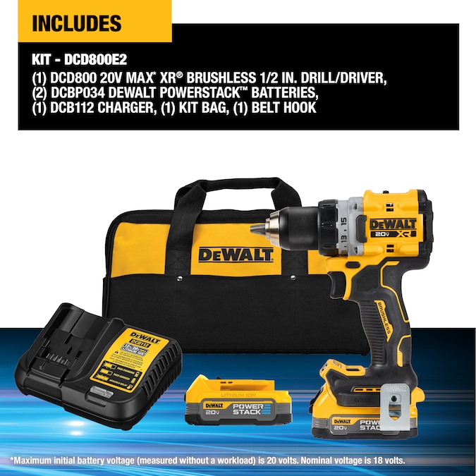 Engineered for professional-grade performance, the 20V MAX XR® Brushless 1/2-in Drill/Driver delivers the power and speed needed for heavy-duty drilling and fastening applications. The high-output brushless motor helps you tackle demanding projects with up to 40% more Unit Watts Out compared to the DEWALT DCD791B using DCBP034 DEWALT POWERSTACK™ Battery (sold separately). Complete a wide range of drilling jobs with this versatile power tool, which outputs up to 2,000 rpm when drilling into construction materials. This lightweight, well-balanced Drill/Driver was built compact to help users comfortably work in tight spaces for extended periods of time. The 3-position, pivoting LED is designed to enhance visibility in dimly lit work areas with its 3 mode settings and up to 70 Lumens of brightness. This kit includes two DCBP034 DEWALT POWERSTACK™ batteries, charger, belt hook, and kit bag.