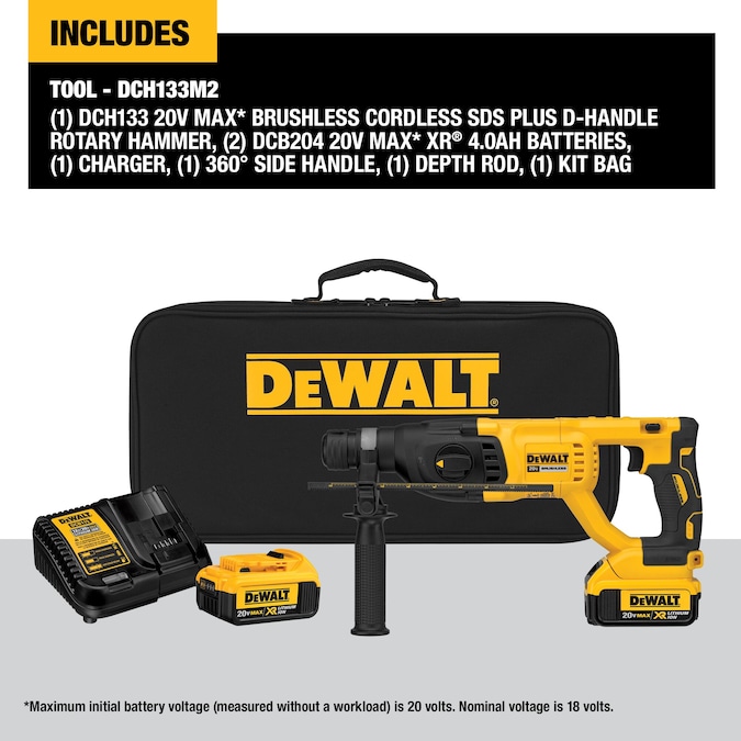 - Package Contents: Rotary Hammer, Adjustable Side Handle with Integrated Depth Stop Rod, Soft Sided Case, 4.0Ah packs, Charger