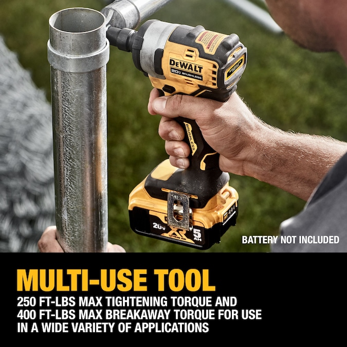 This 20V MAX* 1/2 in. Cordless Impact Wrench with Hog Ring Anvil was built for quick loosening and tightening of bolts, lug nuts, and other fasteners. The Impact Wrench delivers 250 ft-lbs of fastening torque and 400 ft-lbs of breakaway torque in a lightweight body suited for a range of applications in confined, difficult-to-access workspaces. Use the integrated LED in low-light spots for enhanced visibility as you work. Battery not included.