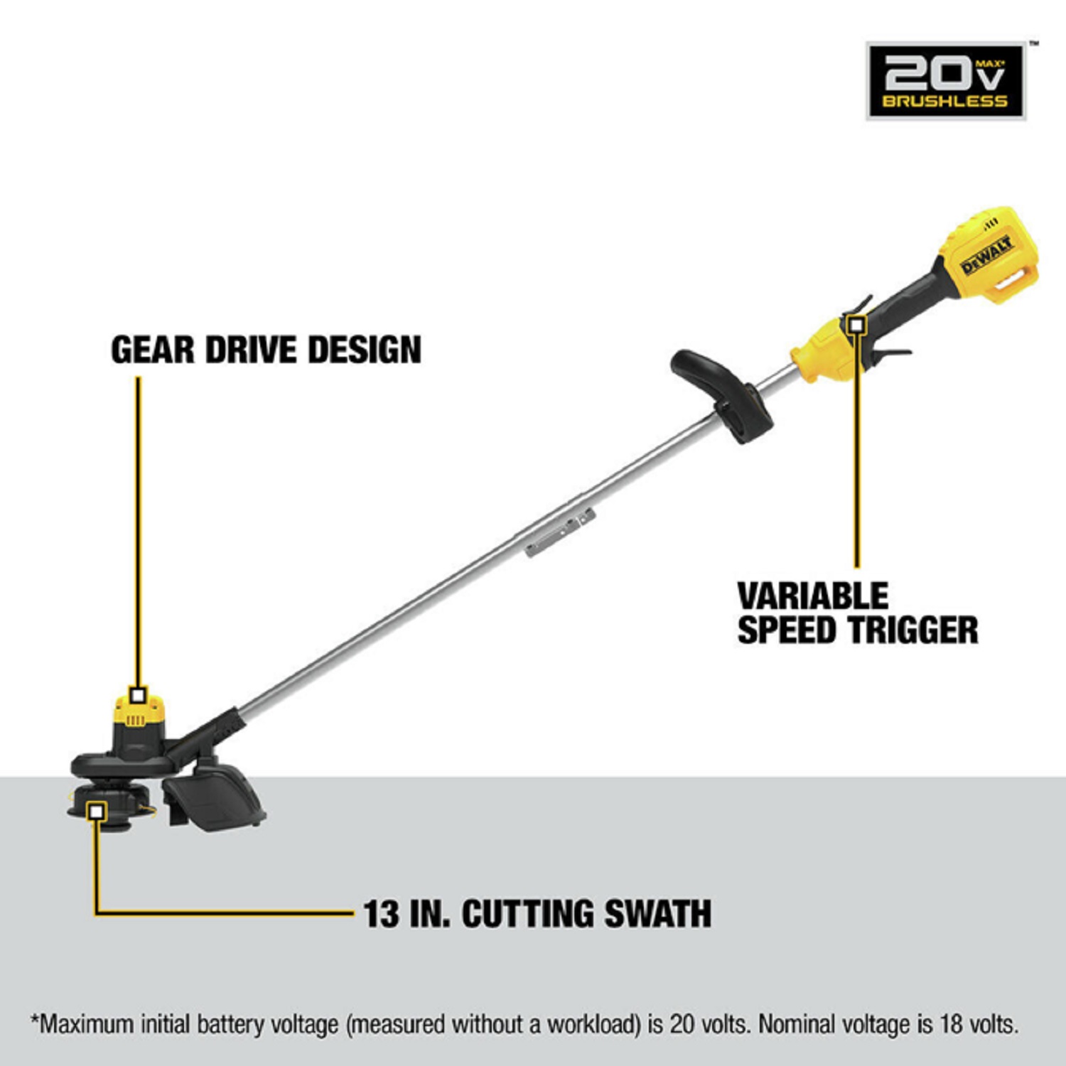 13 in. cutting swath with 0.080 in. line Gear drive transmission design that powers through overgrowth Variable-speed trigger with high/low speed control gives you added power or extended runtime Lightweight and ergonomic with a balanced design to help you move freely Part of the 20V MAX system of tools