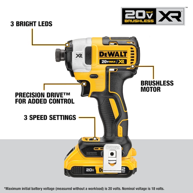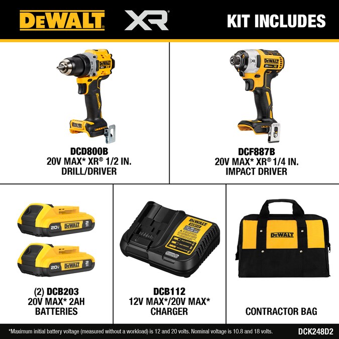 “20V MAX XR® Brushless 2-Tool Kit includes one drill/driver, impact driver, two 2Ah batteries, a charger, and kit bag. Both tools are equipped with a high-output brushless motors to help you tackle demanding projects. The DCD800 Drill/Driver is equipped with a 3-position, pivoting LED for enhanced visibility in dimly lit work areas. The DCF887 delivers up to 1,825 in-lbs of torque at only 5.3 in. front to back. Both tools are compatible with all DEWALT 20V MAX batteries.